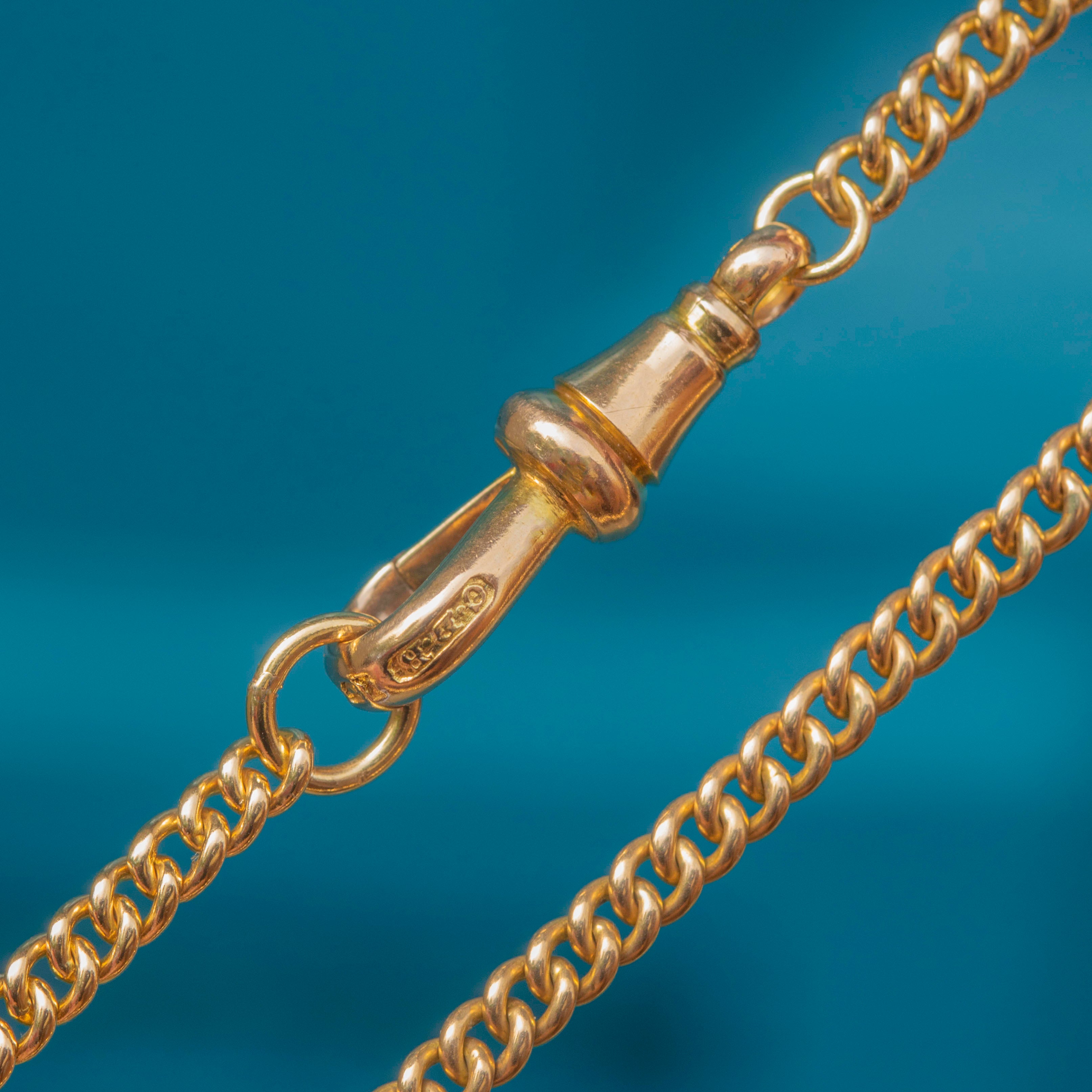 EXCELLENT: There’s little to fault with this stunning antique curb chain. Its rich, buttery 15ct Gold links are beautifully uniform and securely connected. The dog-clip fastens securely, ensuring the chain rests securely around your neck. We’re completely smitten with every inch of this antique treasure, and we’re sure you will be too!