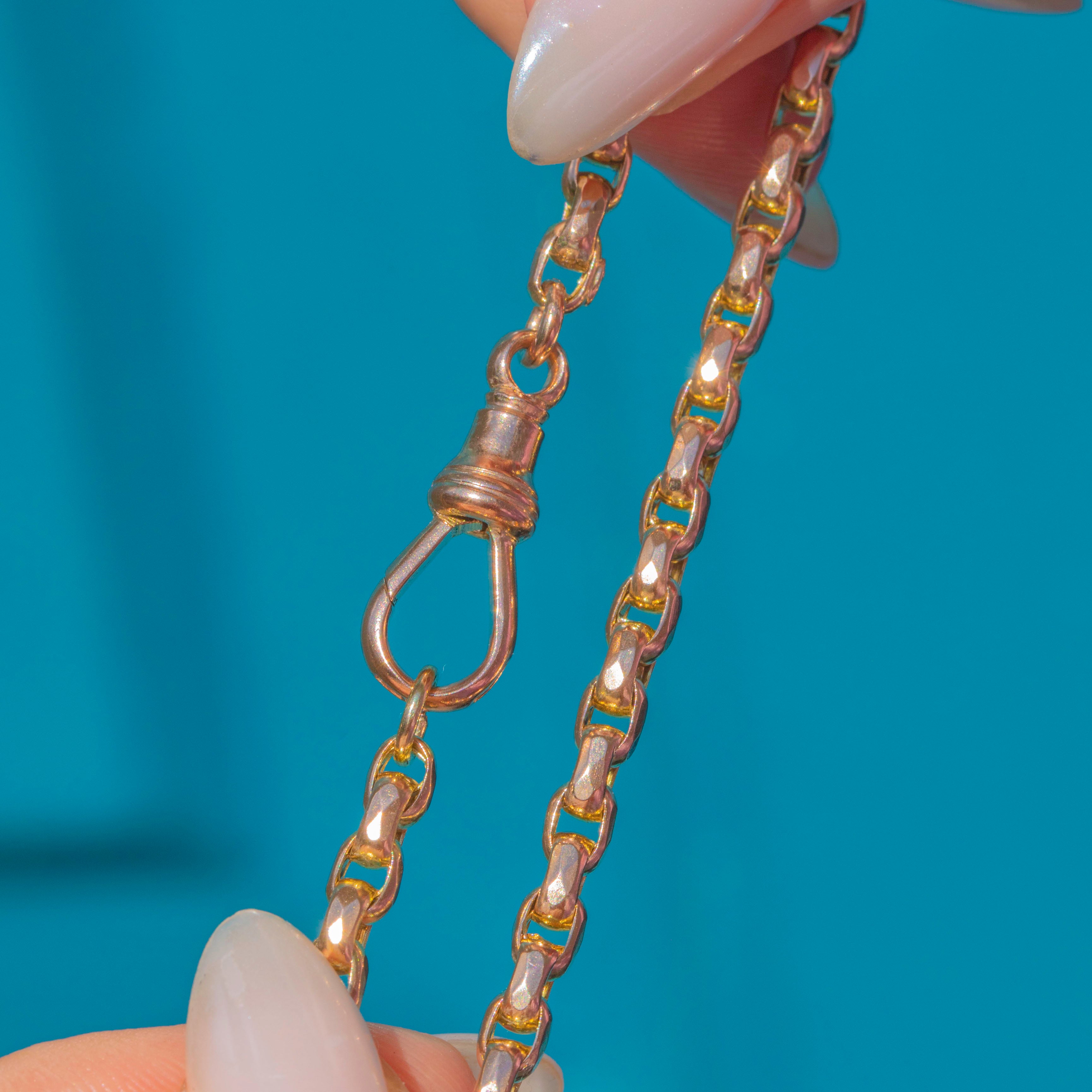 Crafted from solid 9ct Gold with a rare 9C tag, this Victorian belcher chain is a versatile 18" in length and comes complete with a highly sought-after dog-clip, ready to attend to all your charm holding needs!
