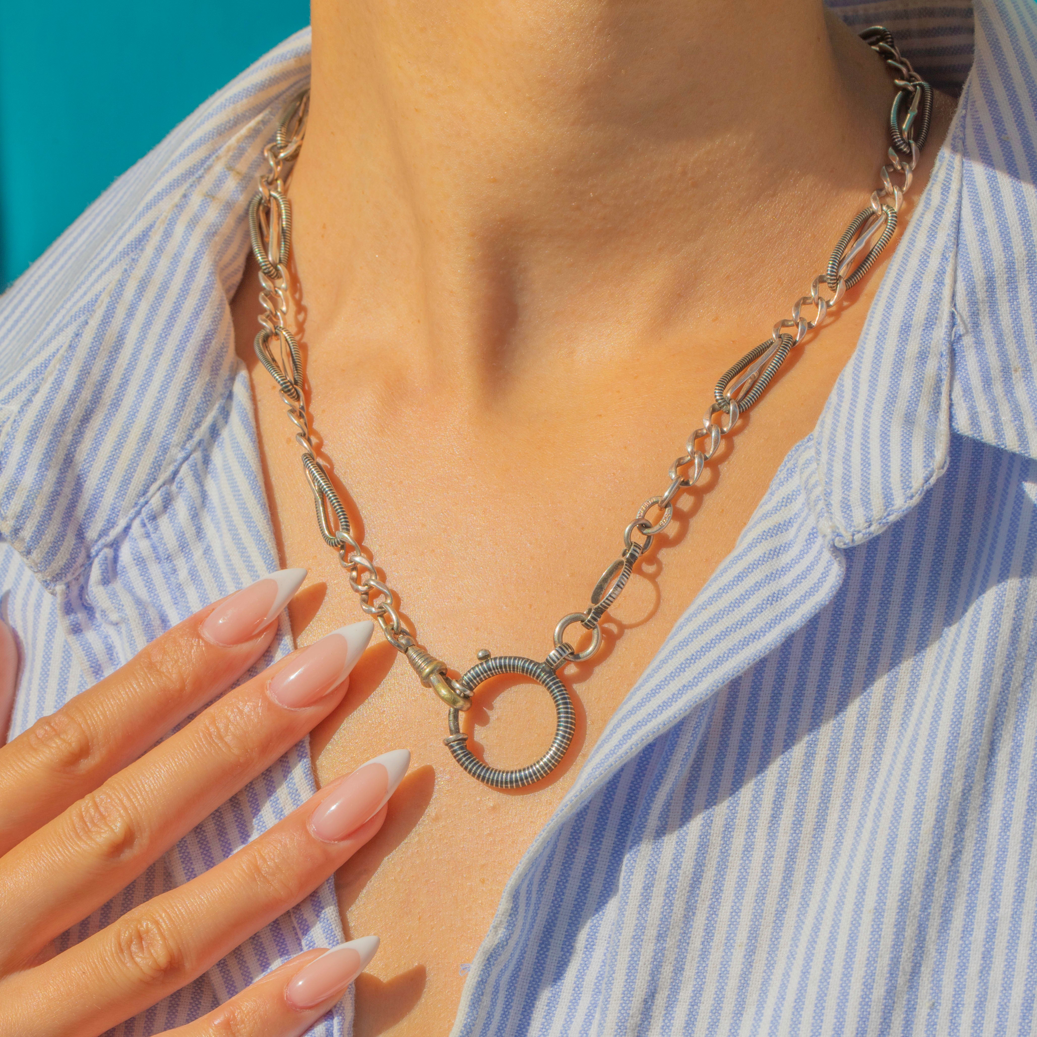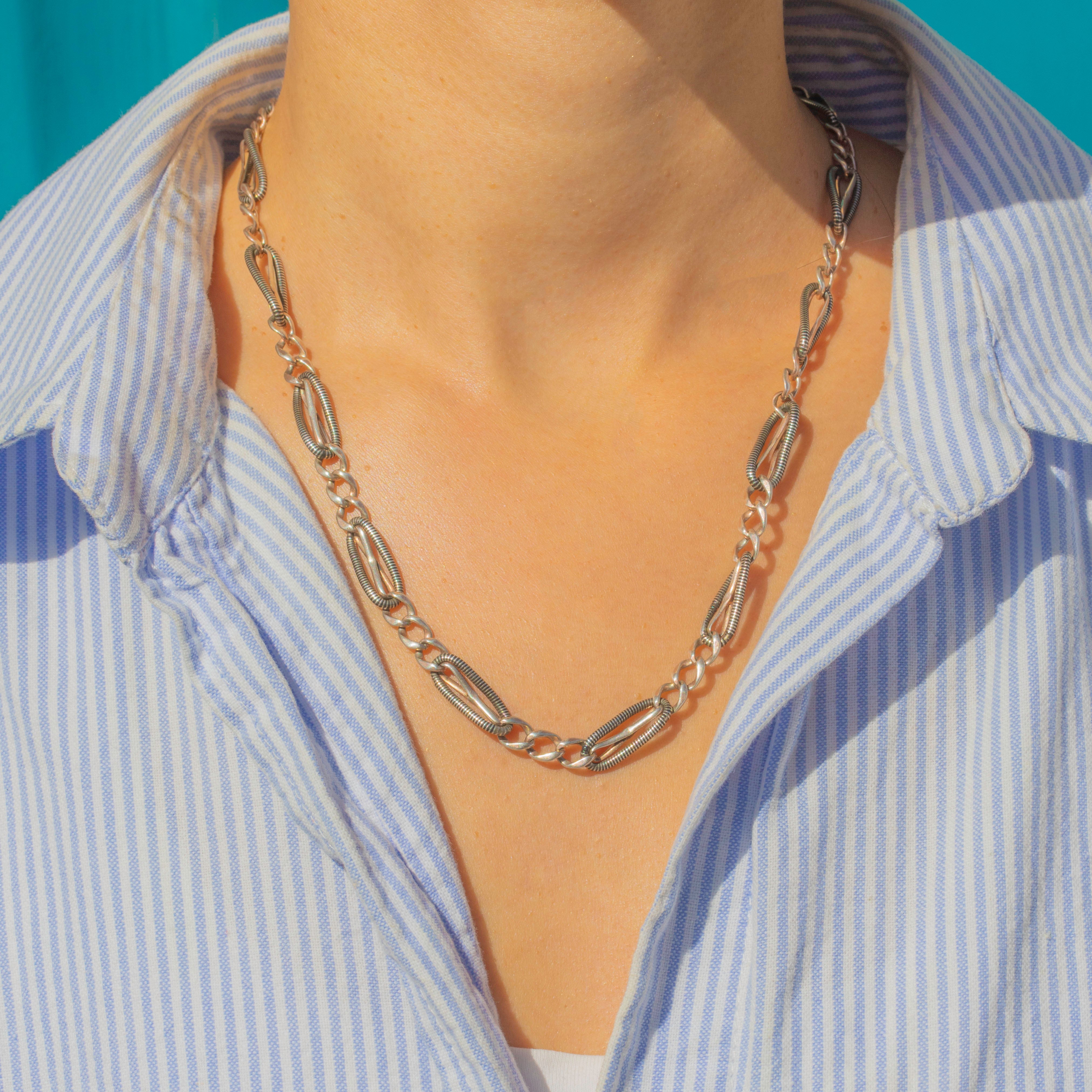 A handsome Victorian Niello chain in Sterling Silver, composed of elongated ribbed oval links alternating with short curb sections and finished with a bold Niello bolt ring. The inlay shows that distinctive graphite sheen against warm silver, giving effortless texture and a subtly industrial edge. An easy everyday necklace with authentic 19th-century character.