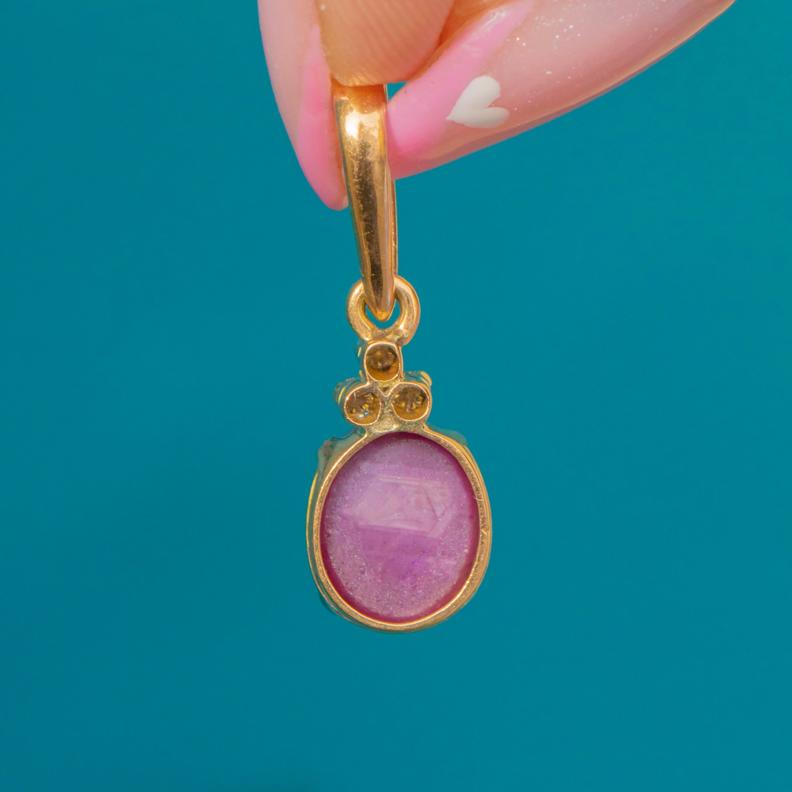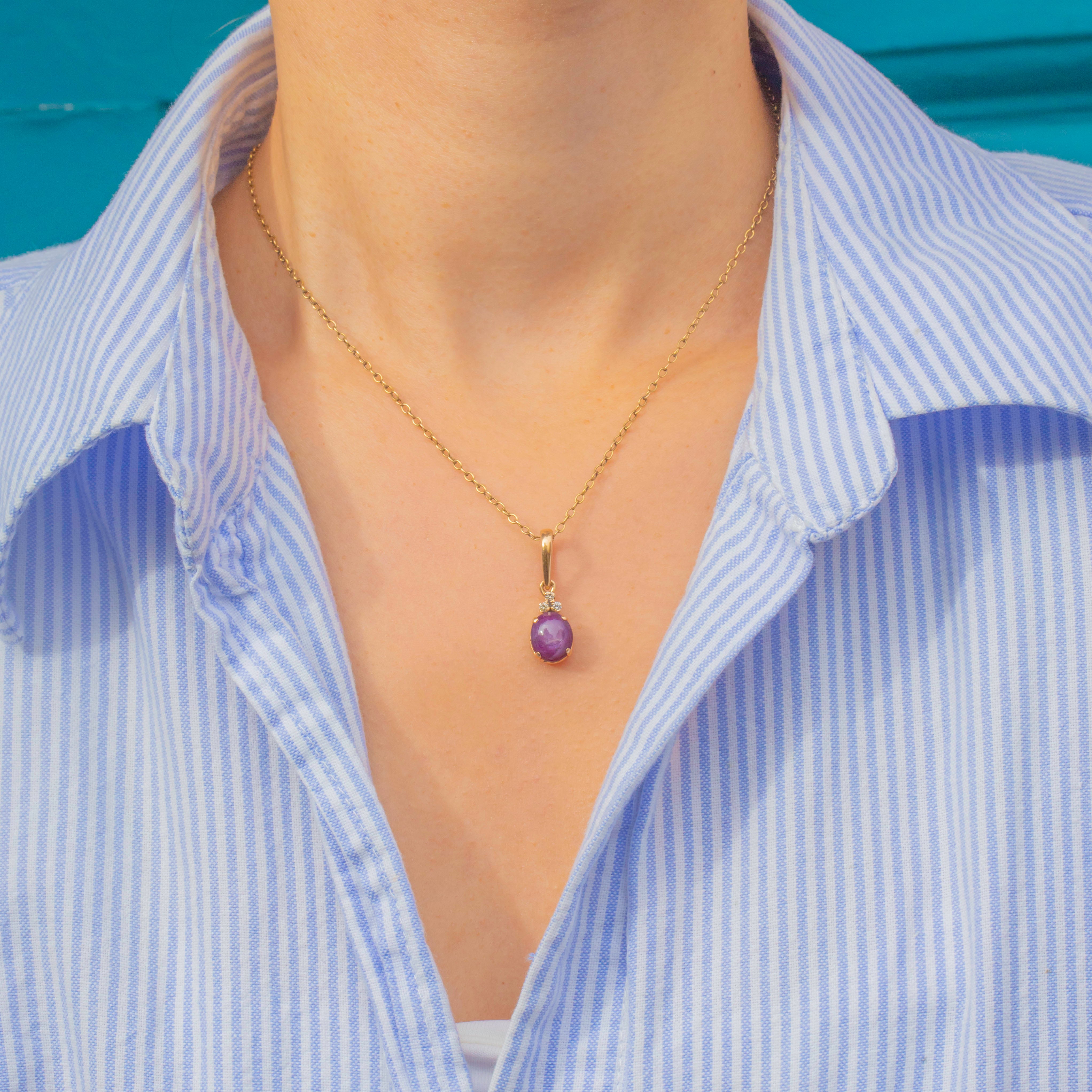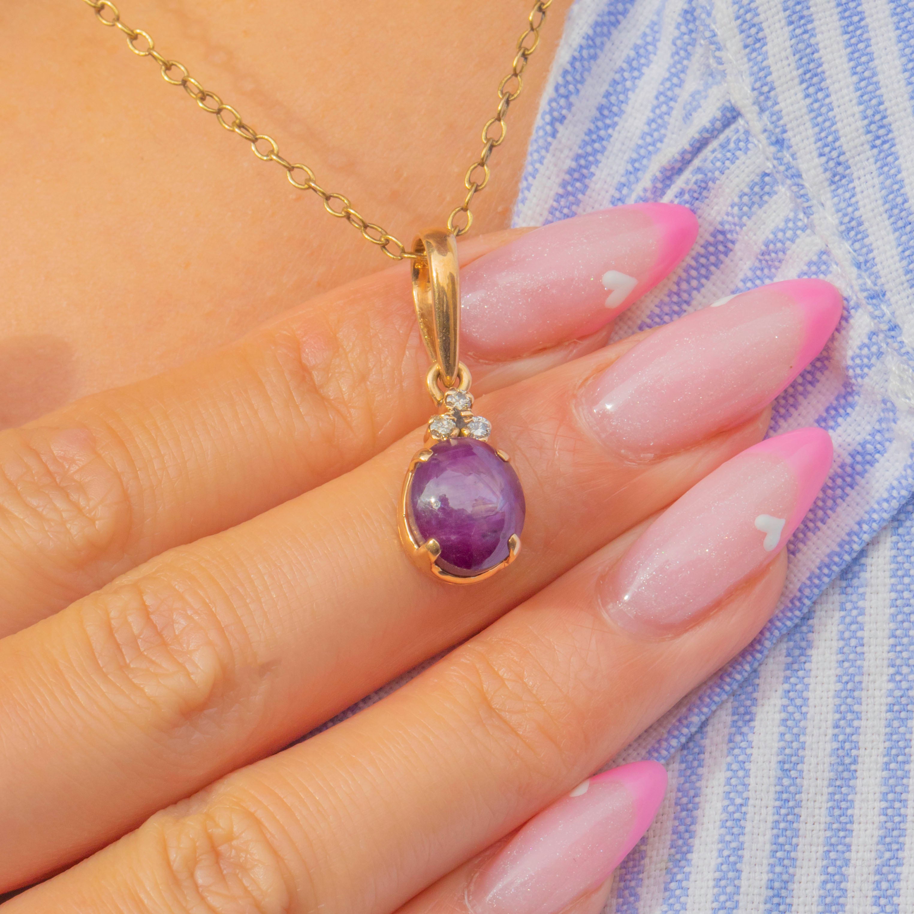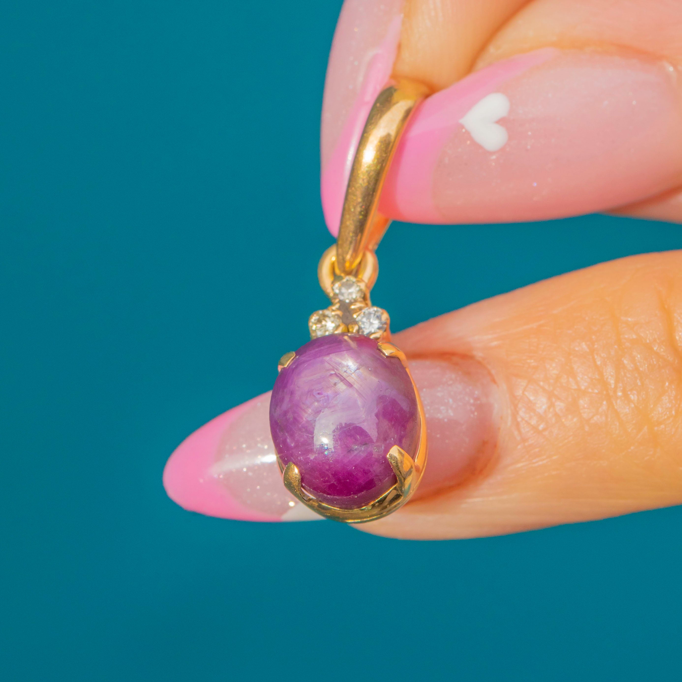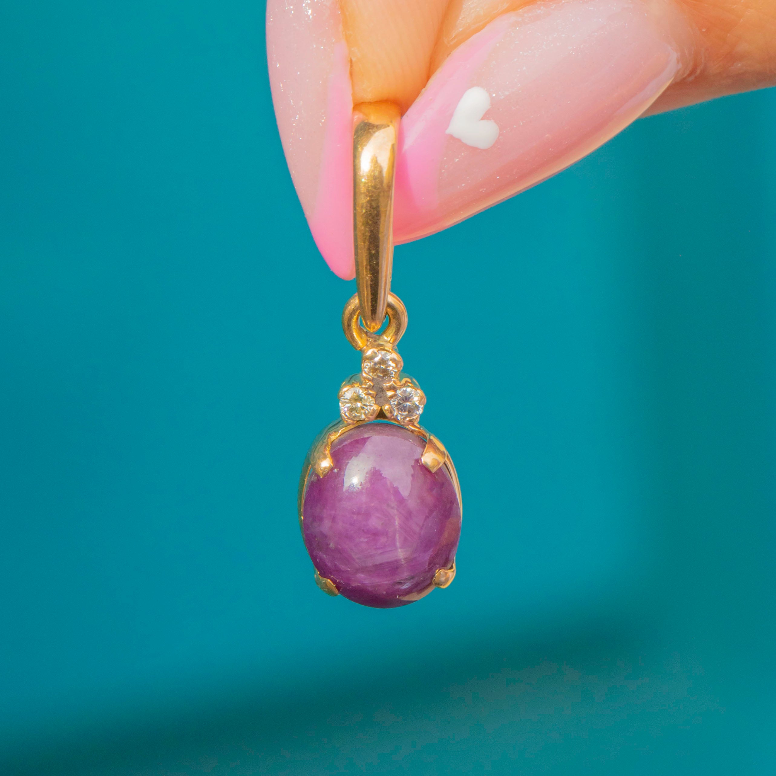 This captivating Vintage pendant centres on a rich cabochon Star Ruby, displaying a beautiful natural asterism that shimmers across its surface in the light. The Ruby’s deep purplish-red tone is enhanced by a polished 18ct Gold setting and a trio of twinkling Diamond accents above, adding a refined touch of sparkle.
