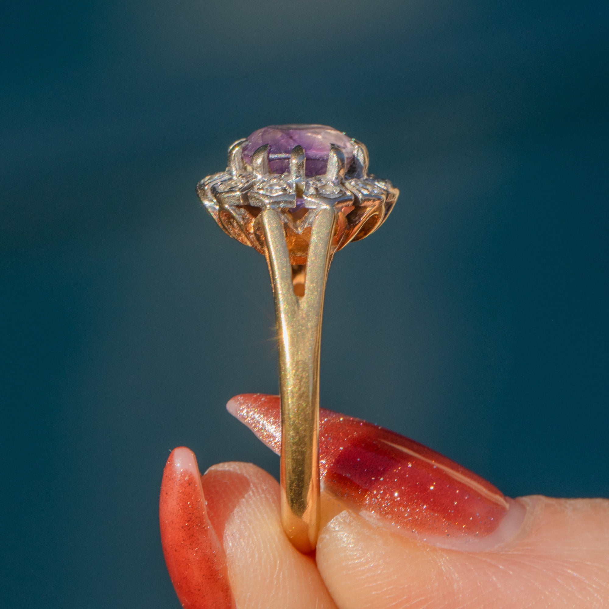 VERY GOOD: This 18ct Gold Amethyst Diamond flower cluster ring is in lovely vintage condition. The gemstones are all present and securely set within 18ct white Gold, with only some abrasions to note on the Amethyst. The yellow Gold band is brightly saturated and feels robust and comfortable to wear. The hallmarks are clear and fully legible, allowing us to accurately date this vintage Amethyst Diamond ring to 1970!