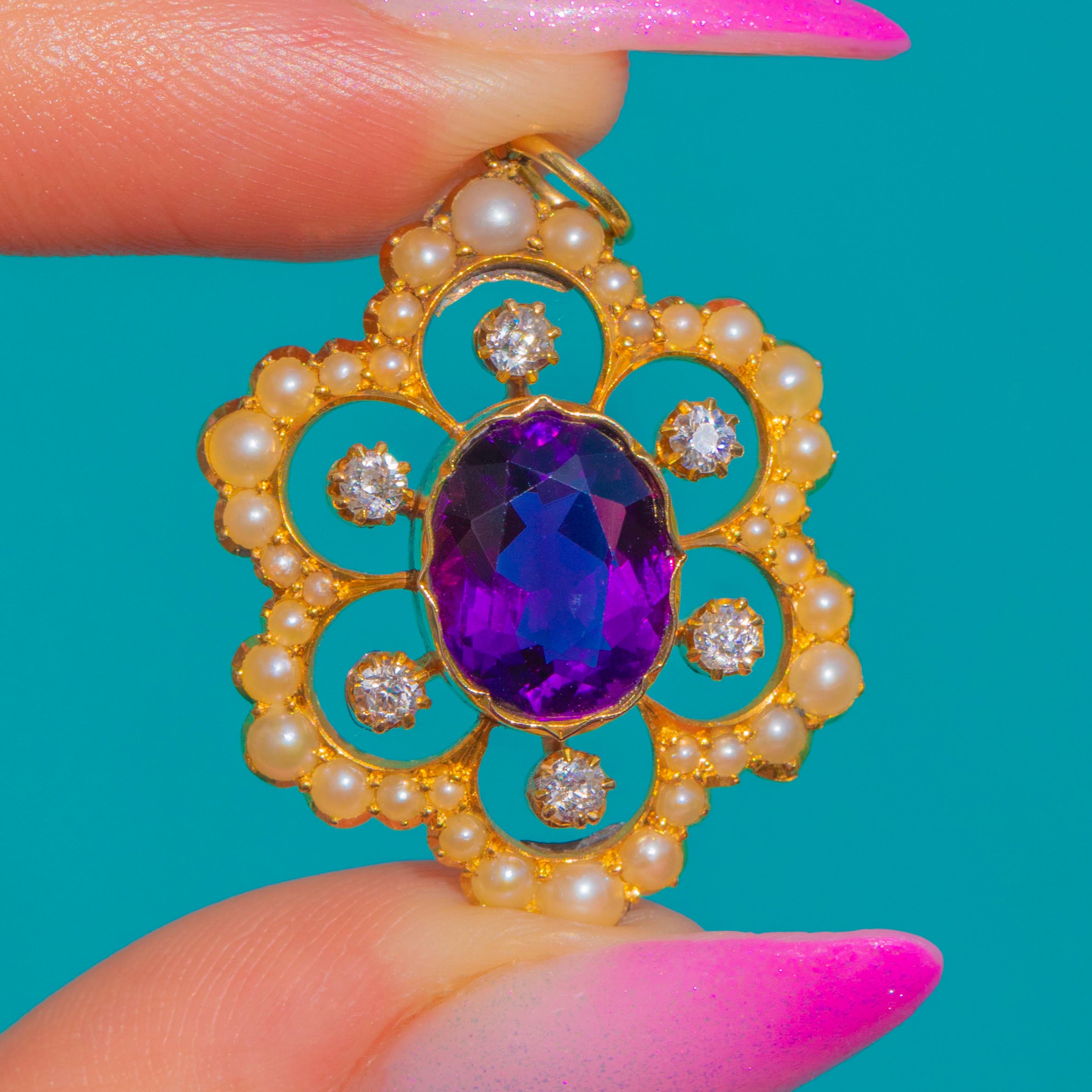 EXCELLENT: The Amethyst, Diamonds and Pearls are bright with no visible chips or significant abrasions; the Amethyst’s facets remain crisp. The 18ct Gold settings and decorative openwork are secure with light surface wear commensurate with age. A beautifully preserved antique pendant, ready to wear and enjoy.