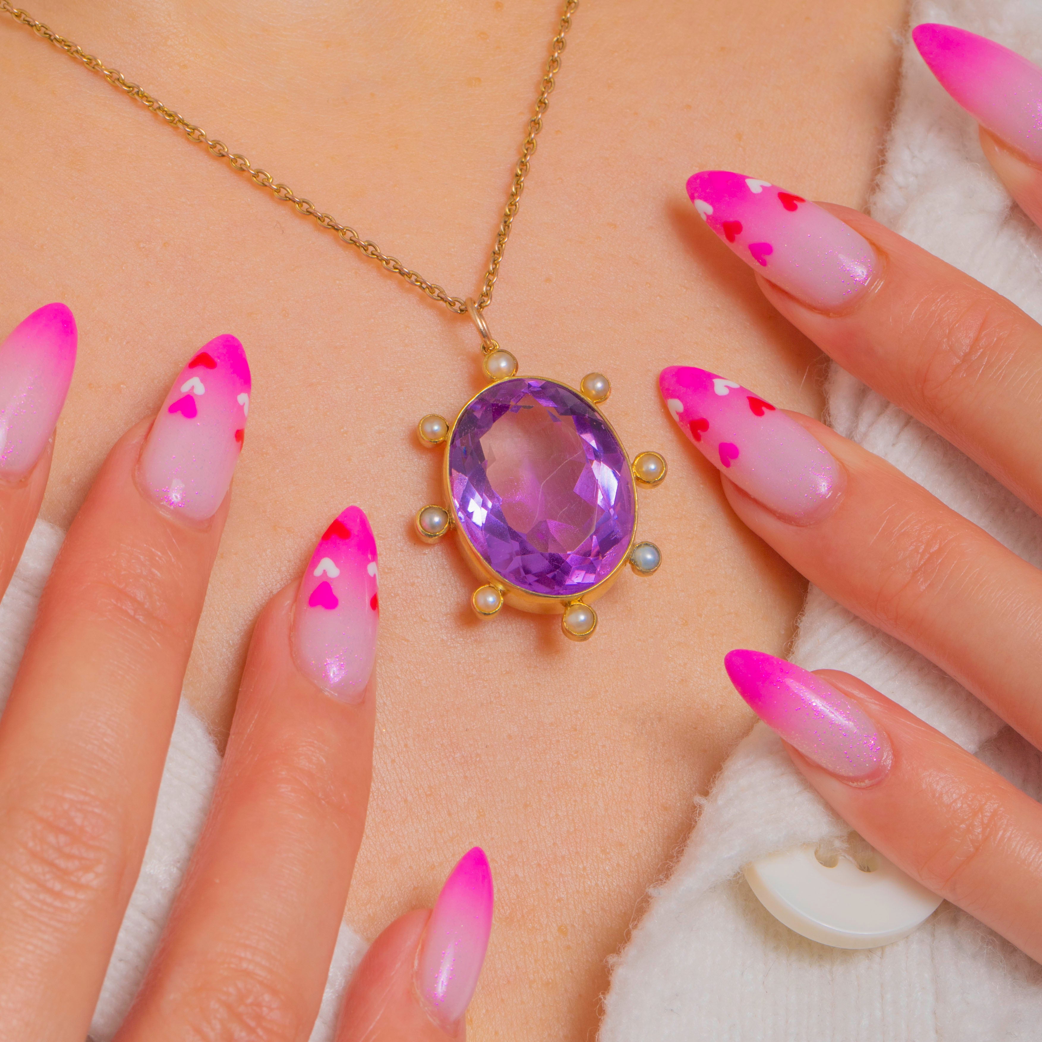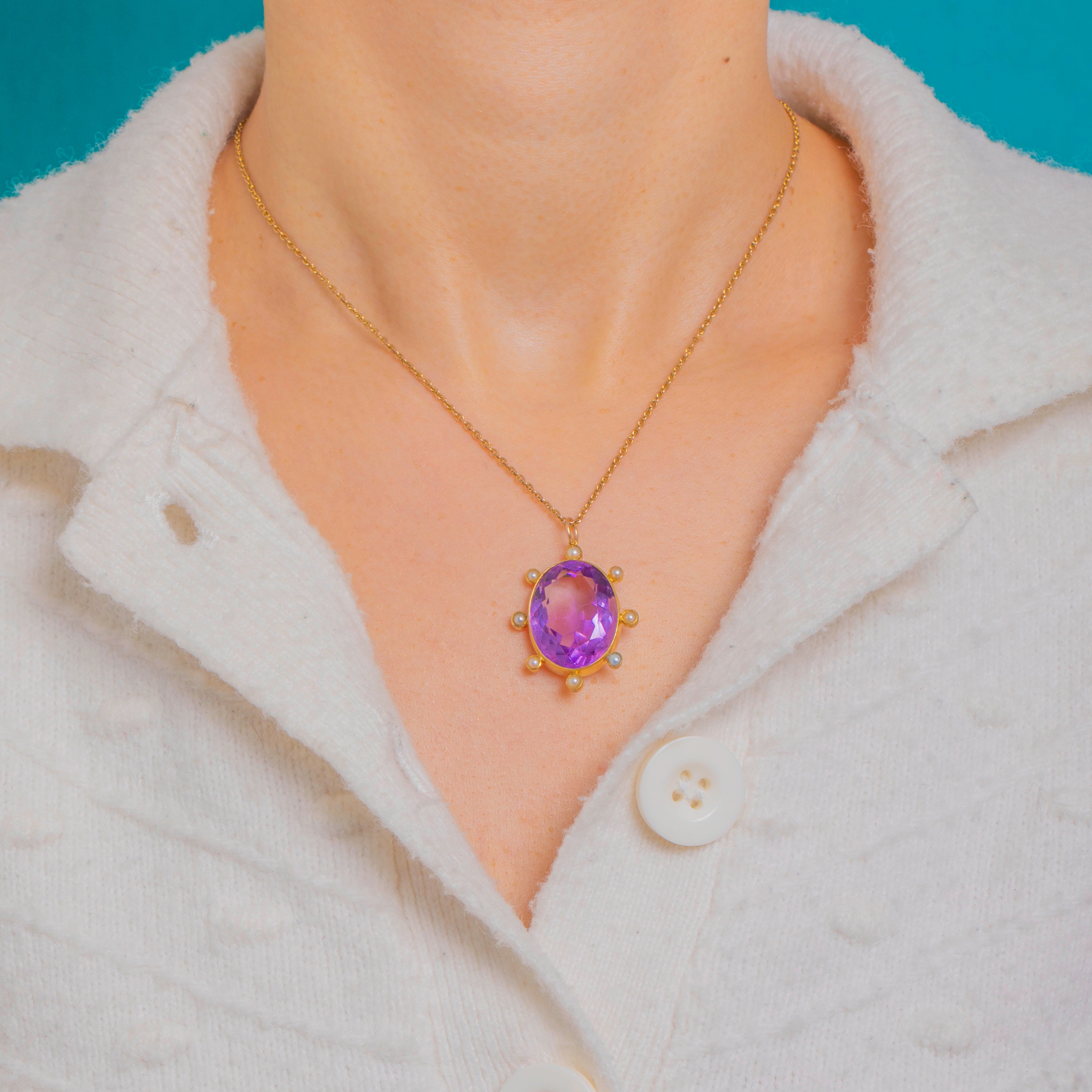 Glowing with regal colour and classic Victorian charm, this 18ct Gold pendant showcases a sumptuous oval Amethyst framed by a halo of creamy Seed Pearls in a refined starburst design. The Amethyst’s rich purple hue is beautifully intensified by the warm glow of 18ct Gold, its faceted surface throwing lively flashes with every movement.