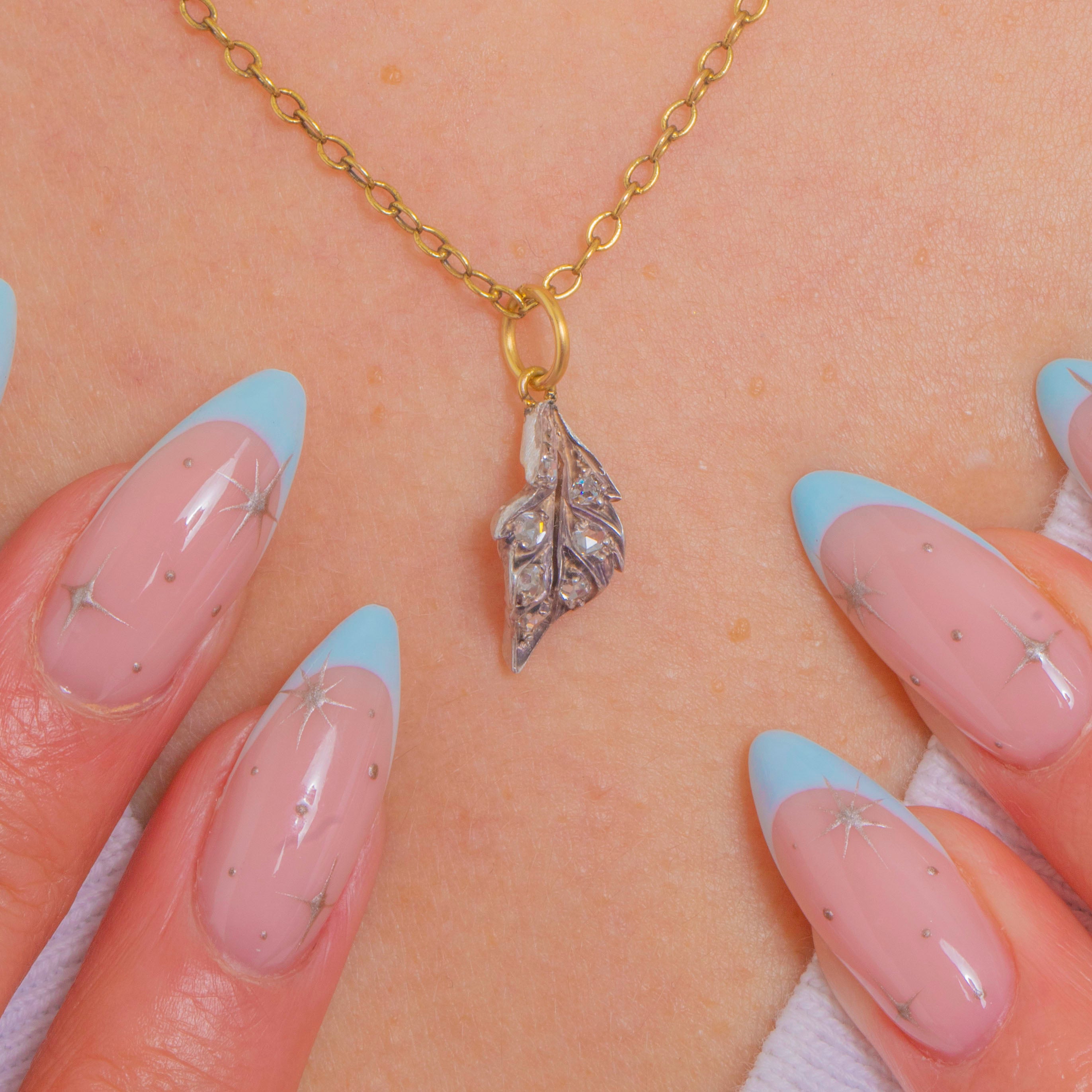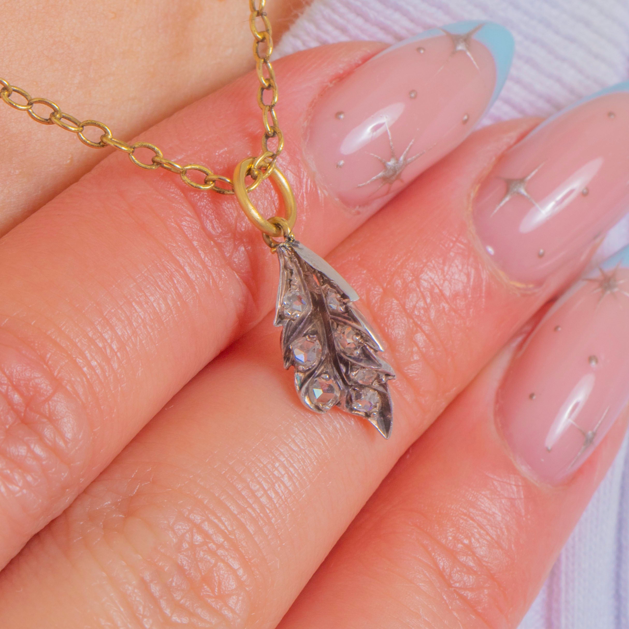 Dainty and full of Victorian charm, this petite leaf pendant is set with tiny rose-cut Diamonds that shimmer with a soft, antique glow. The naturalistic leaf is beautifully detailed with a central vein and delicately serrated edges, its Silver face contrasted by a warm 18ct Gold back for an elegant two-tone look.