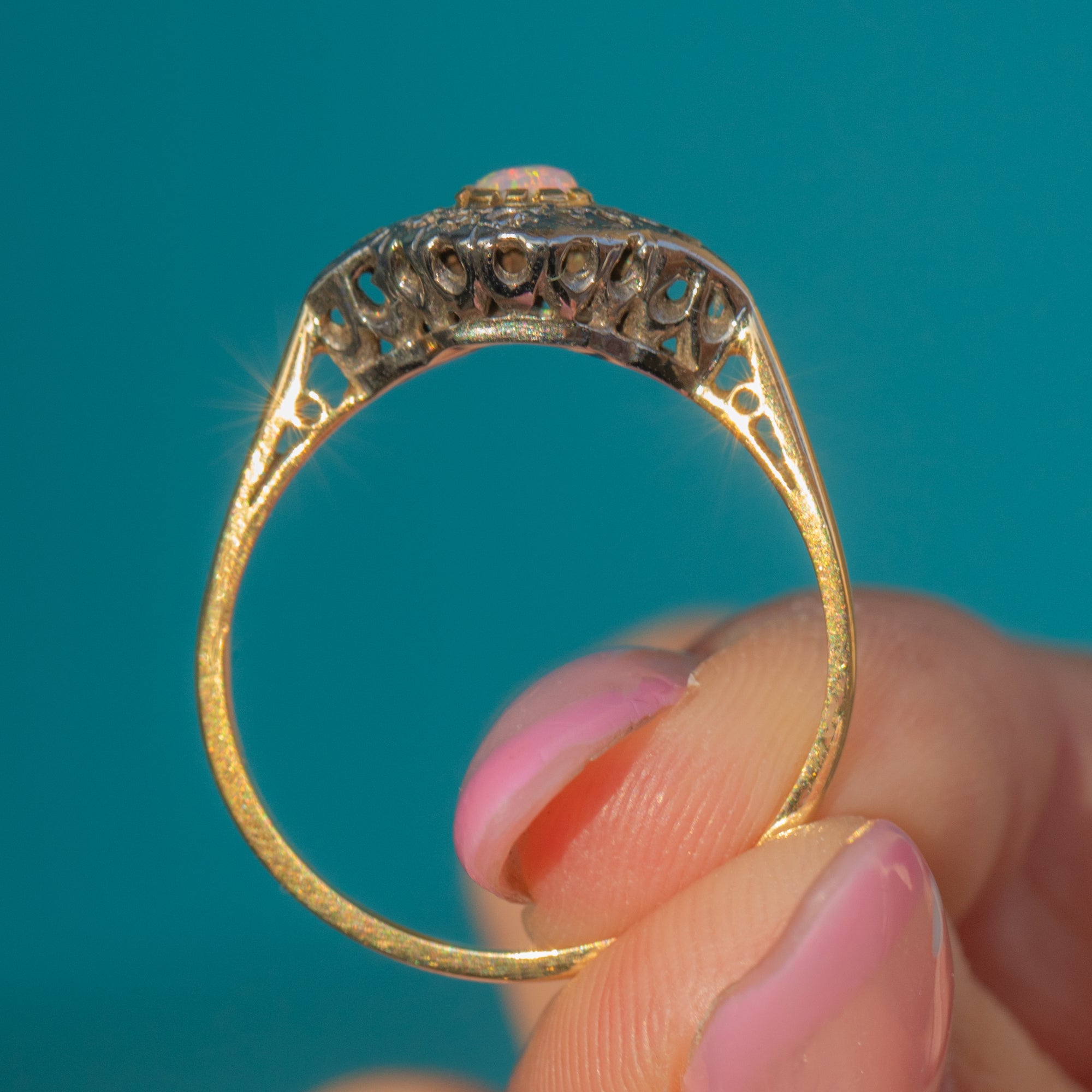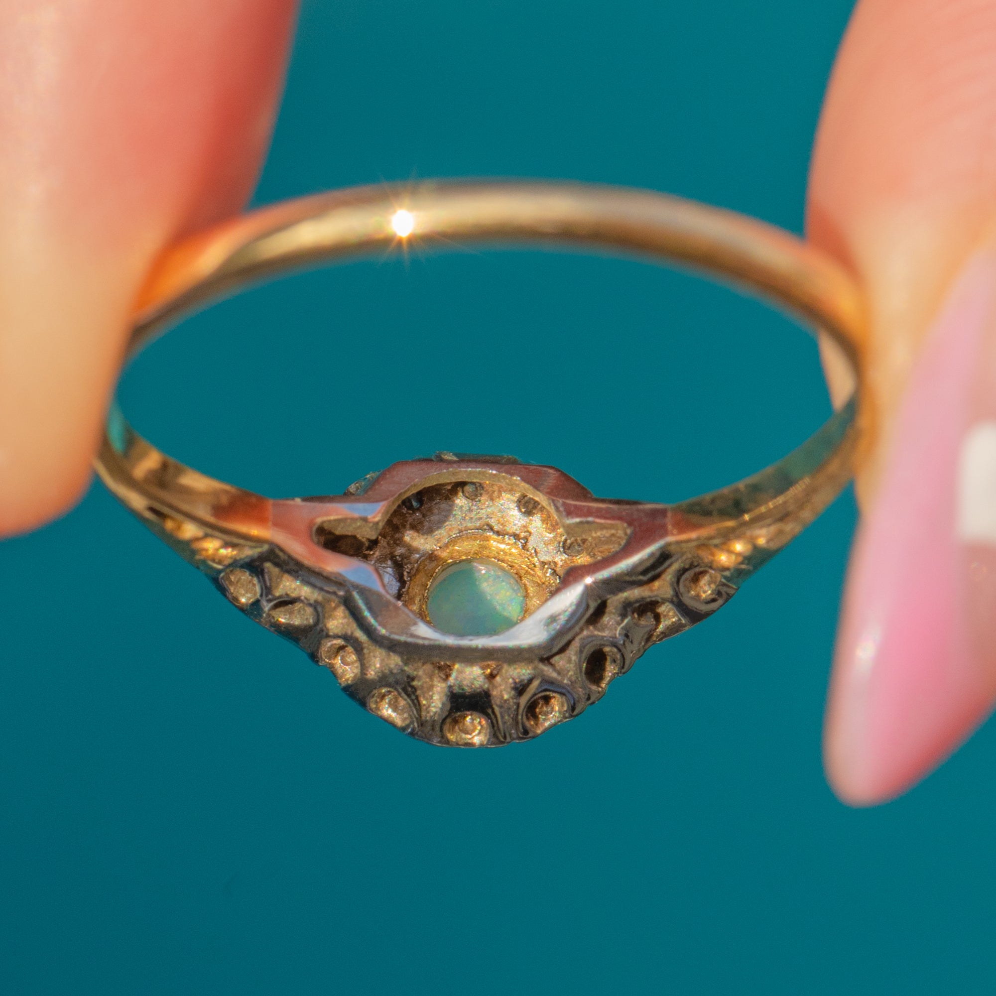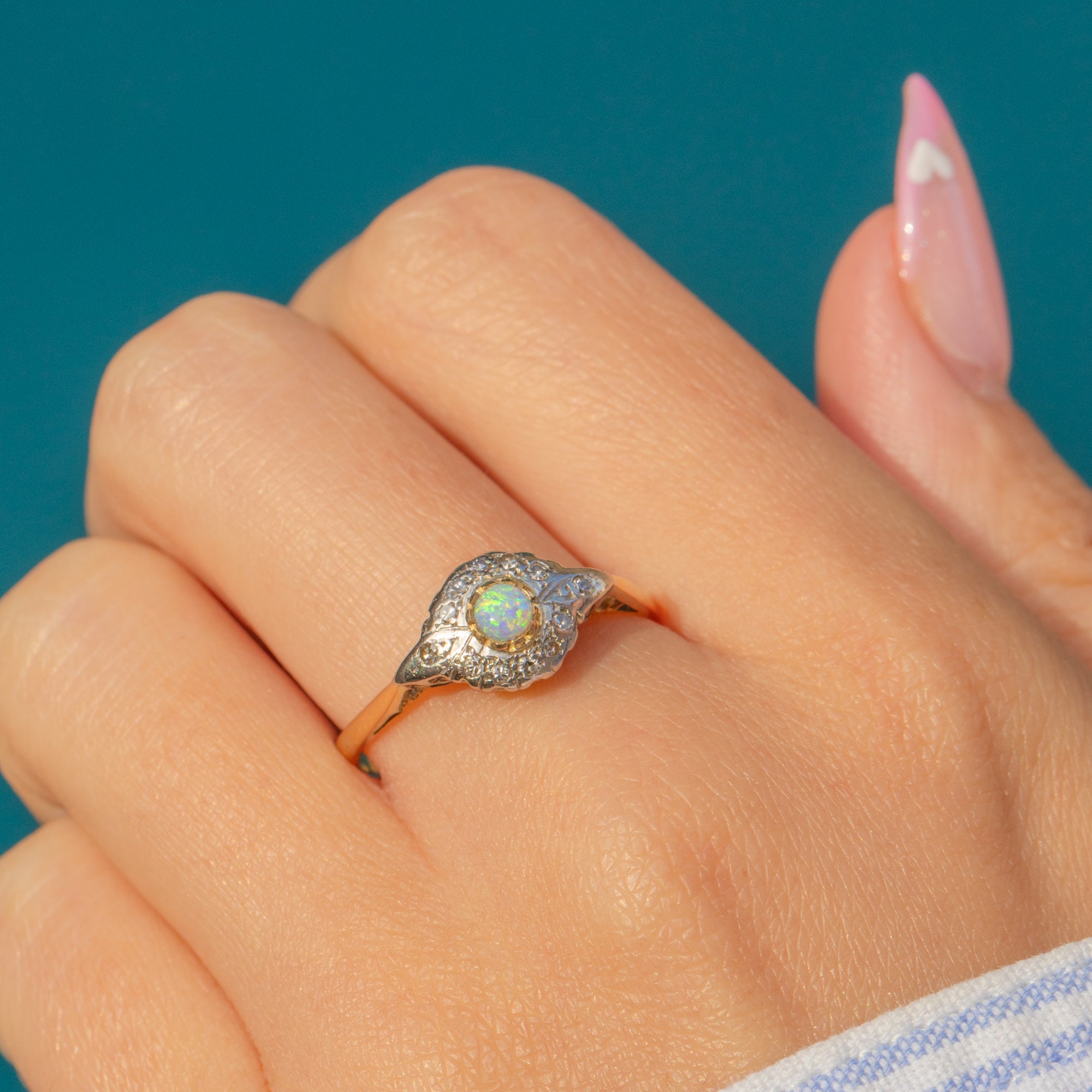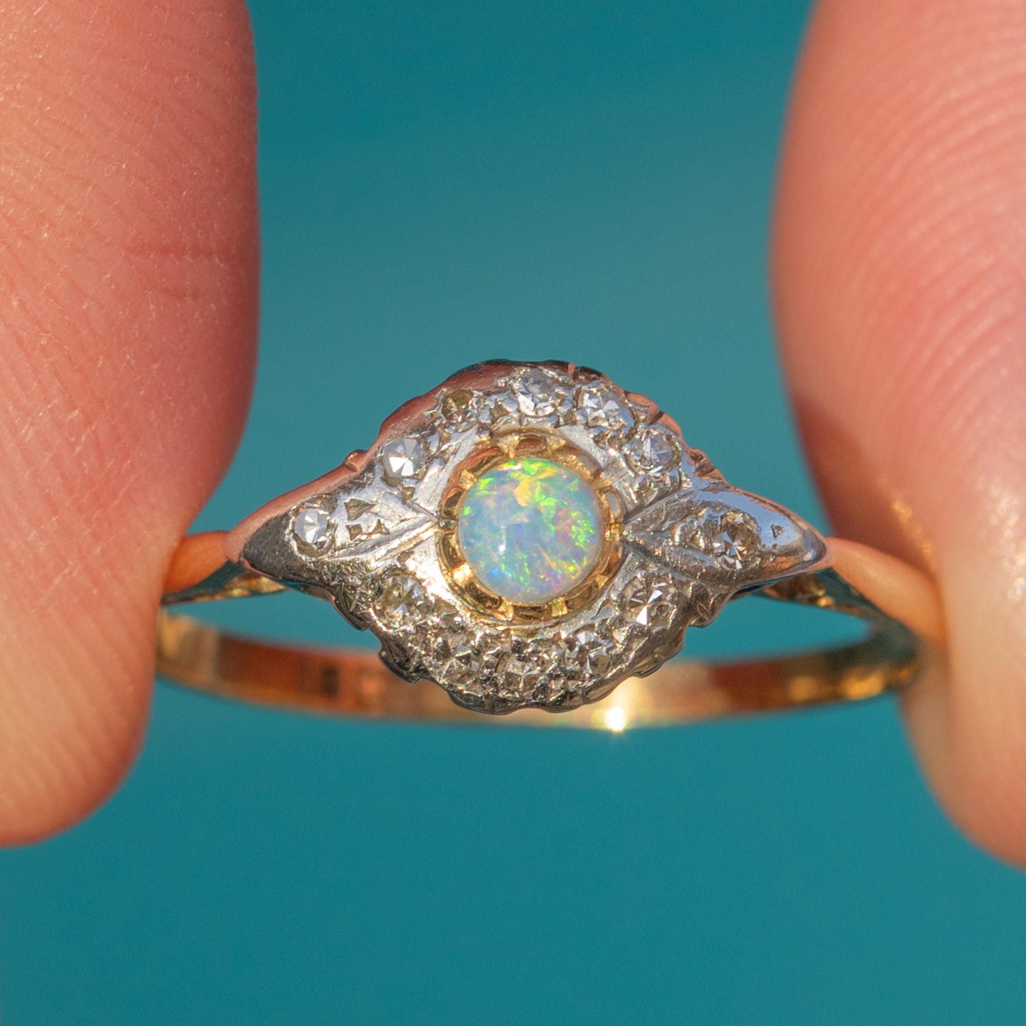 EXCELLENT: The Opal displays good colour and clarity with no surface wear. The Diamonds are bright, secure and well-matched. The Gold band retains a lovely smooth polish with minimal wear, and the ring has been beautifully cared for over time.