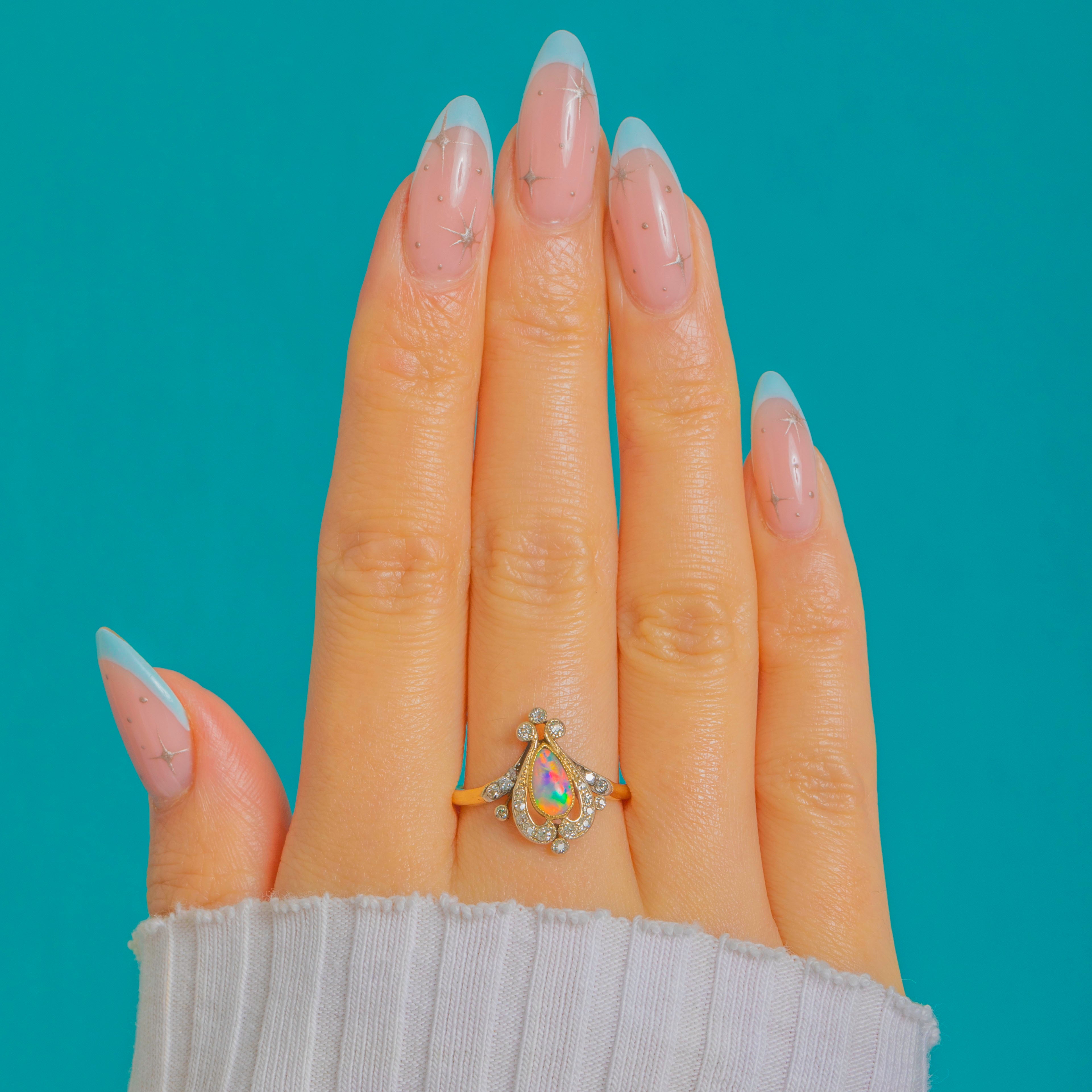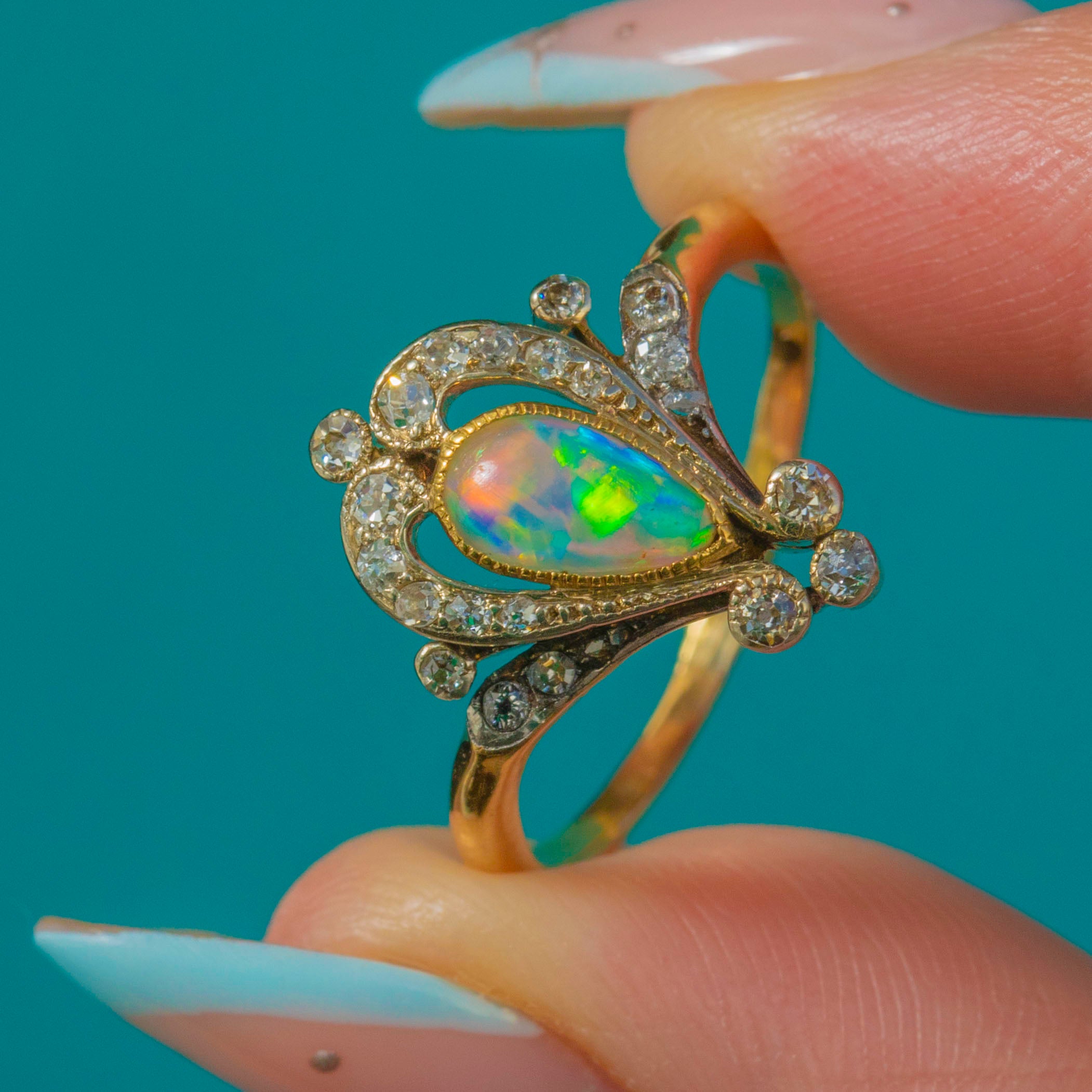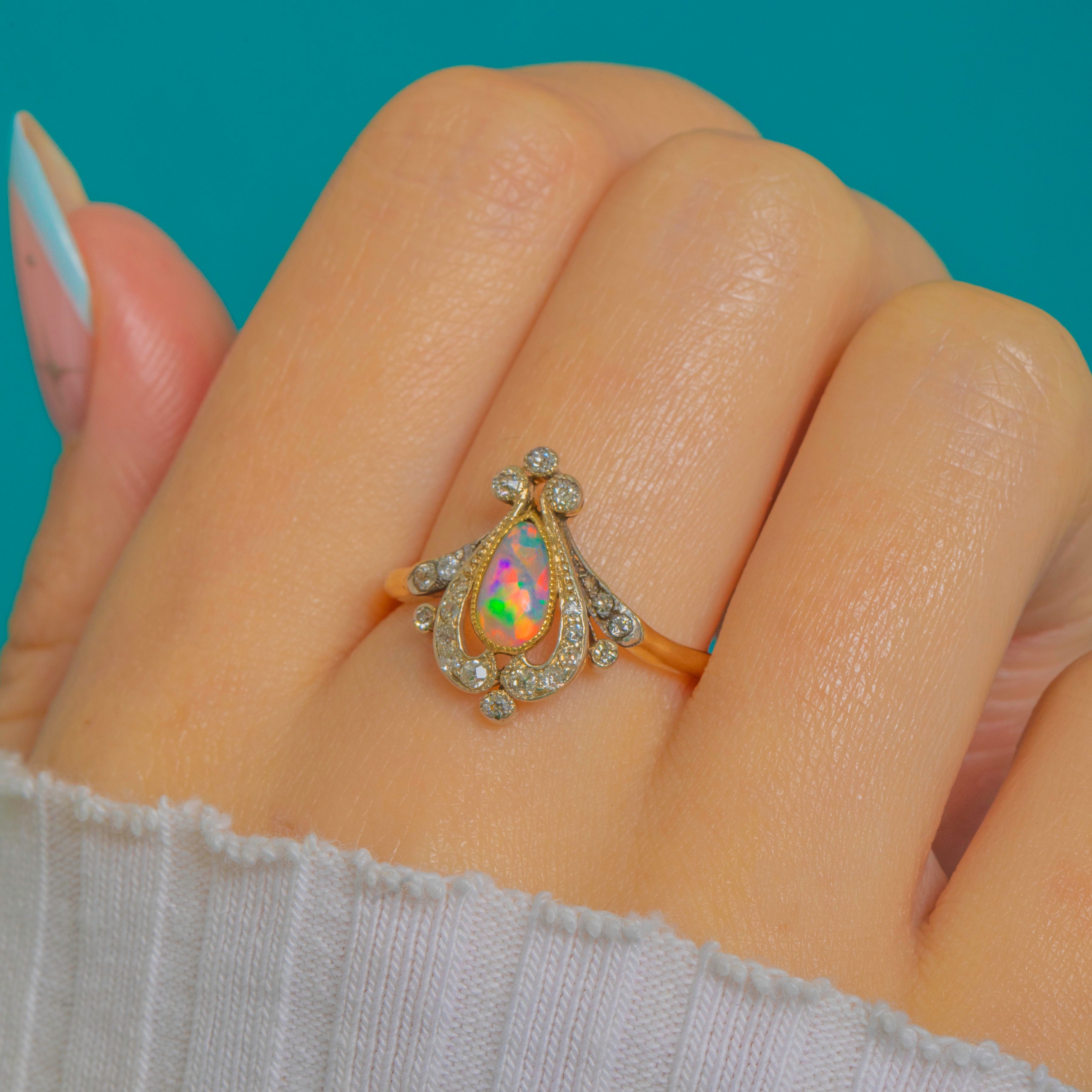 A wonderfully romantic Art Nouveau ring, shaped like a little jewel-box tiara. The centre holds a pear-shaped Opal with lively flashes of colour, framed by a glittering sweep of Diamonds set into cool Platinum for extra sparkle and contrast.