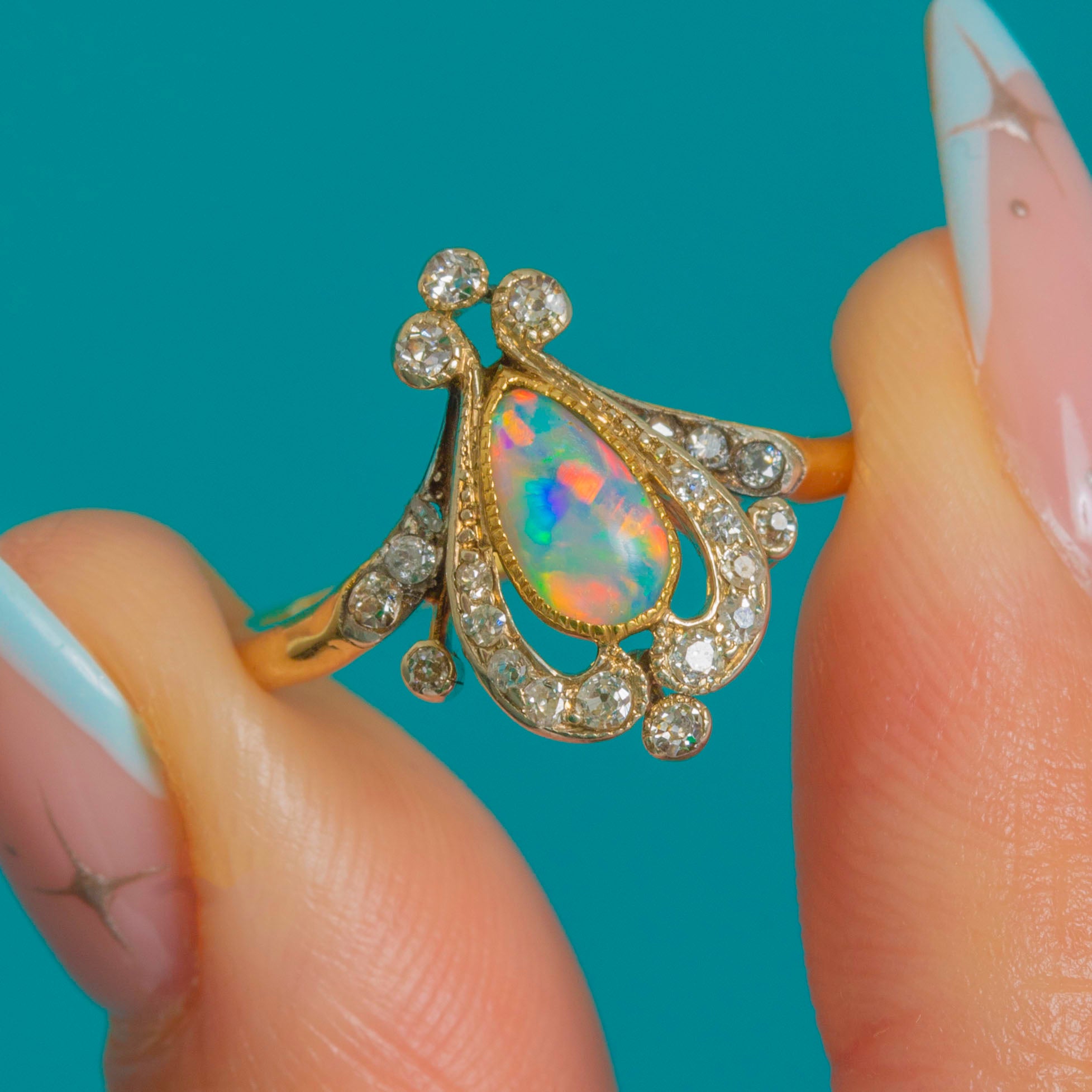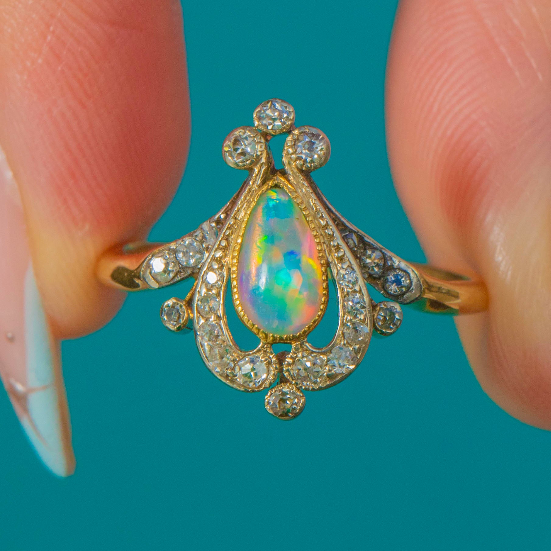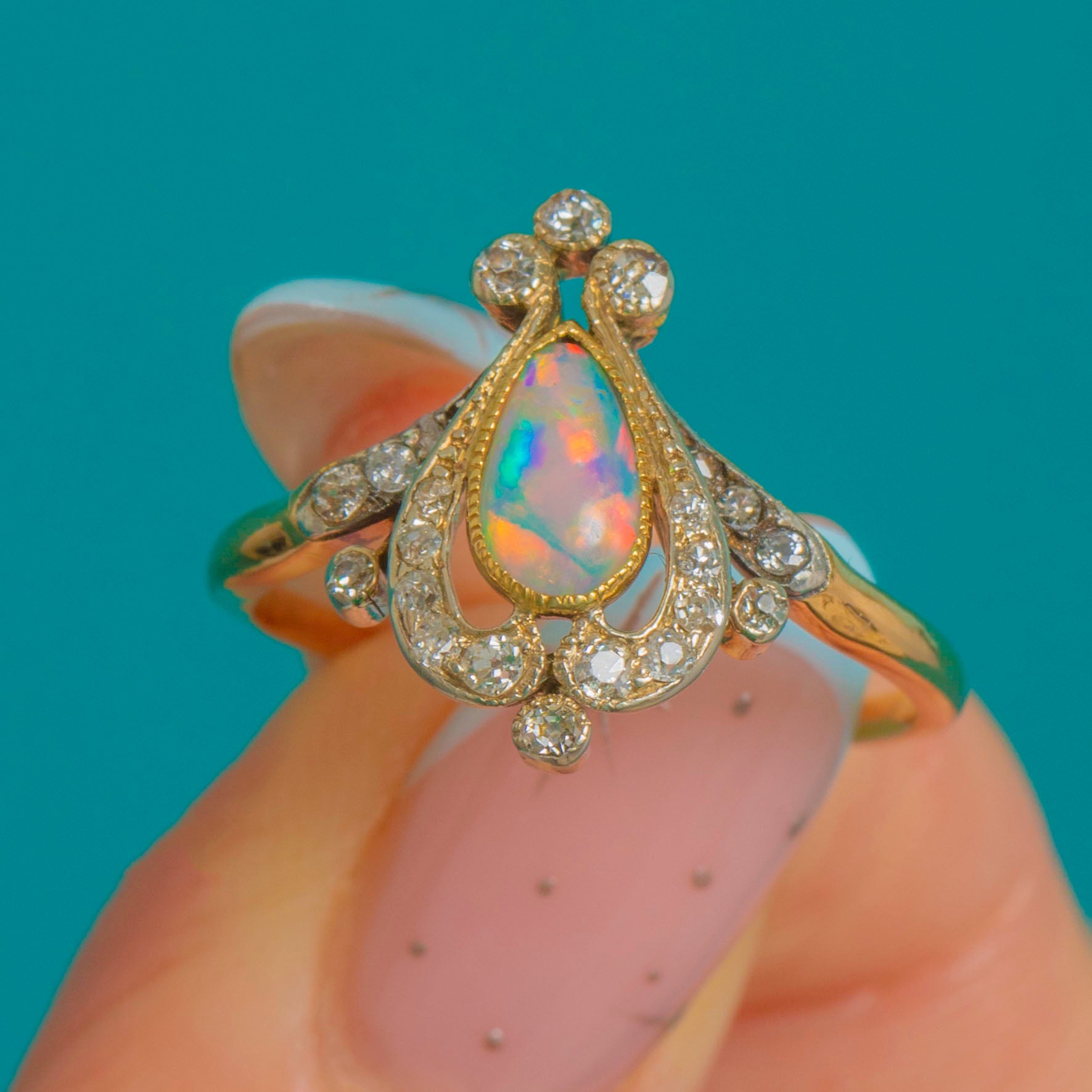 A wonderfully romantic Art Nouveau ring, shaped like a little jewel-box tiara. The centre holds a pear-shaped Opal with lively flashes of colour, framed by a glittering sweep of Diamonds set into cool Platinum for extra sparkle and contrast.