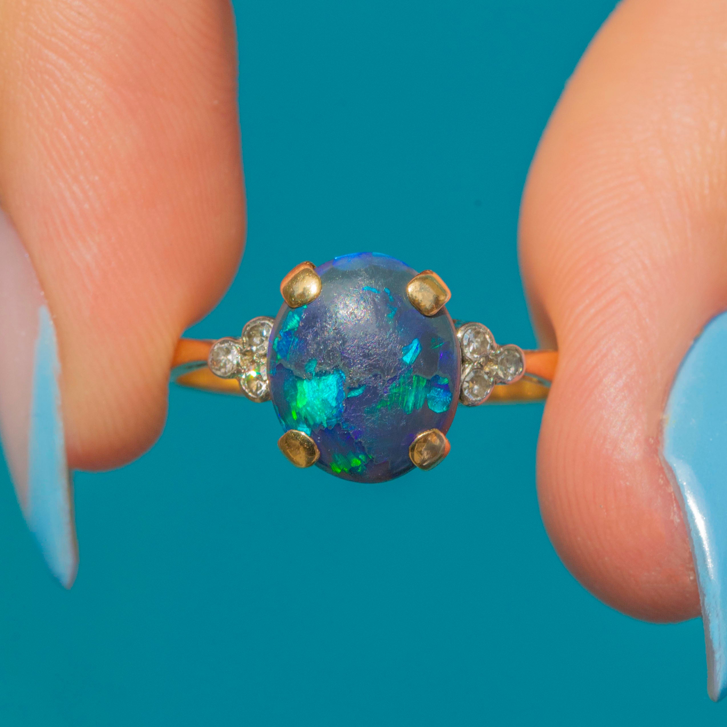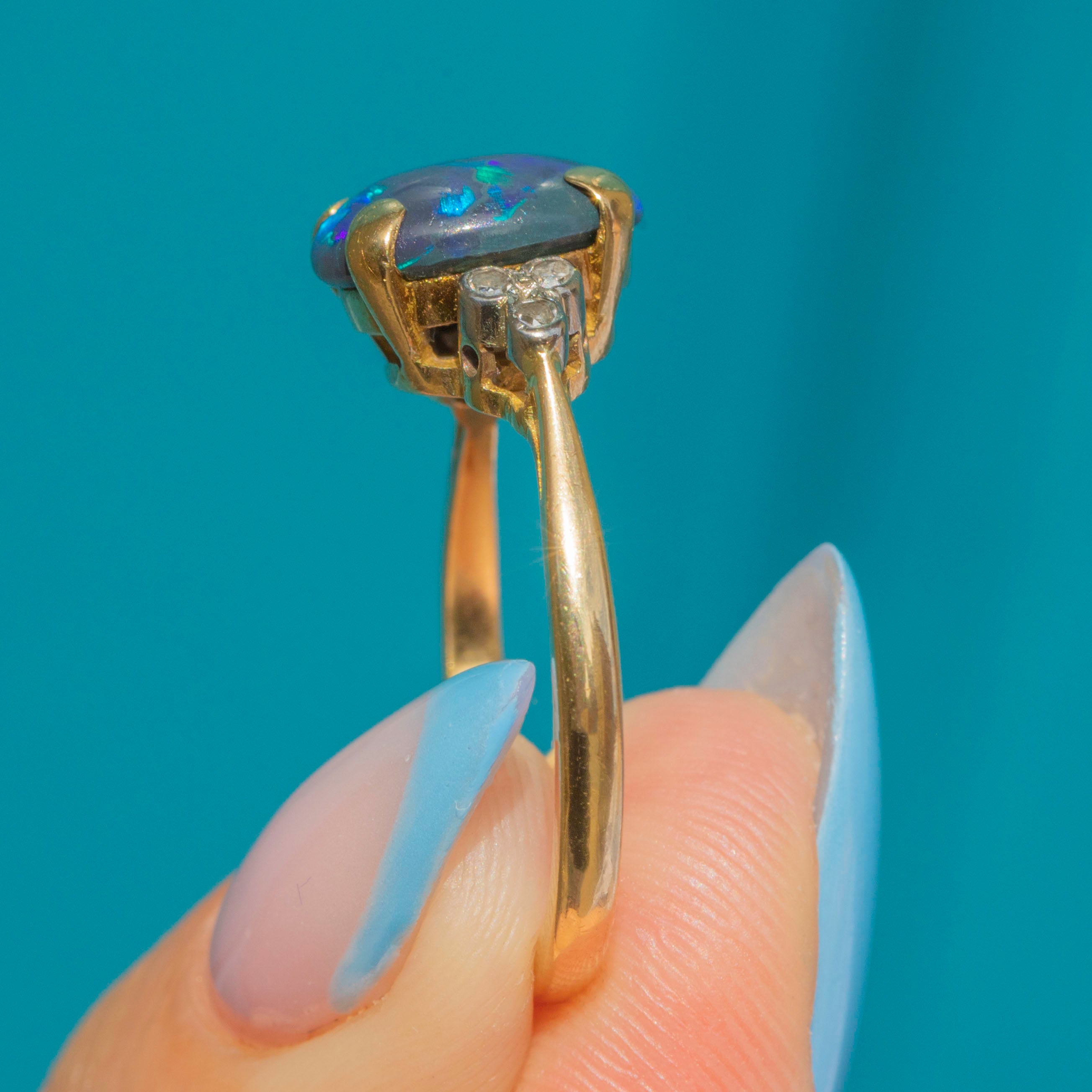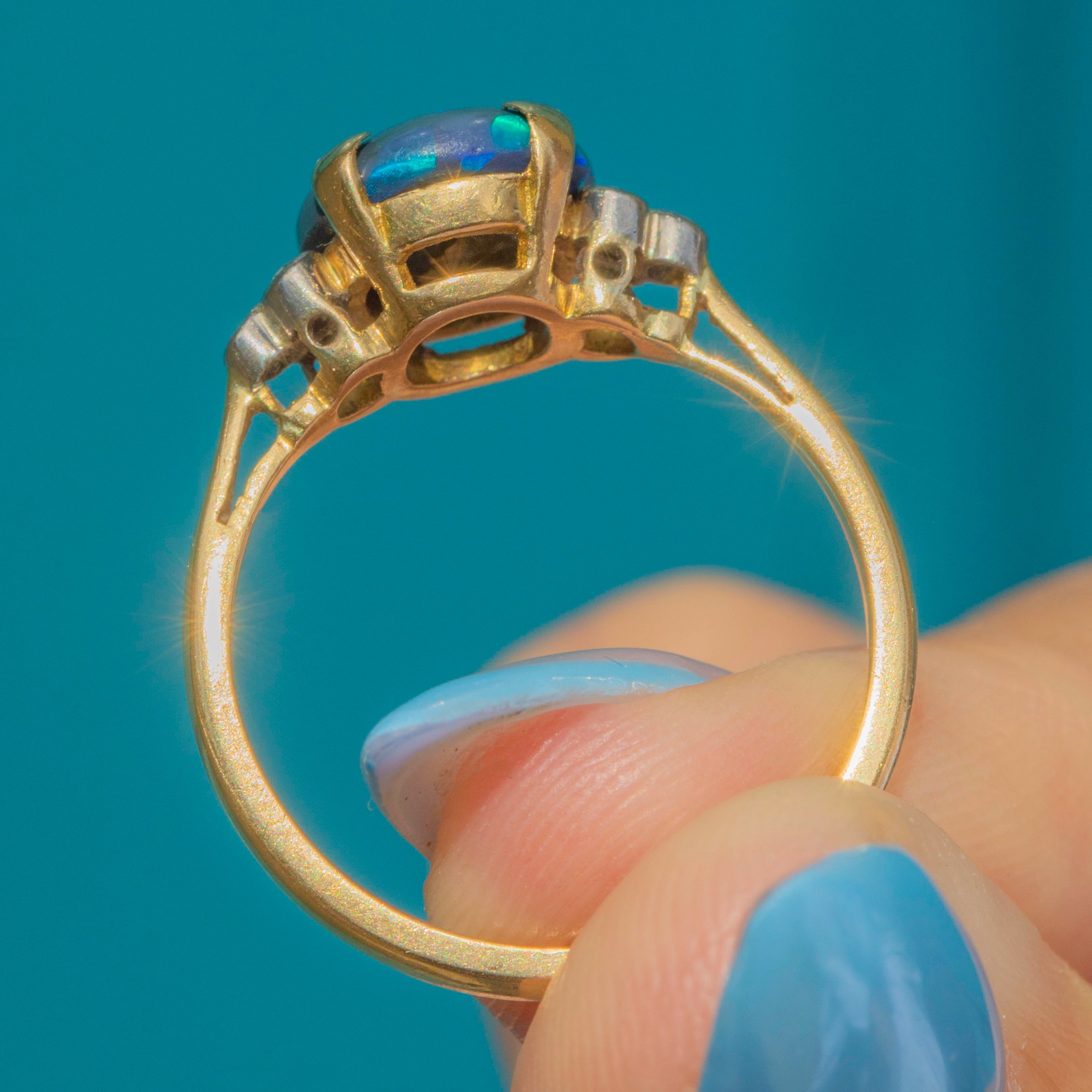 This Art Deco ring showcases a natural 0.85ct Black Opal with vivid flashes of royal blue, neon green, and soft pink, framed by three sparkling Diamonds on each side, all set in saturated 18ct Gold.