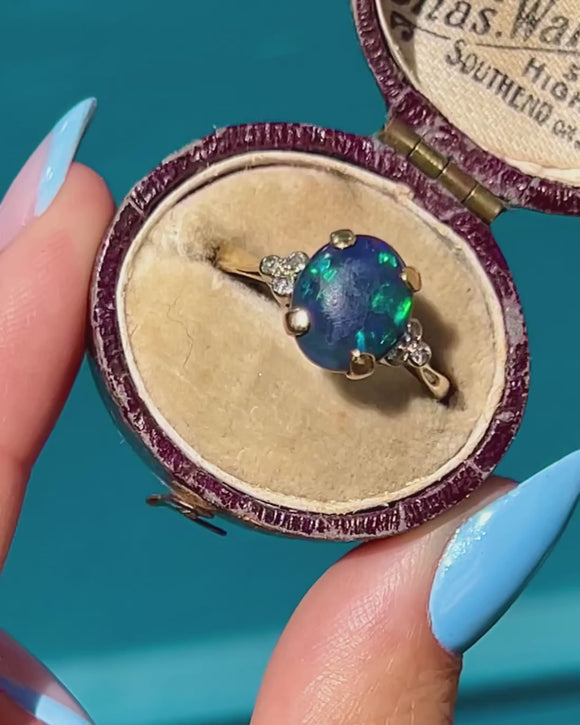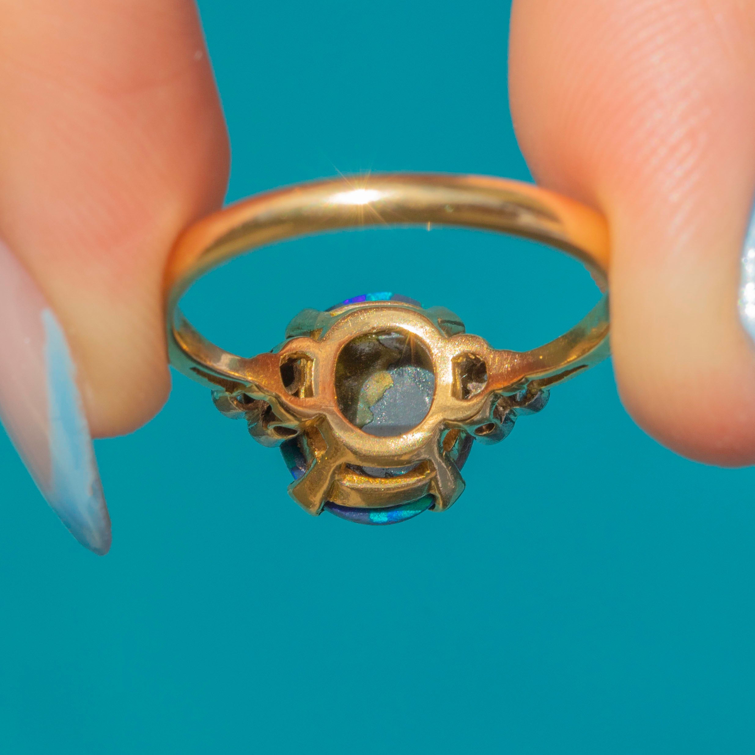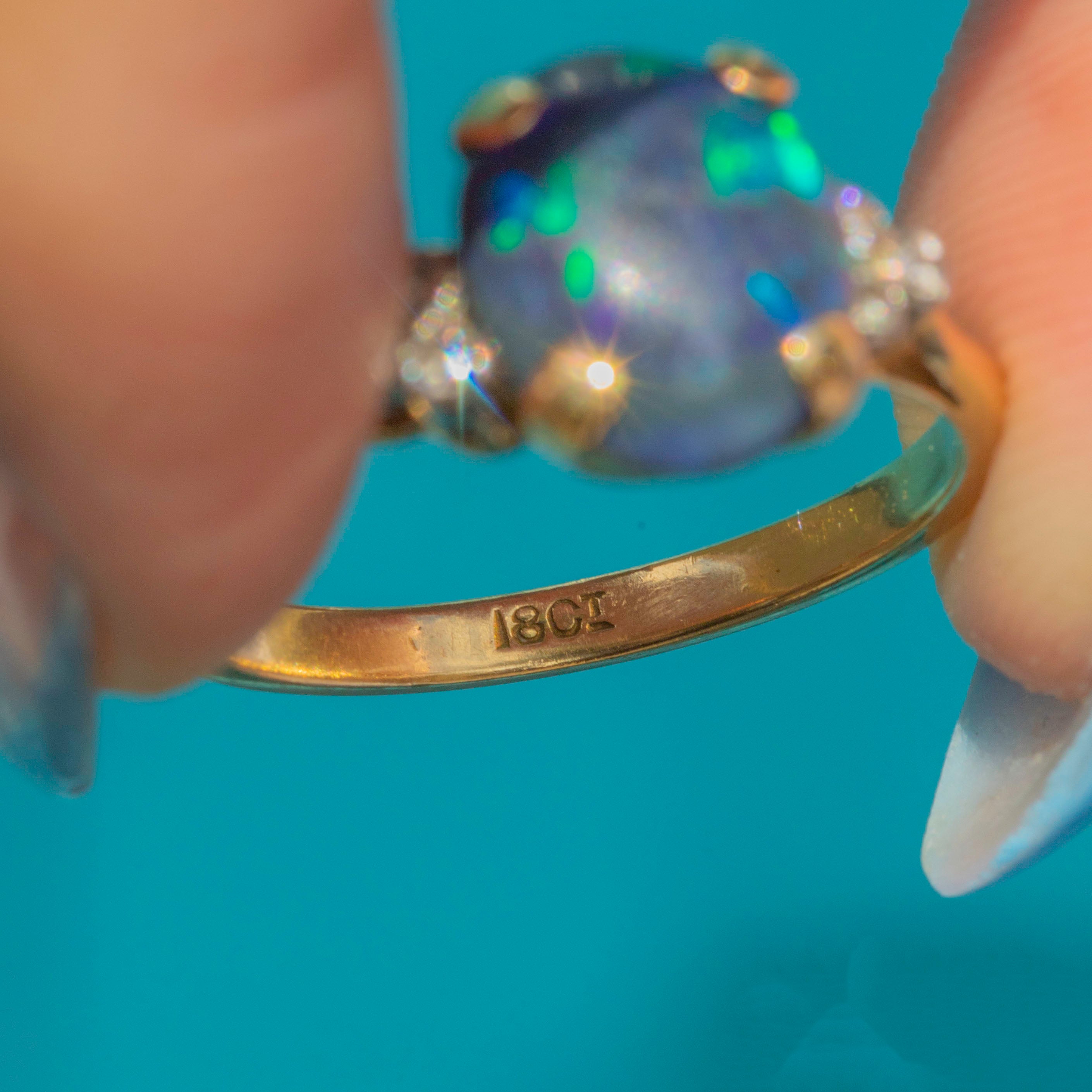 This Art Deco ring showcases a natural 0.85ct Black Opal with vivid flashes of royal blue, neon green, and soft pink, framed by three sparkling Diamonds on each side, all set in saturated 18ct Gold.