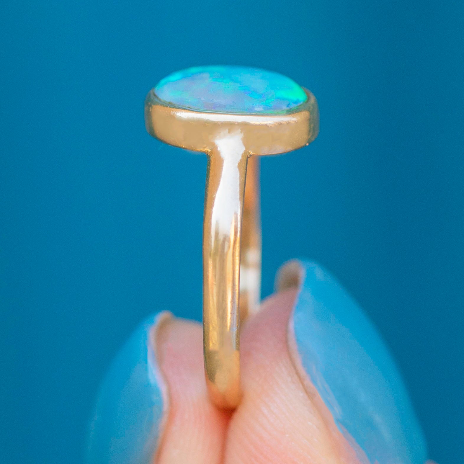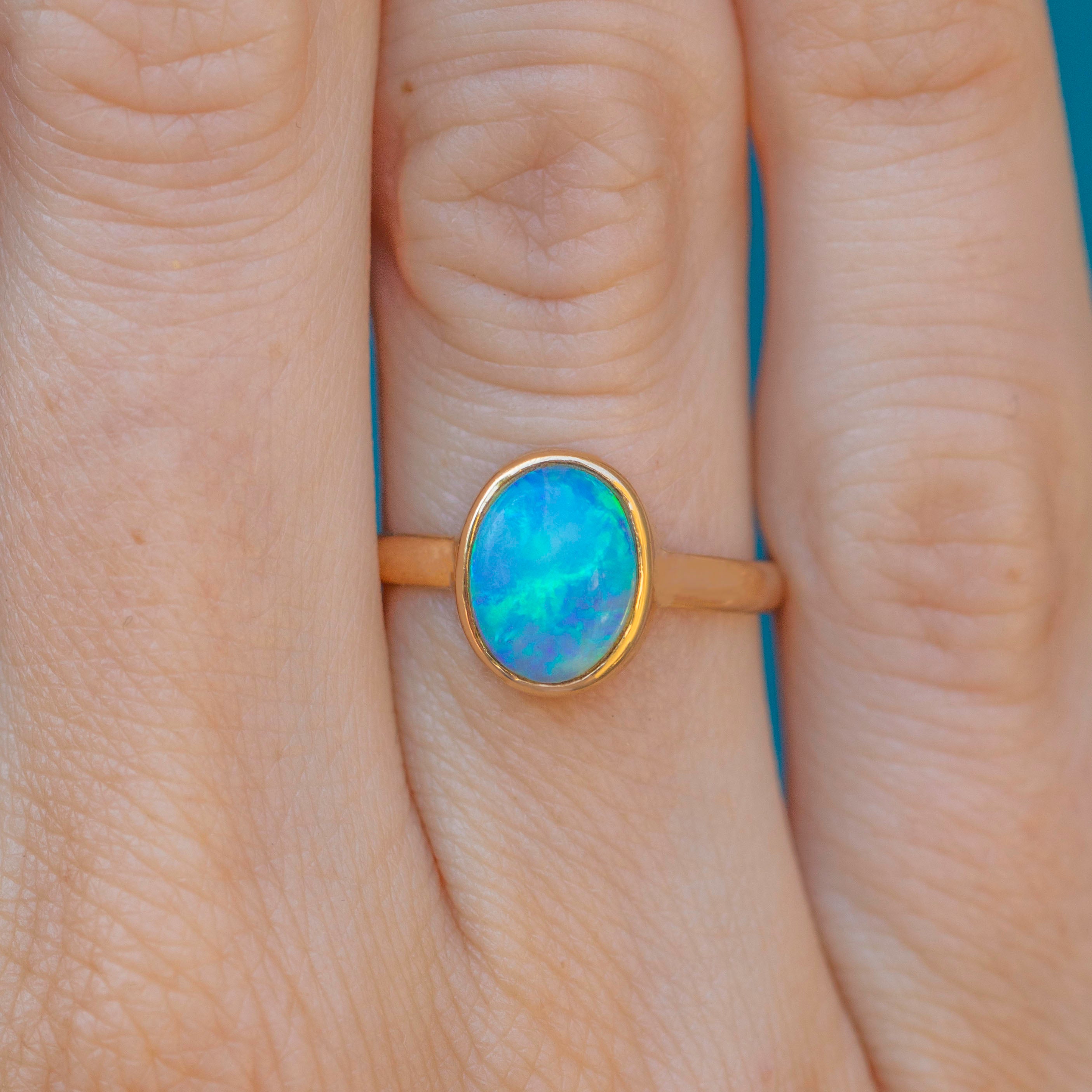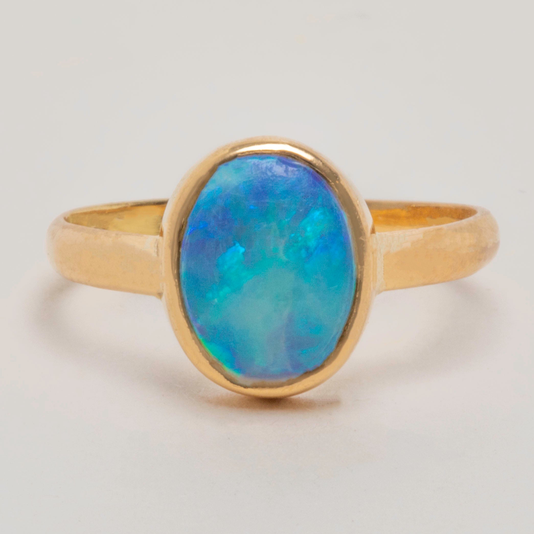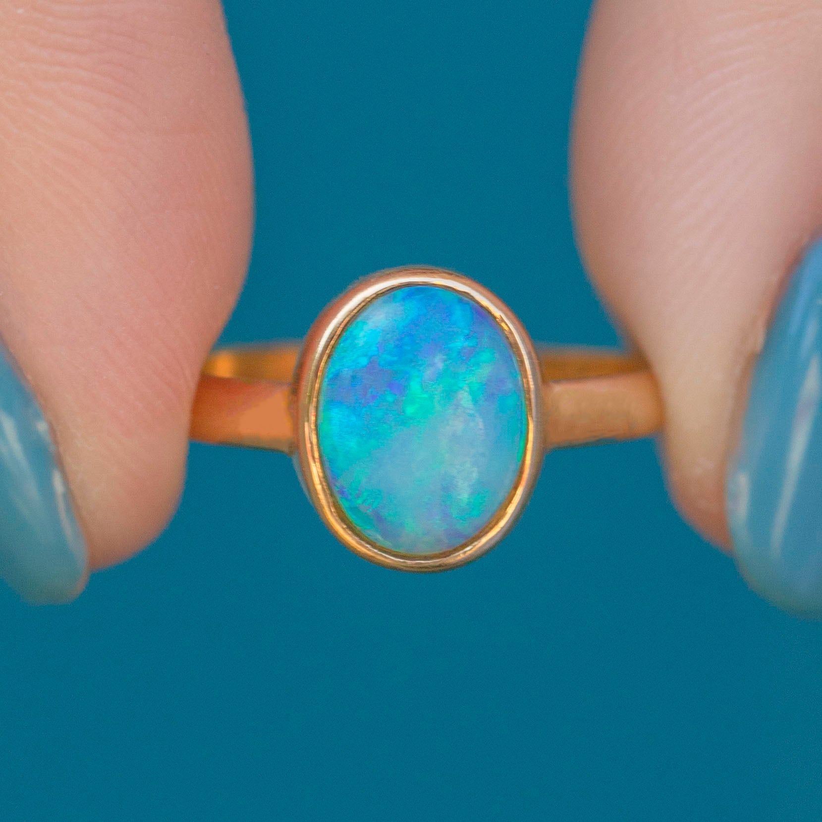 EXCELLENT. We are pleased to present this 18ct Gold Opal solitaire bezel-set ring in excellent condition! The Opal sits securely in the bezel setting, with no damage to her smooth cabochon cut to note. The bezel setting hugs the Opal with a rich and buttery hue that is securely soldered to the ring shank. With a well rounded ring band that is smooth to the touch, she can be worn with comfort and confidence!