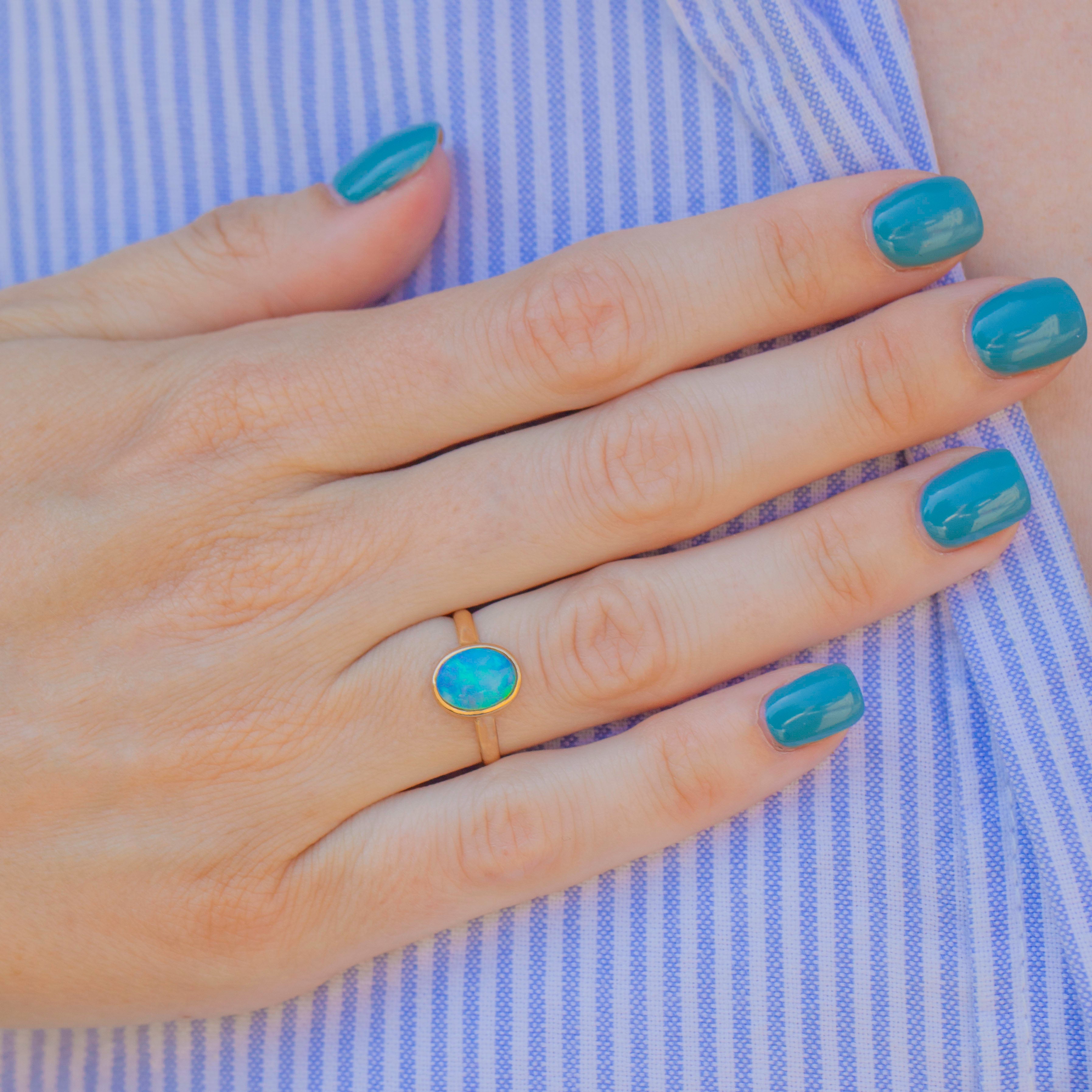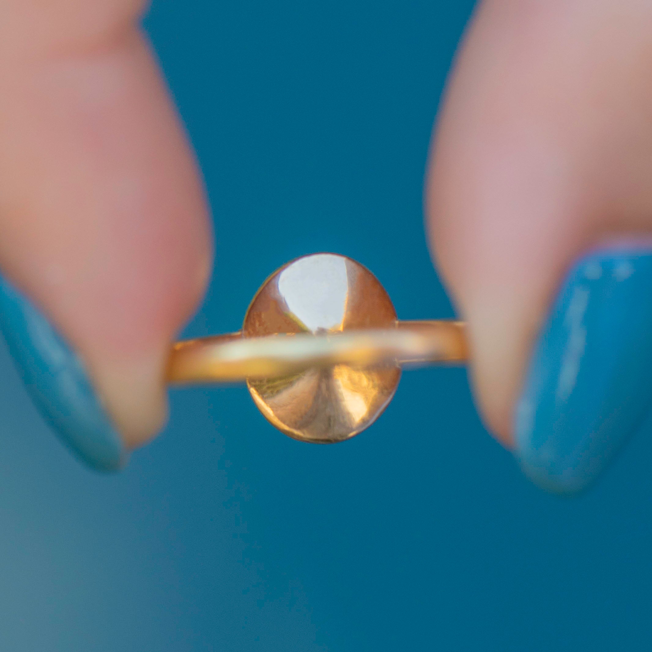 At a size J, she is the perfect size for a pinky ring, but that is not to say she cannot be resized if you think otherwise! Bound together in buttery 18ct Gold, the opulence radiates from this Victorian Opal ring. Complete with a domed setting back, she sits comfortably against your skin, designed with the wearer in mind.