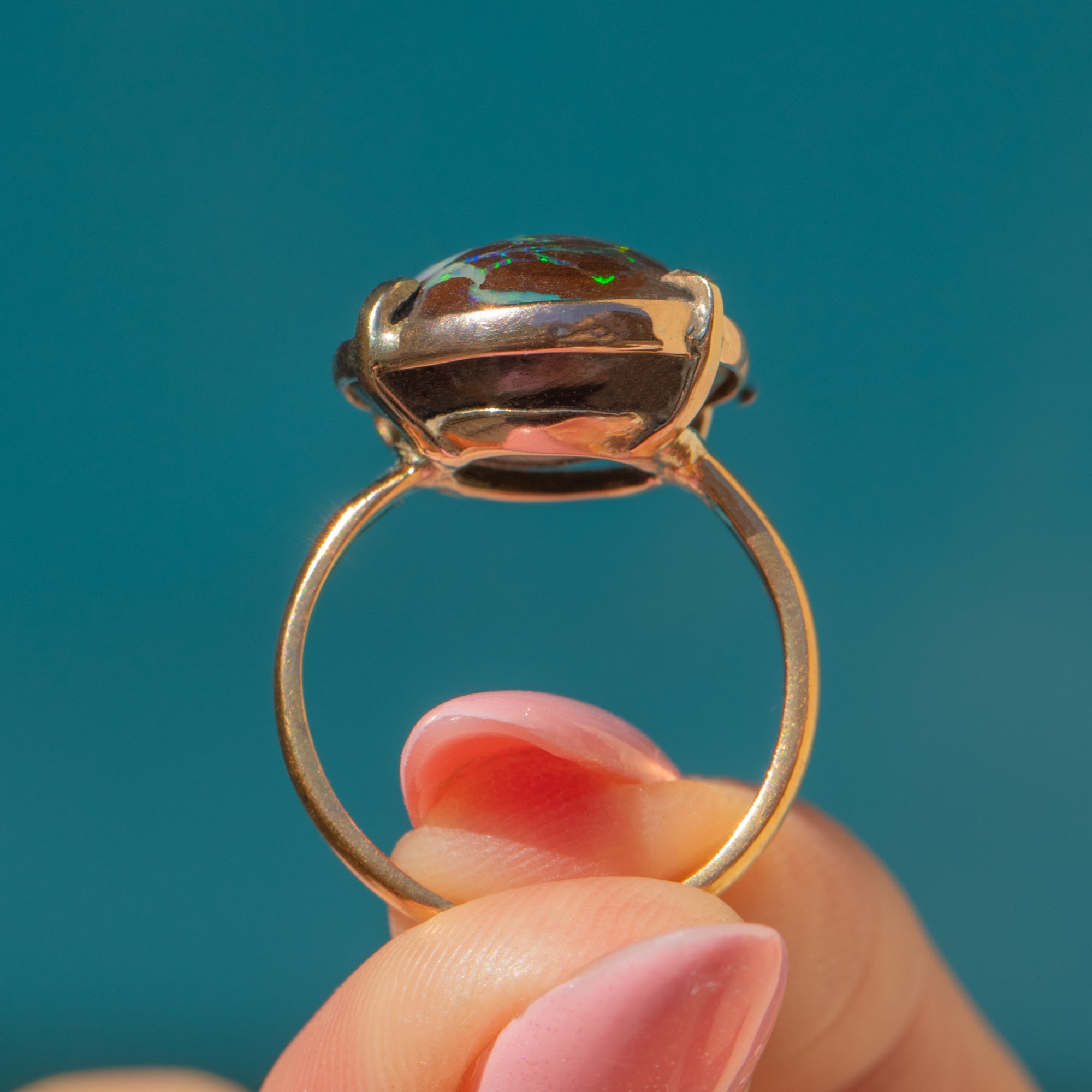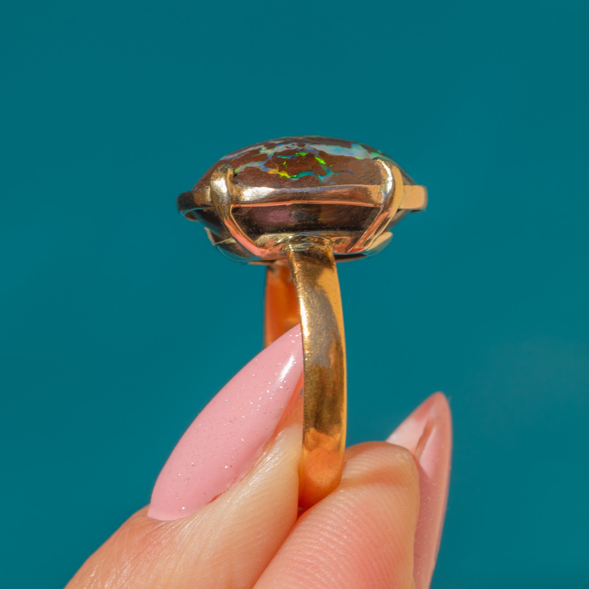 This 18ct Gold Boulder Opal dress ring is a beauty to behold! The smoothly cut Boulder Opal is mesmerising to look at, with sparkling electric blue, zingy greens, and pink hues peeking through her mahogany-toned surface.