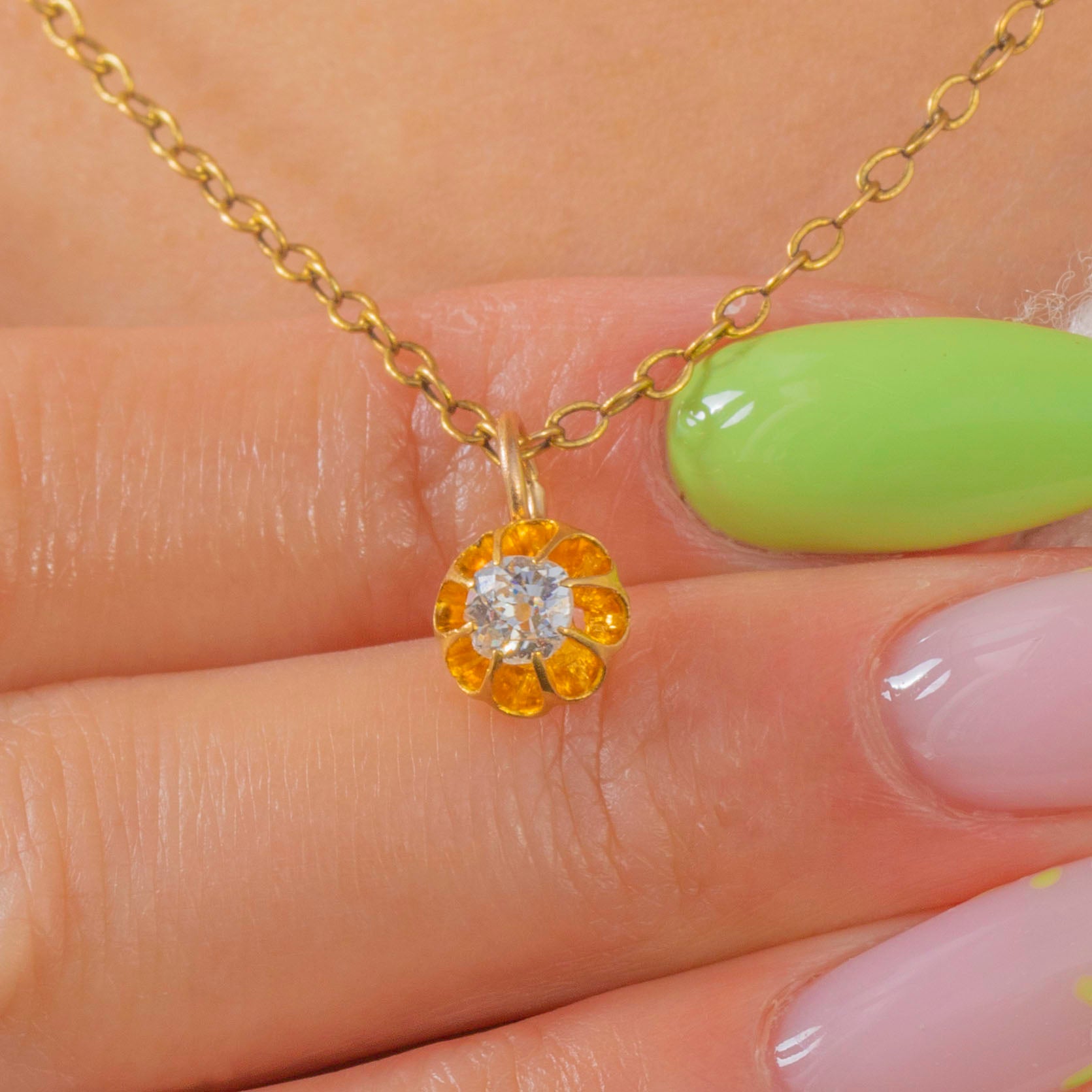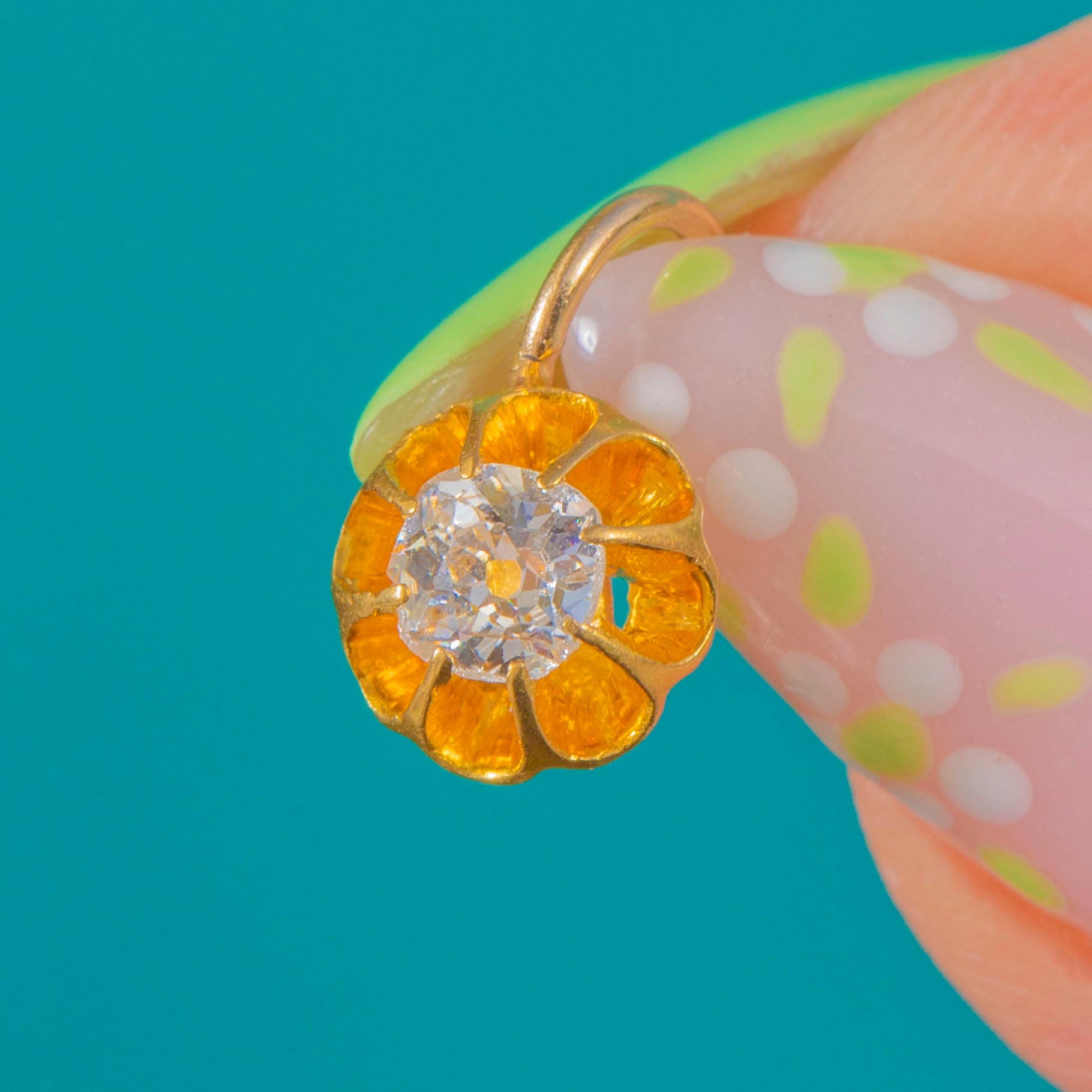 EXCELLENT: The Old Mine Cut Diamond is bright and secure with no obvious chips or abrasions. The buttercup setting and jump ring show only light, superficial surface wear commensurate with age. No visible repairs; a well-cared-for antique charm.