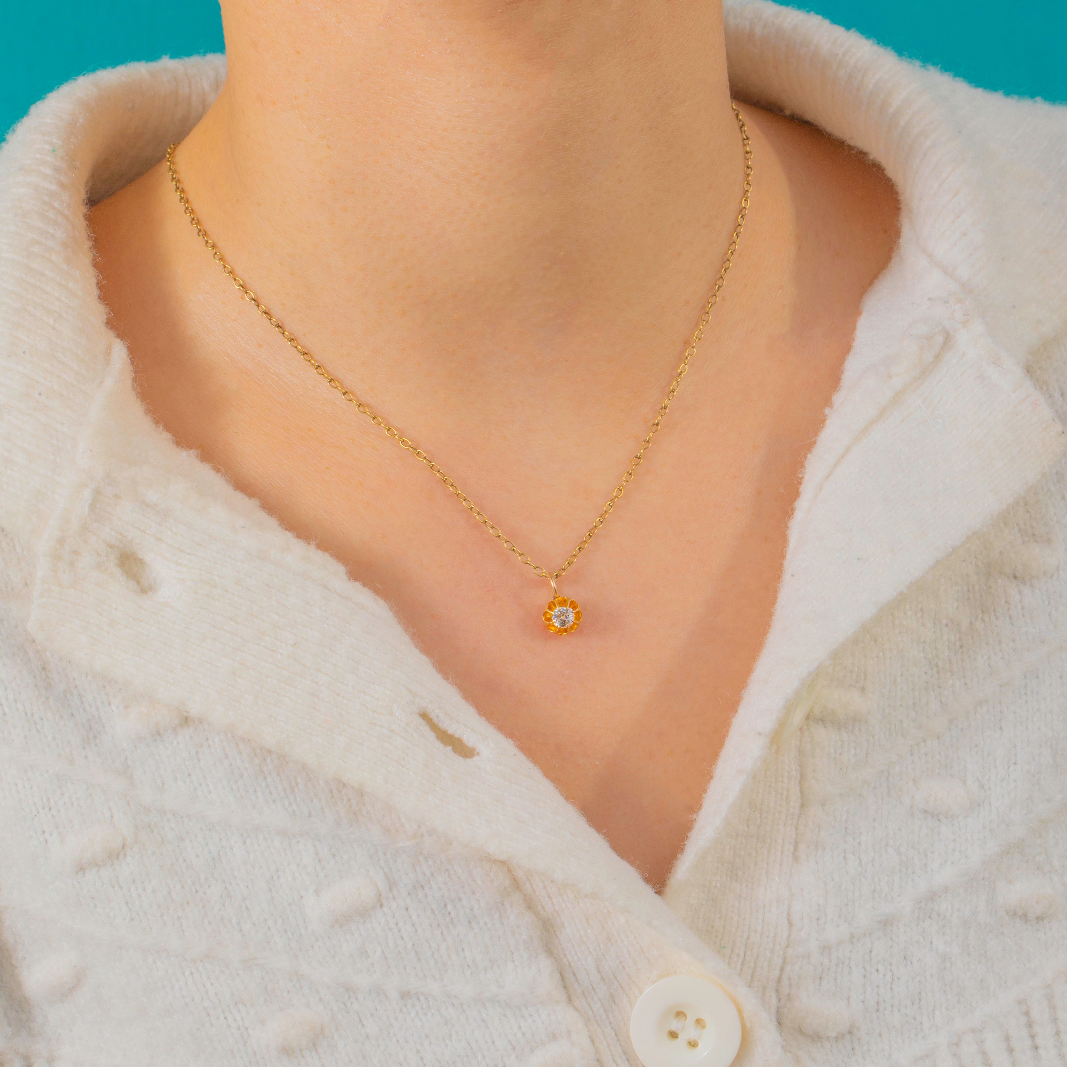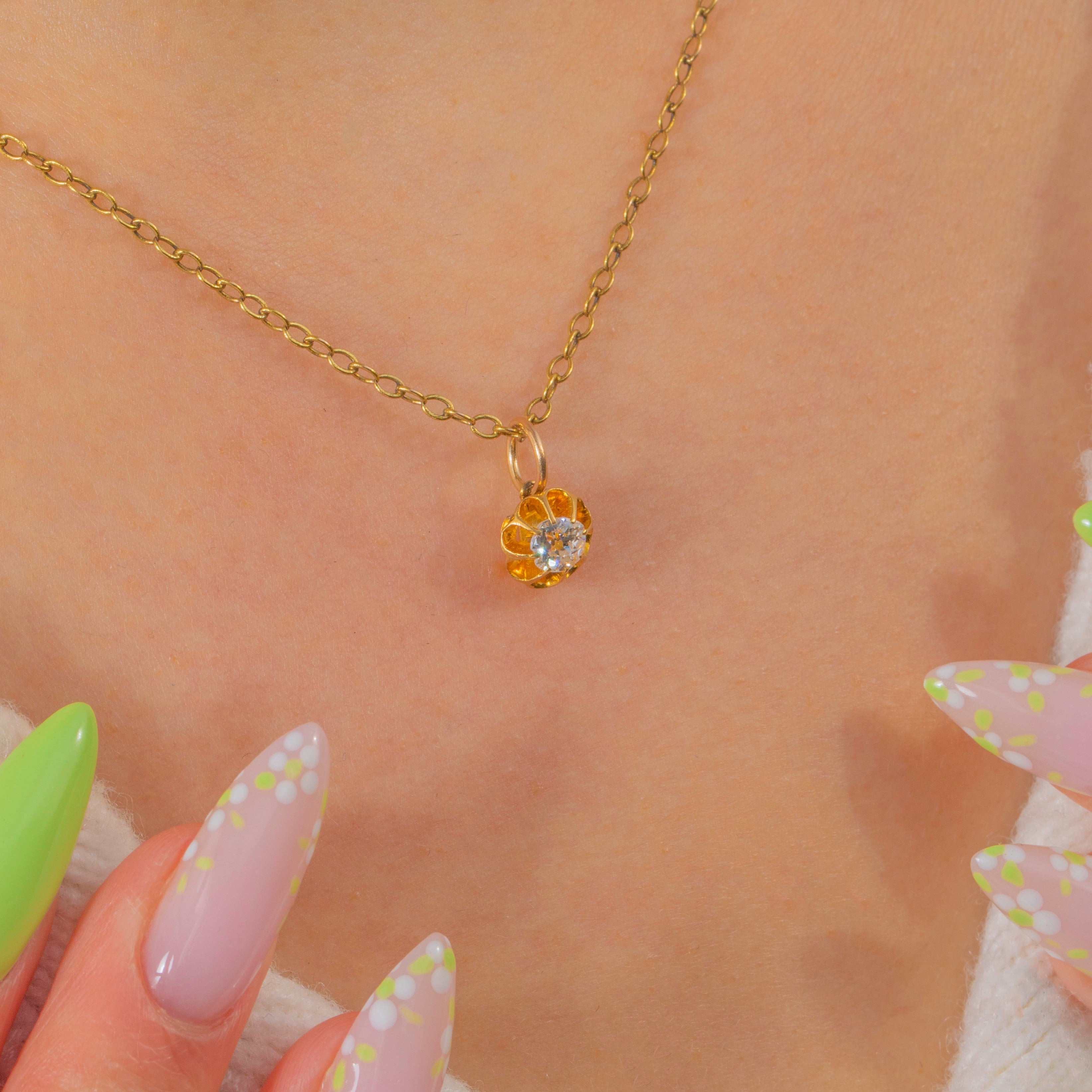 A petite Victorian buttercup charm in rich 18ct Gold, blooming with a 0.25ct Old Mine Cut Diamond. The scalloped buttercup setting cradles the antique-cut stone, its lively sparkle beautifully set off by the warm glow of high-carat Gold. Fitted with a 9ct Gold jump ring for effortless styling.