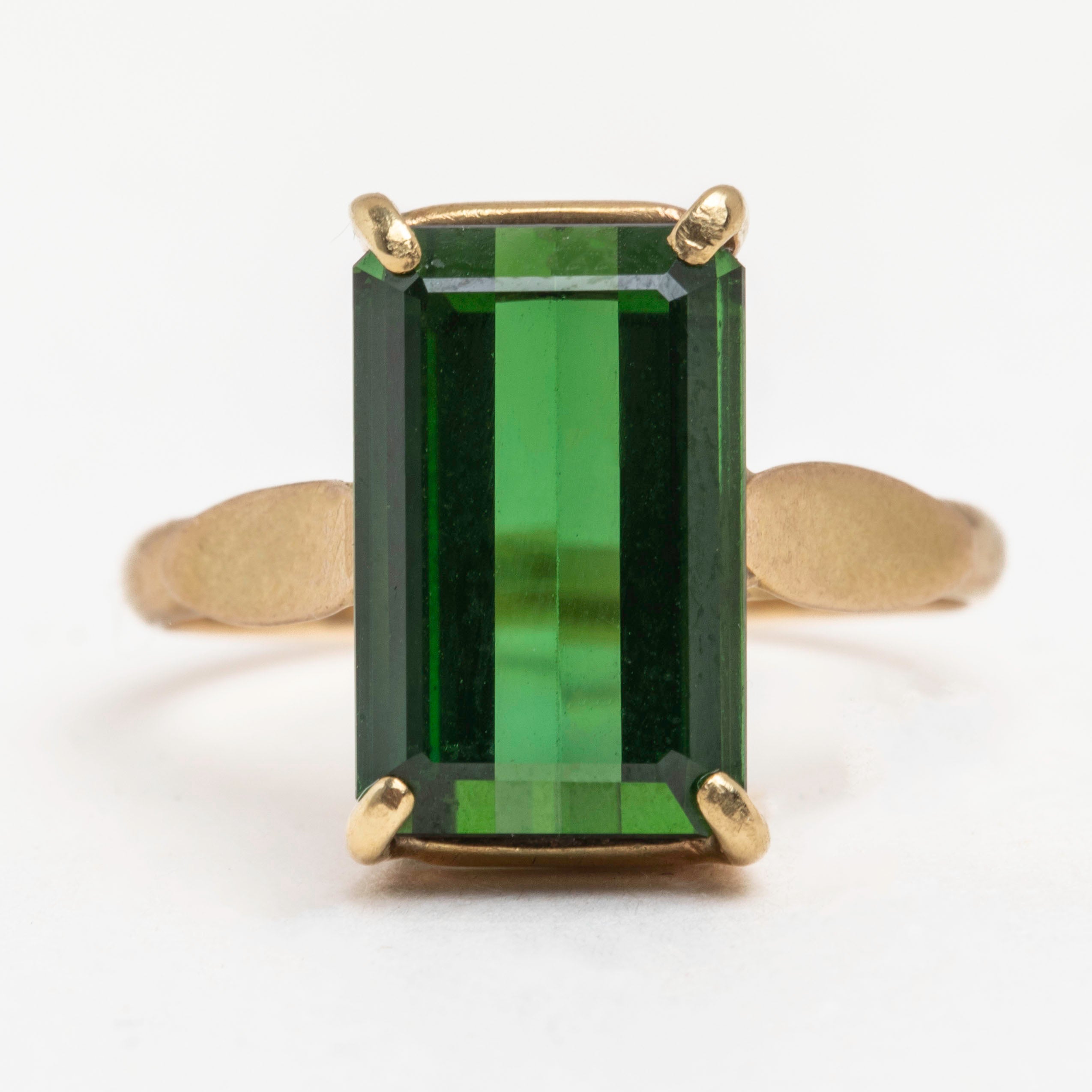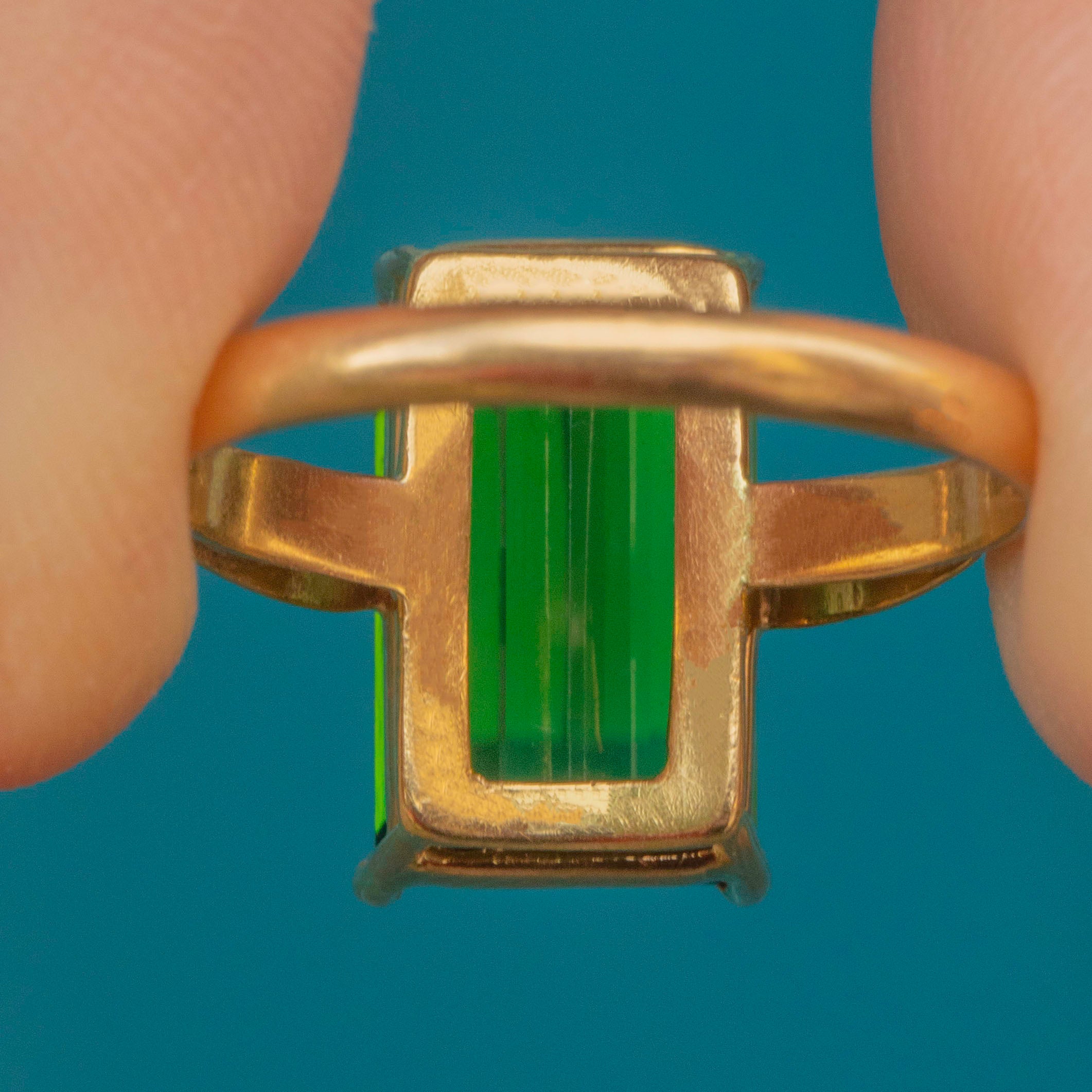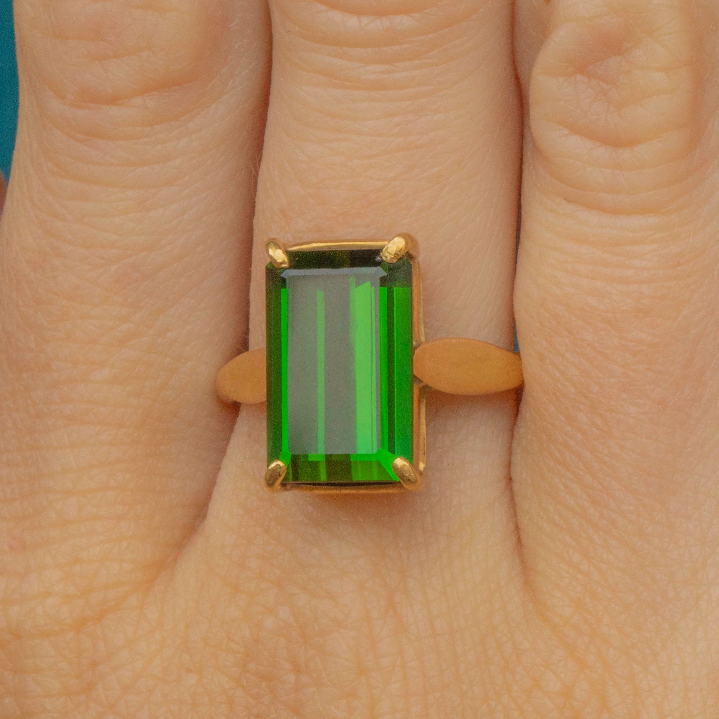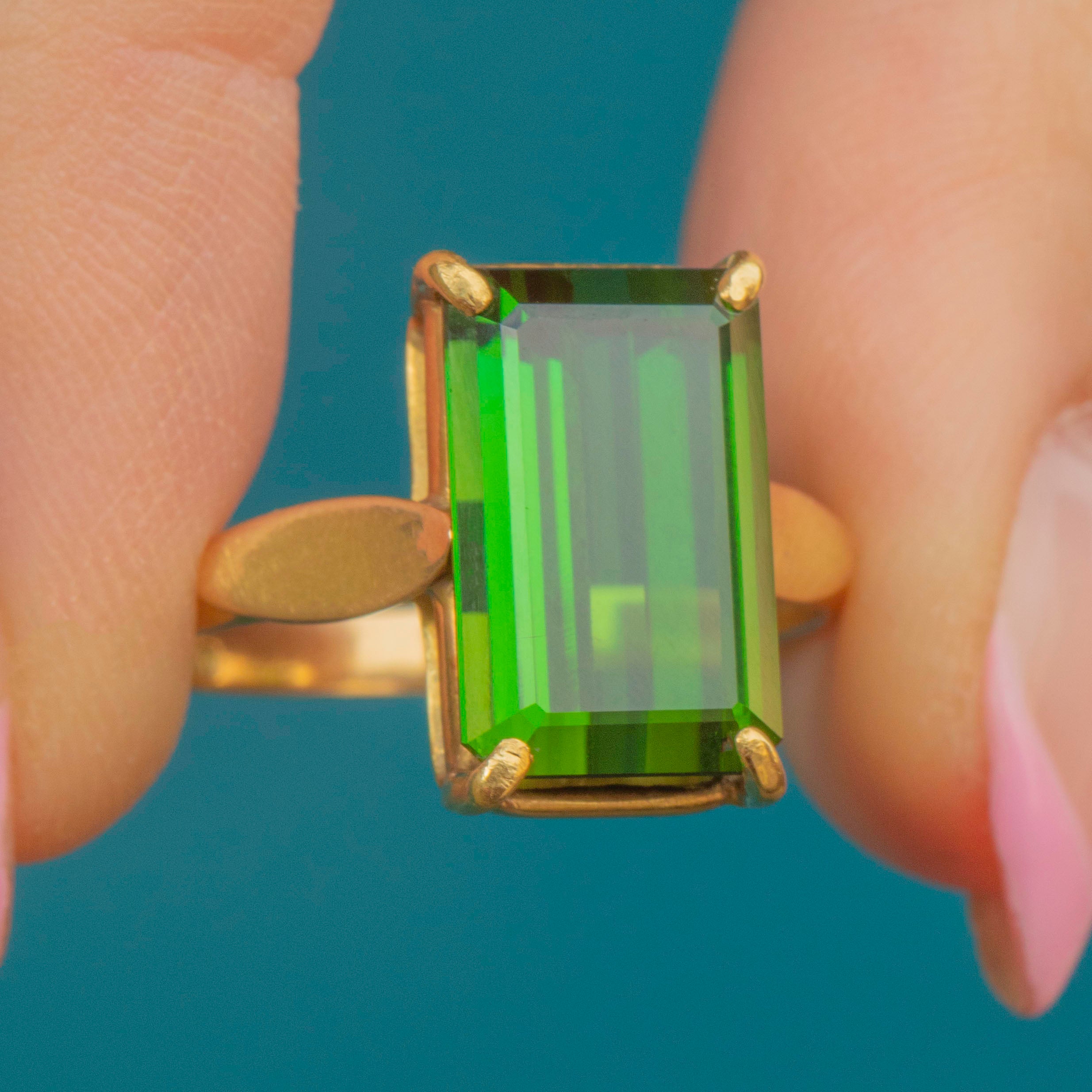 Expertly handcrafted, this rectangle Tourmaline perfectly fits with its architectural settings and amazing shoulders. The bright yellow band brings it all together to create a lovely, unique piece of Deco jewellery. If you're after an unusual and one-of-a-kind vintage engagement ring then look no further!