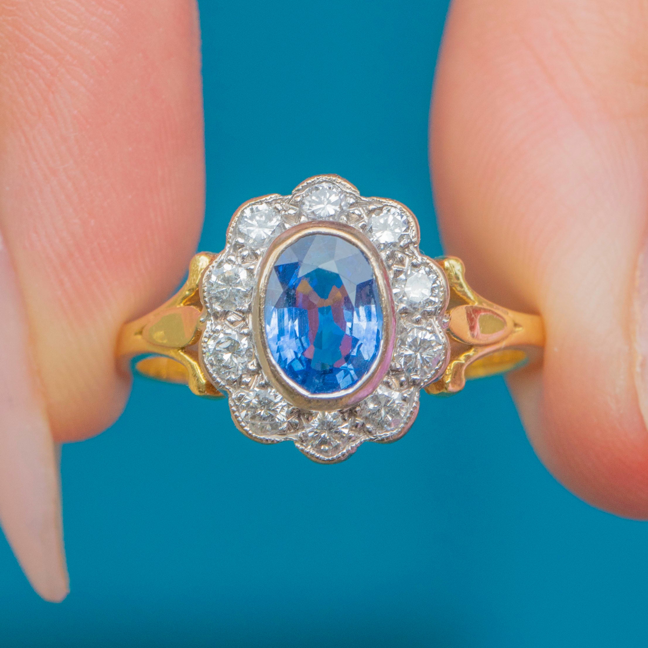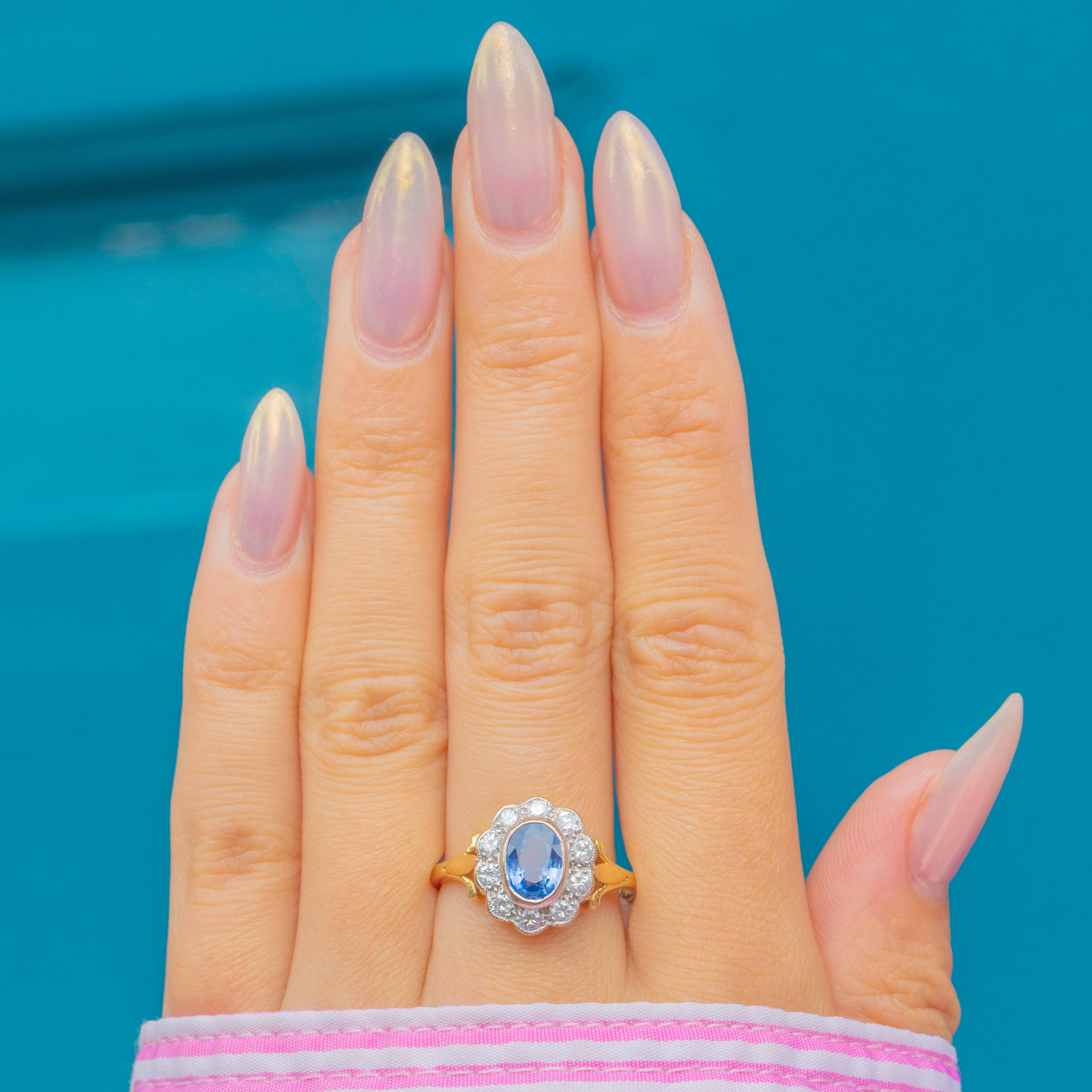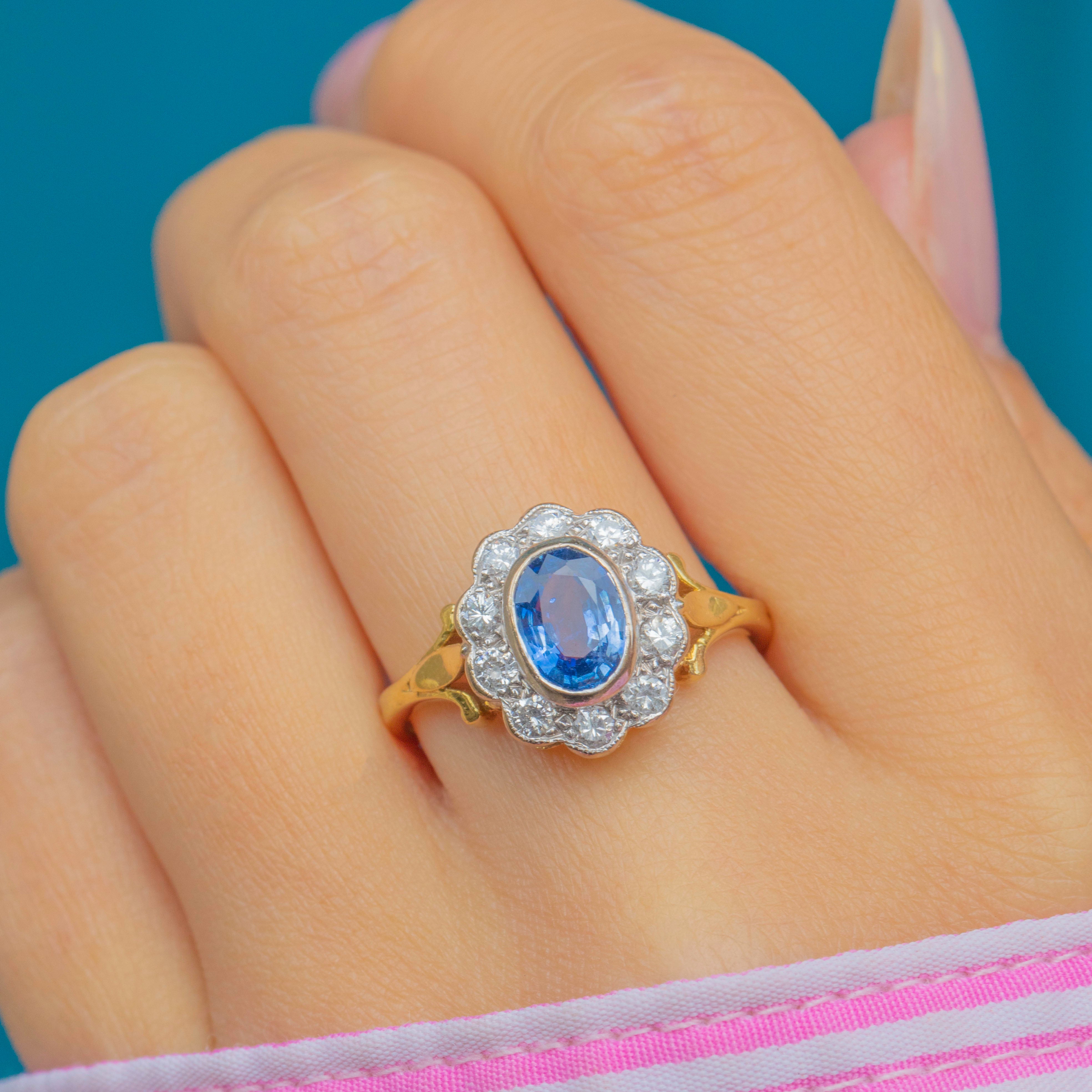 A luminous cornflower-blue Natural Sapphire takes centre stage in this classic Vintage cluster ring, framed by a bright halo of Diamonds. The oval stone sits in a softly scalloped setting that gives you all the sparkle of a traditional “daisy” without feeling fussy. Sculpted shoulders flow into a tapering 18ct Gold band—elegant, balanced, and made to flatter the hand.
