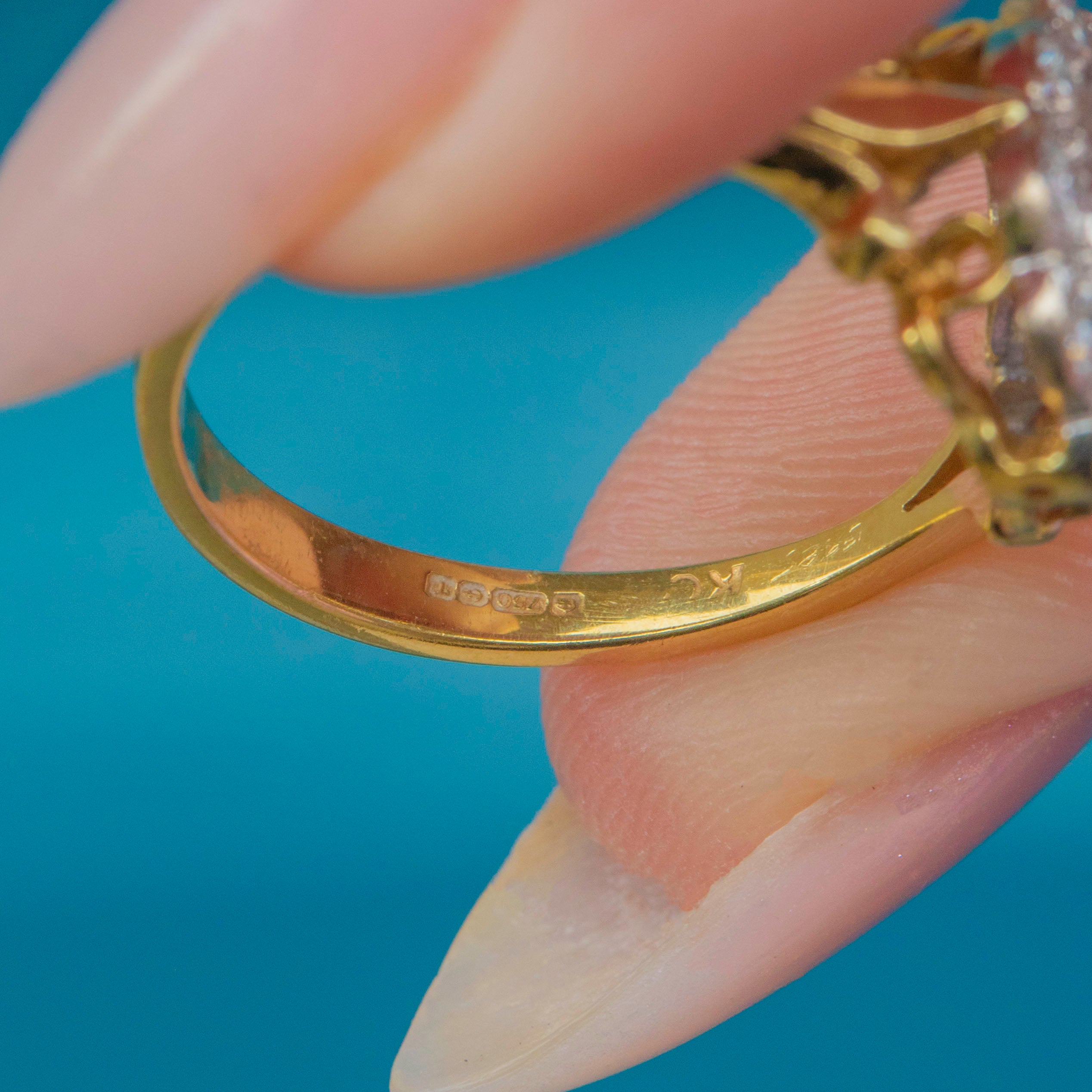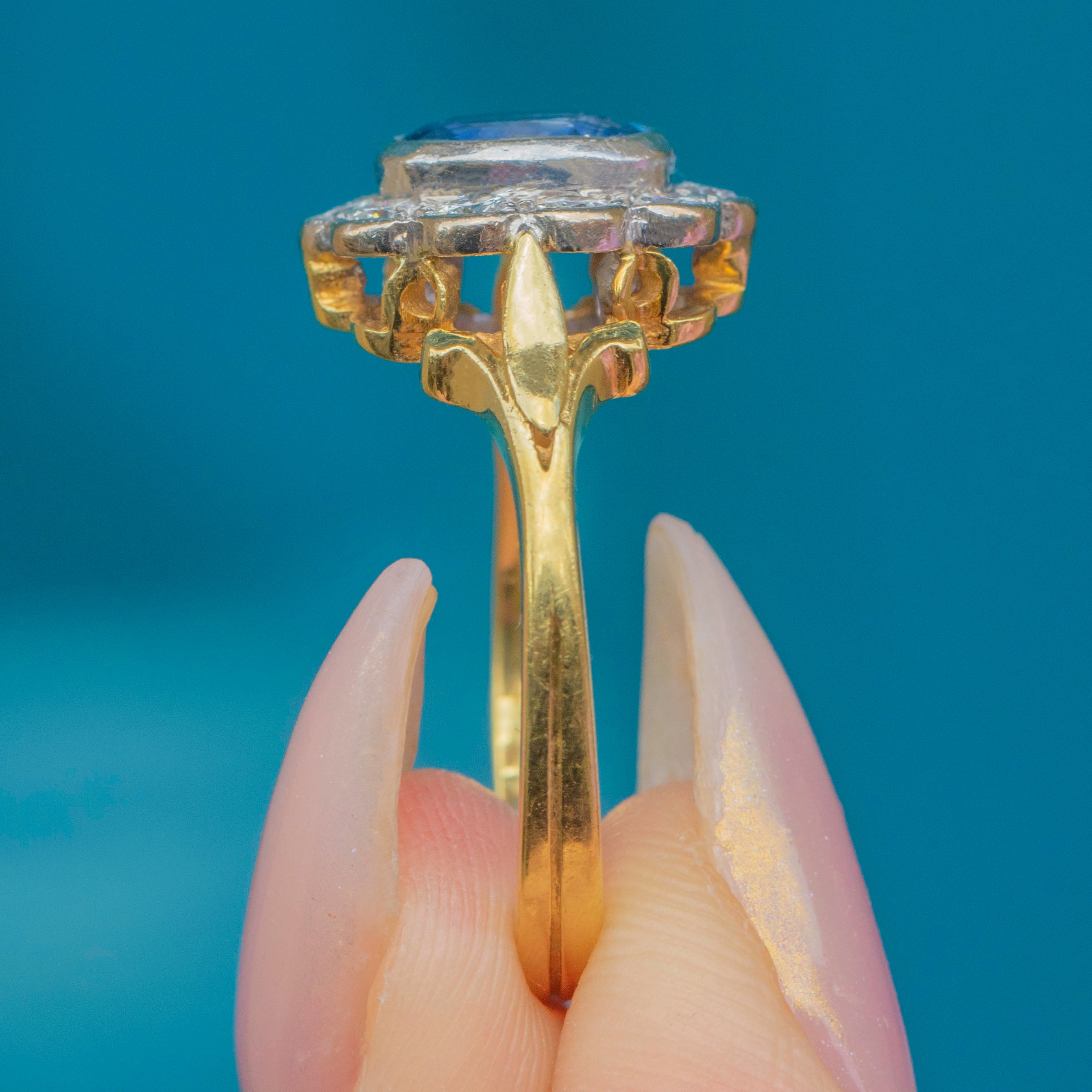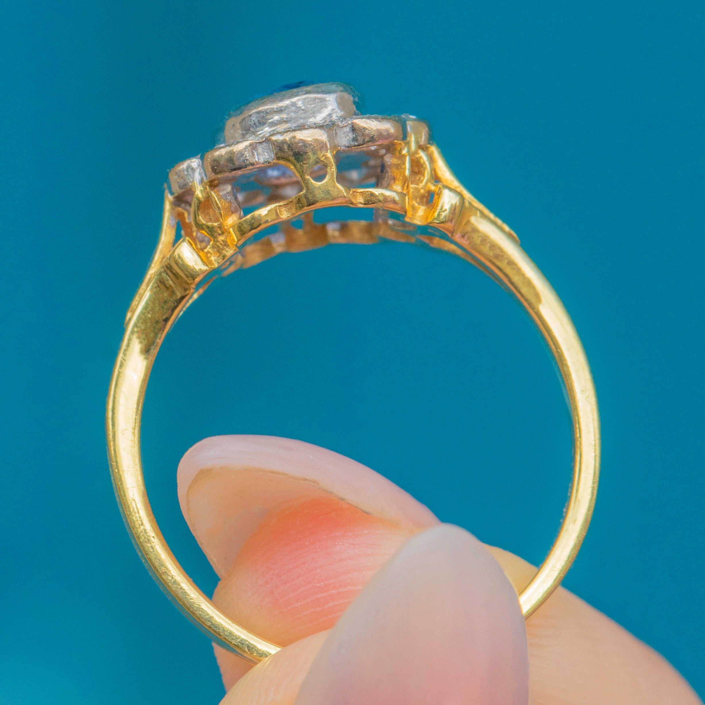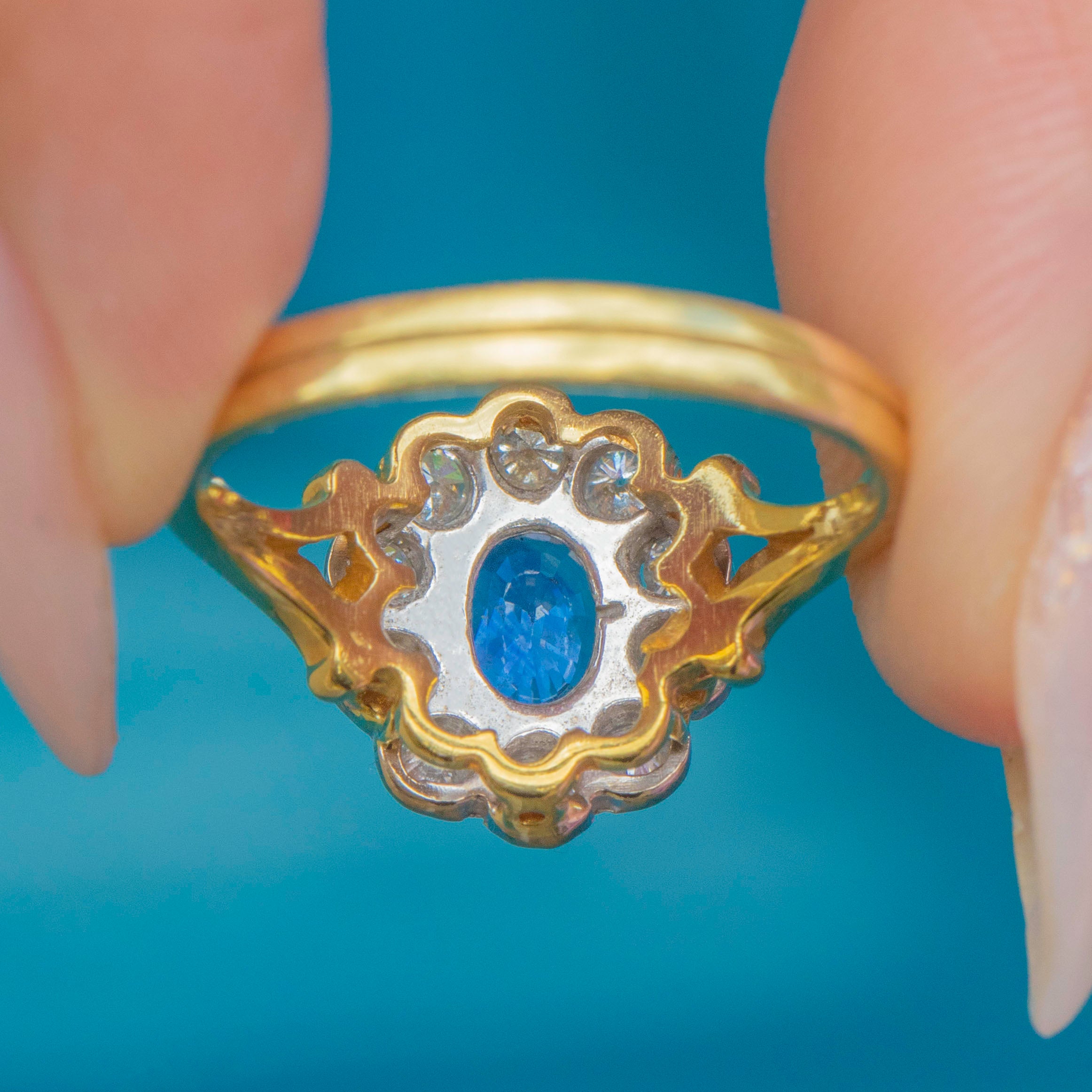 A luminous cornflower-blue Natural Sapphire takes centre stage in this classic Vintage cluster ring, framed by a bright halo of Diamonds. The oval stone sits in a softly scalloped setting that gives you all the sparkle of a traditional “daisy” without feeling fussy. Sculpted shoulders flow into a tapering 18ct Gold band—elegant, balanced, and made to flatter the hand.