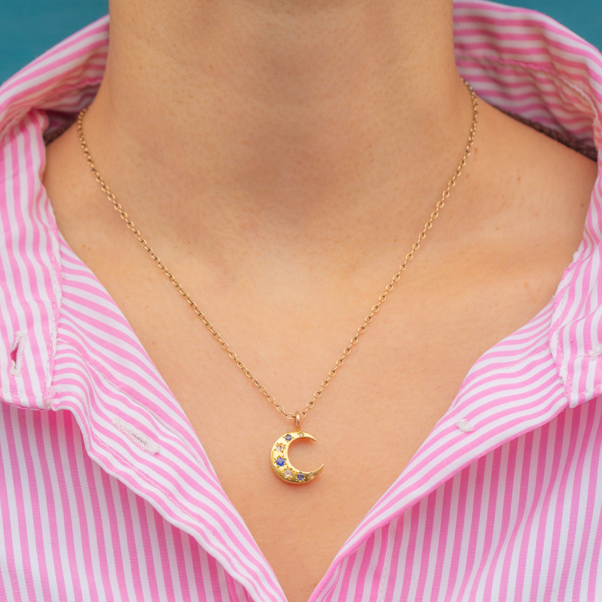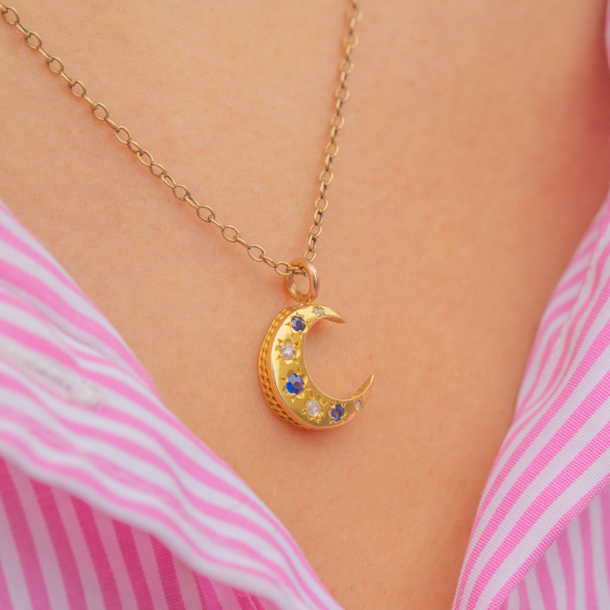 This charming Victorian crescent pendant glows in rich 18ct Gold, sparkling with alternating Blue Paste stones and Natural Diamonds. The elegant graduated gemstones catch the light beautifully, creating a celestial shimmer that captures the romance of the night sky.