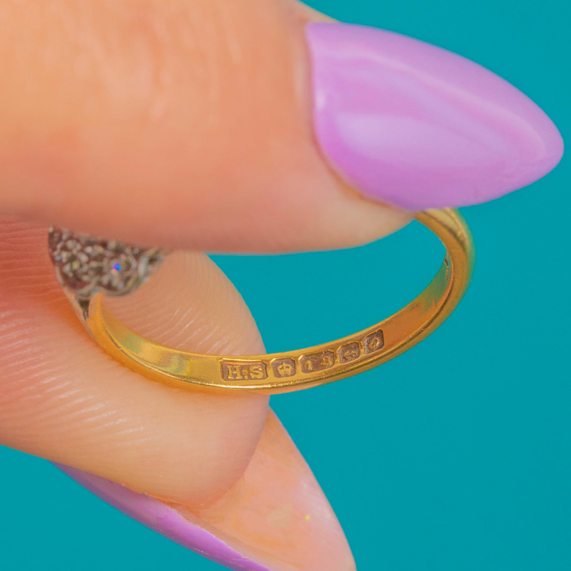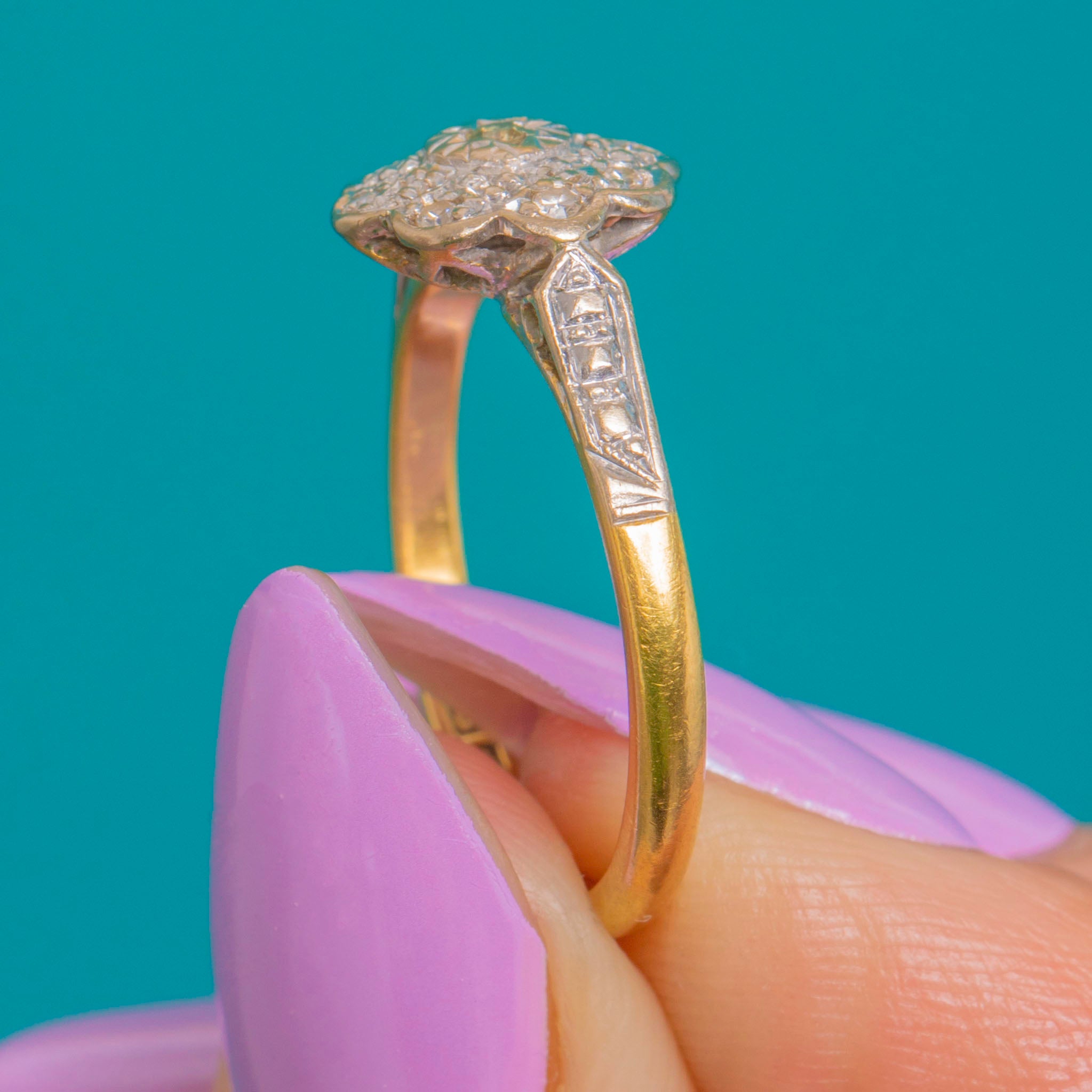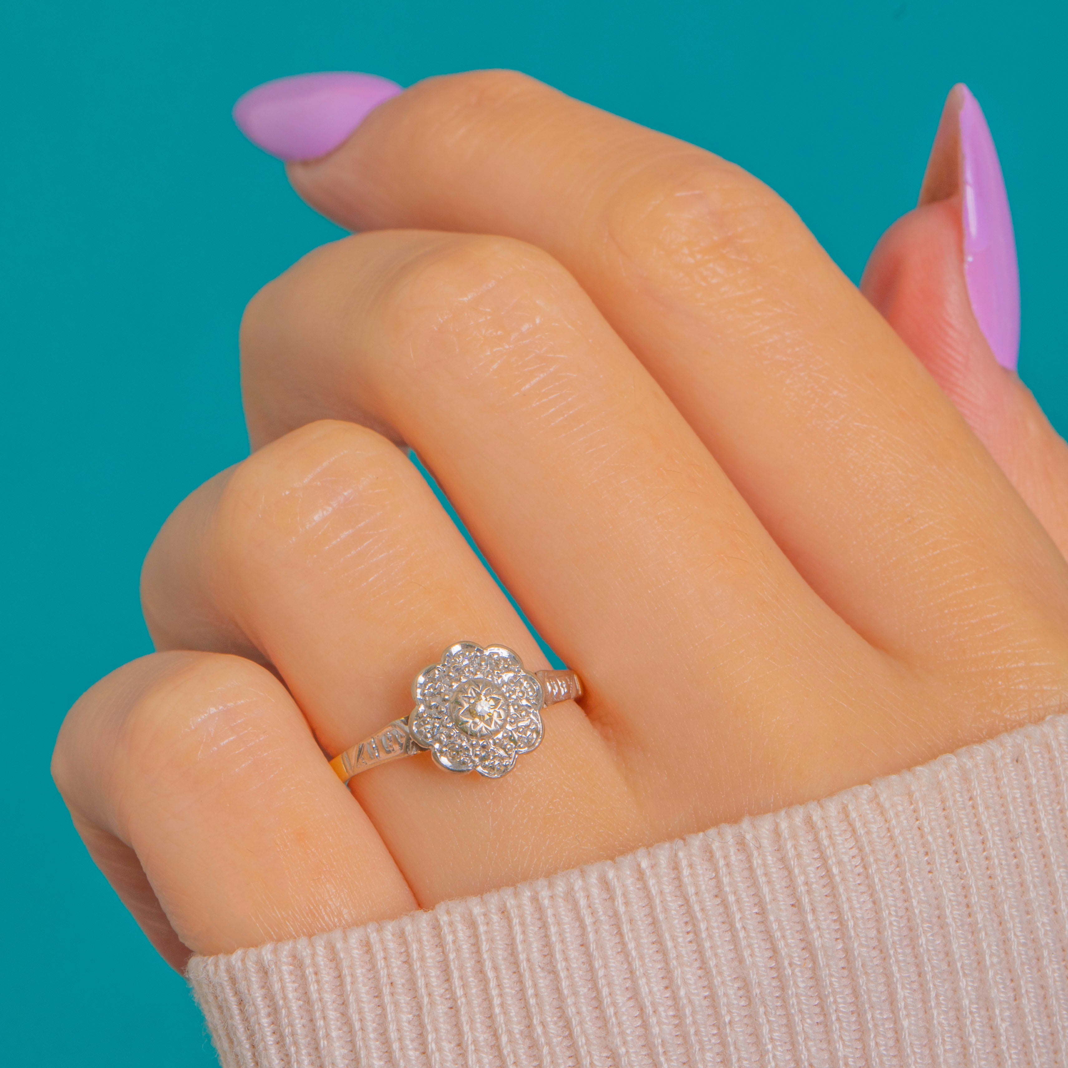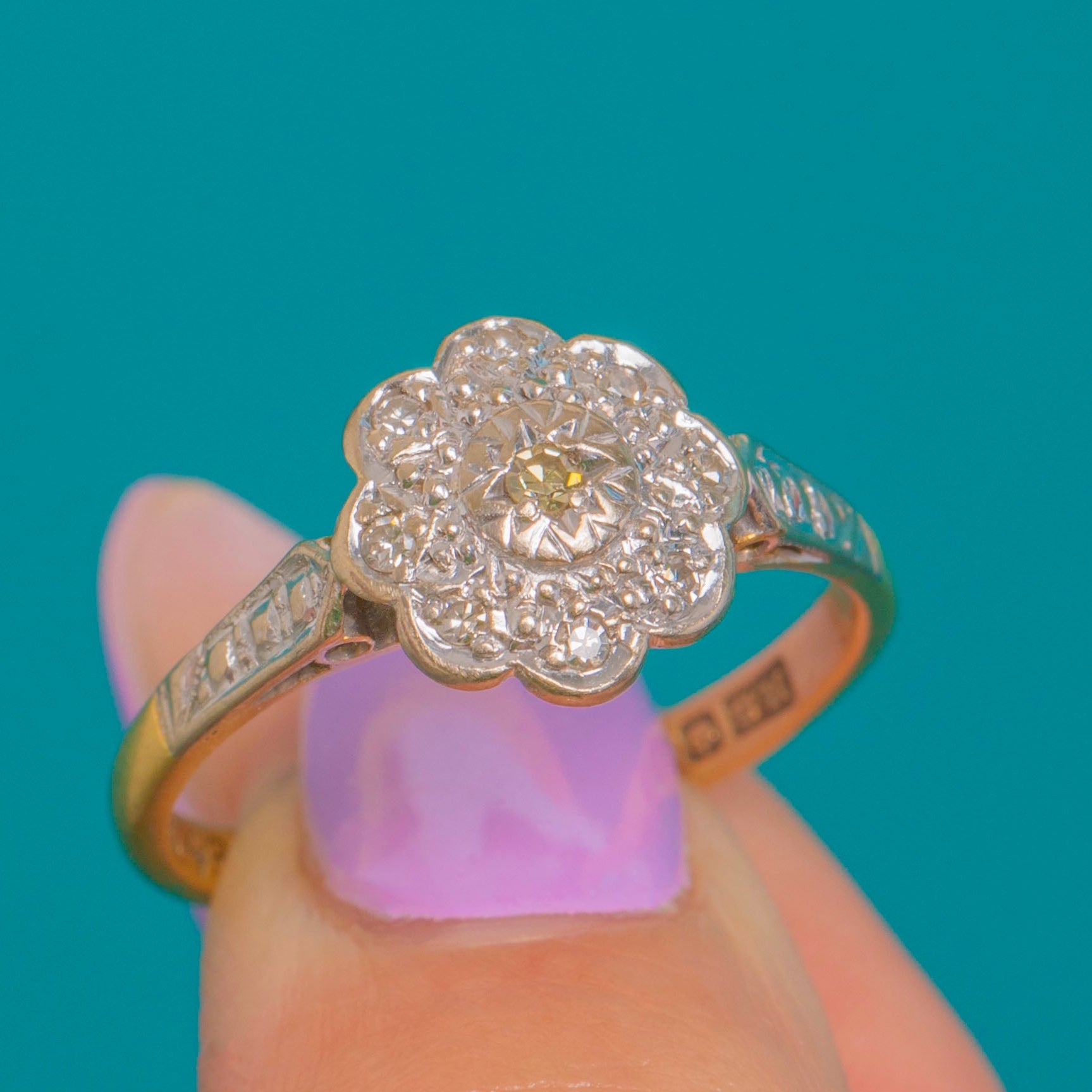 A charming Mid-Century 18ct Gold Diamond flower cluster ring with a delicate daisy silhouette. A bright, white‑toned scalloped head is set with nine lively Diamonds and framed by fine milgrain, lifted on a pretty pierced gallery. The slender yellow Gold shank with subtle engraved shoulders completes this feminine, timeless design.