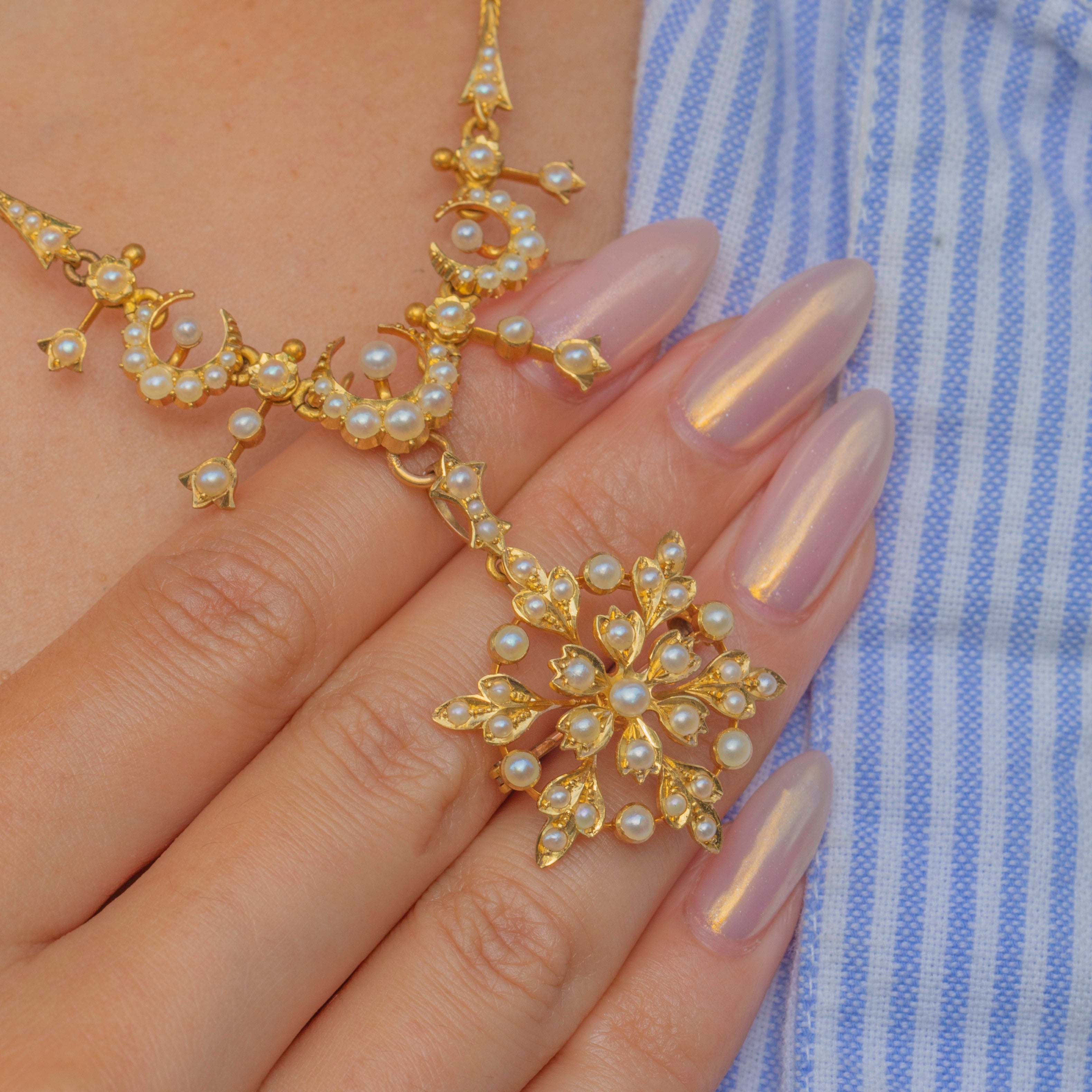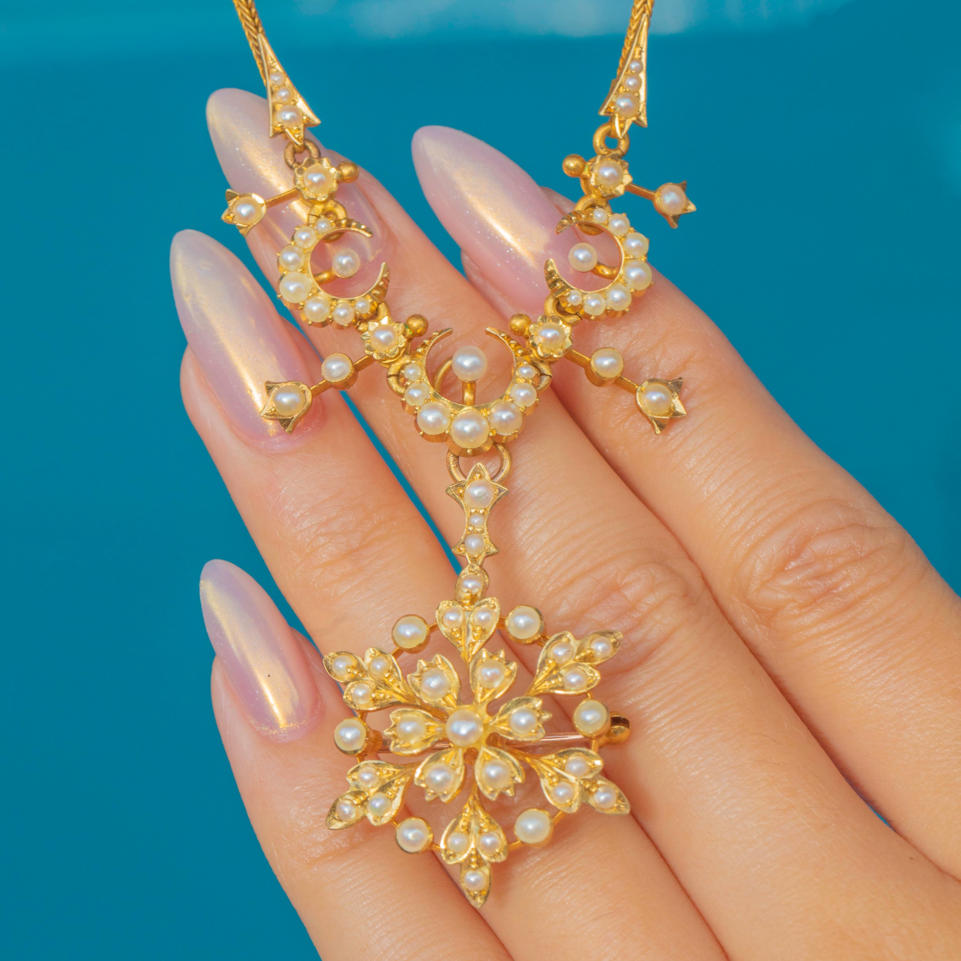 18ct Gold Edwardian Pearl Flower Necklace with Crescent Moon Details - Removable Pendant
