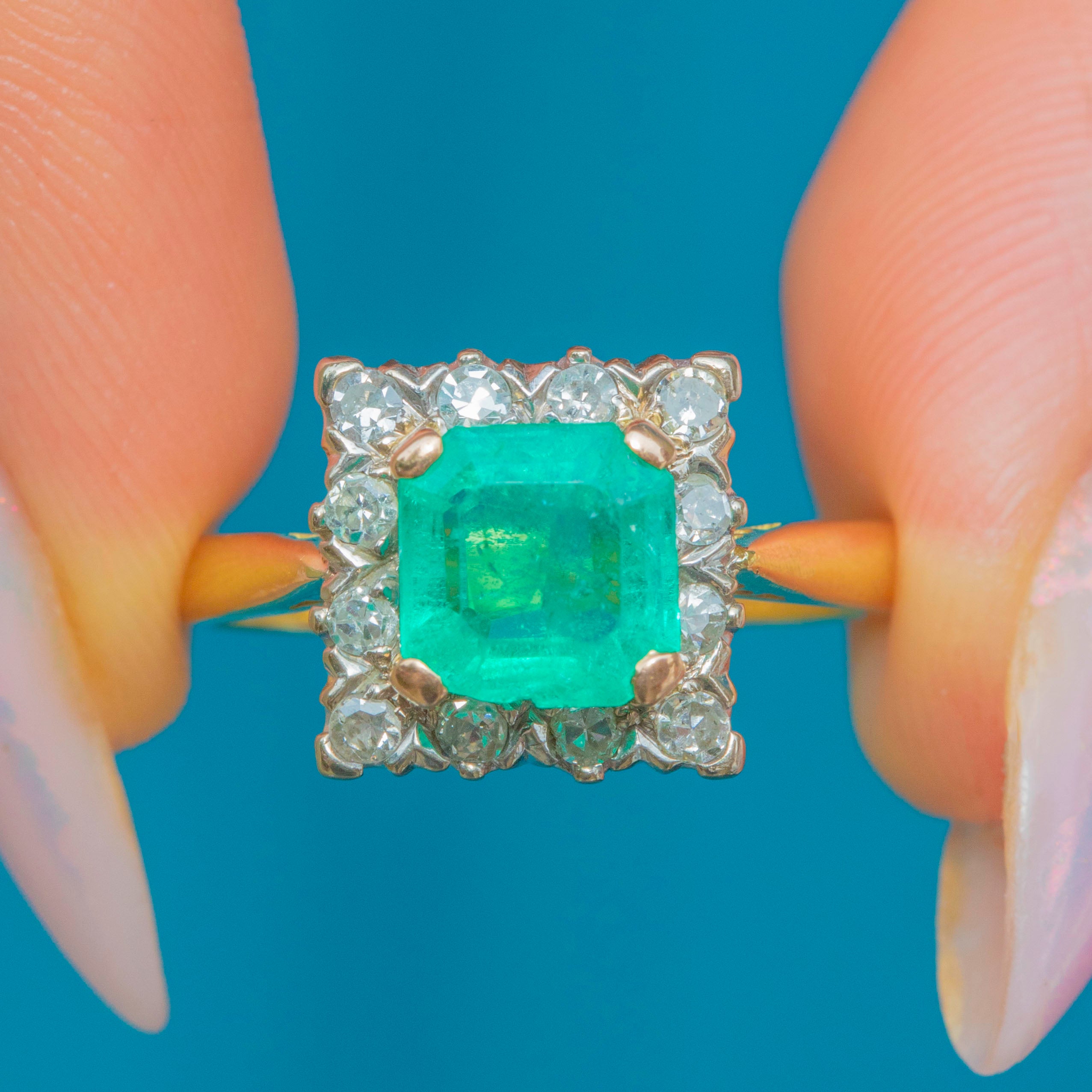 This exquisite vintage 18ct Gold ring features a striking 0.85ct square-cut Emerald at its heart, glowing vibrant minty green hues that shimmer beautifully in the light.