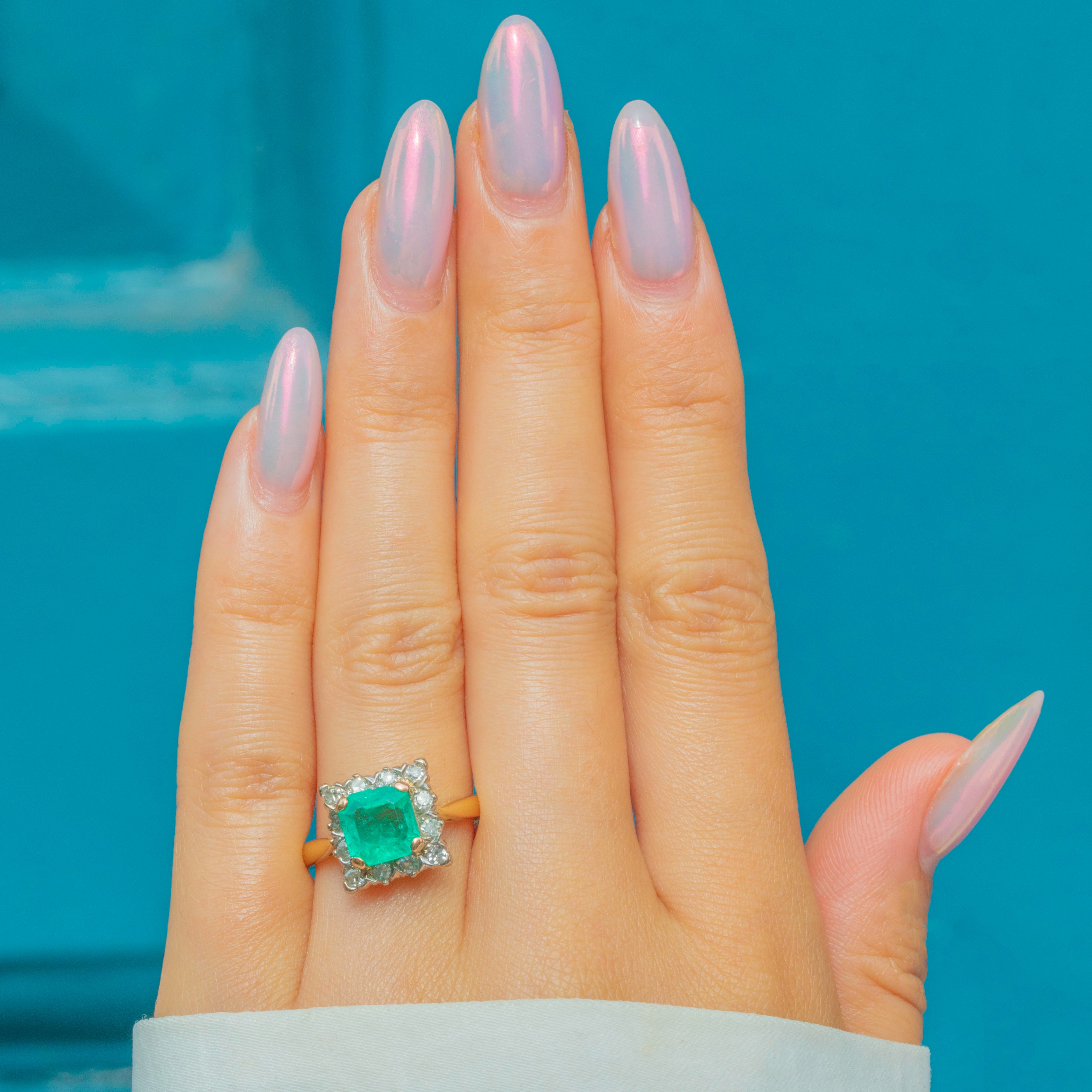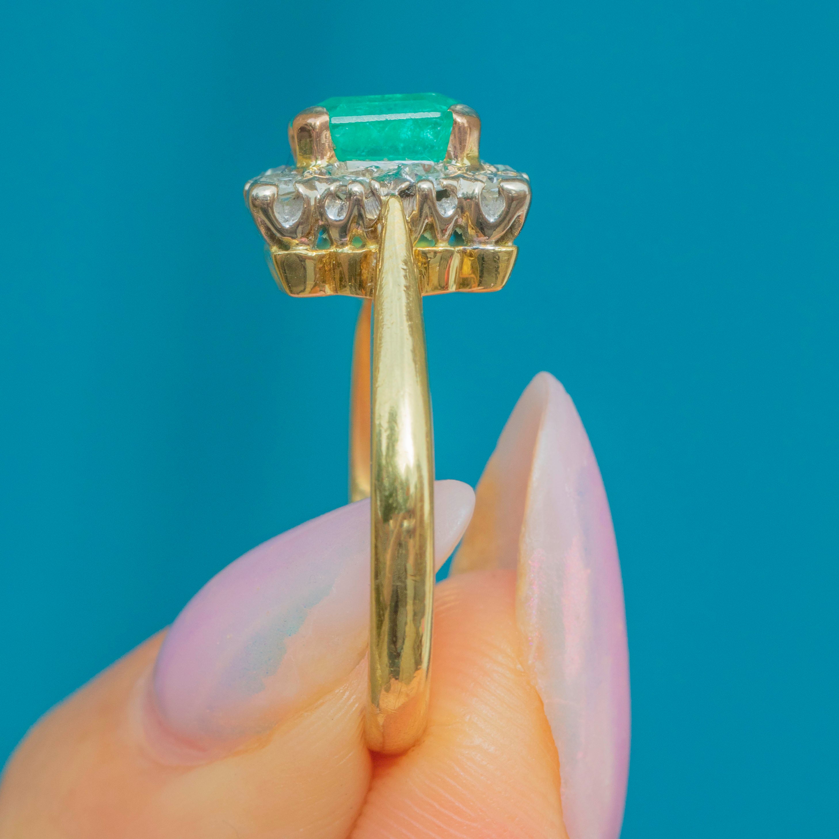 Surrounding the Emerald is a halo of sparkling 0.30ct Diamonds set in glossy 18ct White Gold, enhancing the brilliance of the central gemstone. Complete with a bright and buttery 18ct Yellow Gold band, this vintage cluster ring is a timeless treasure!