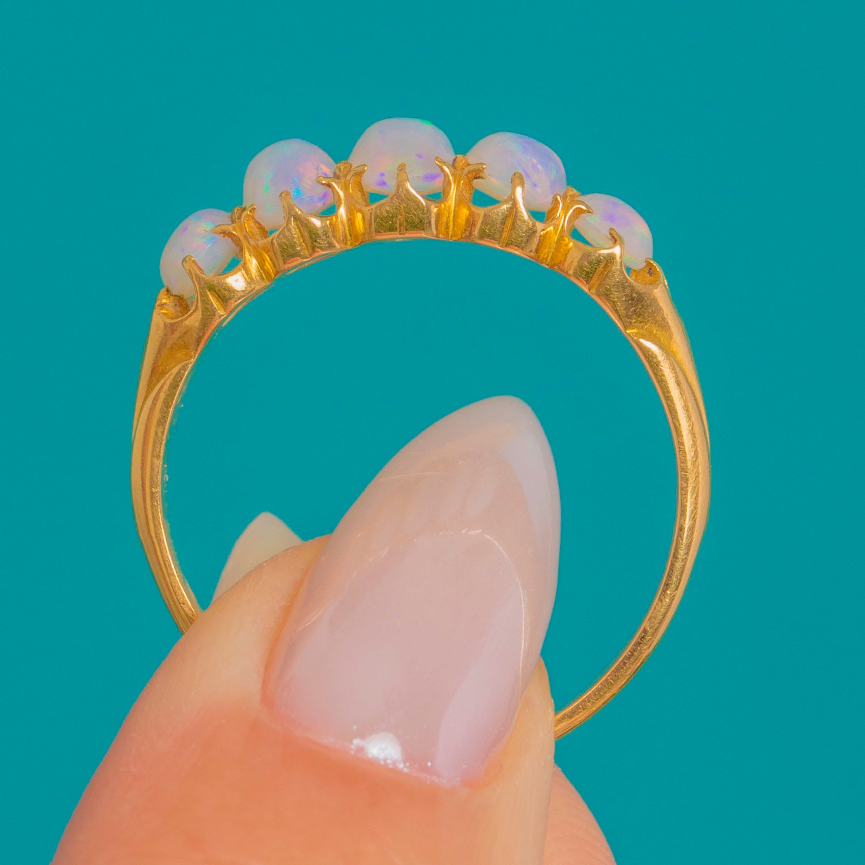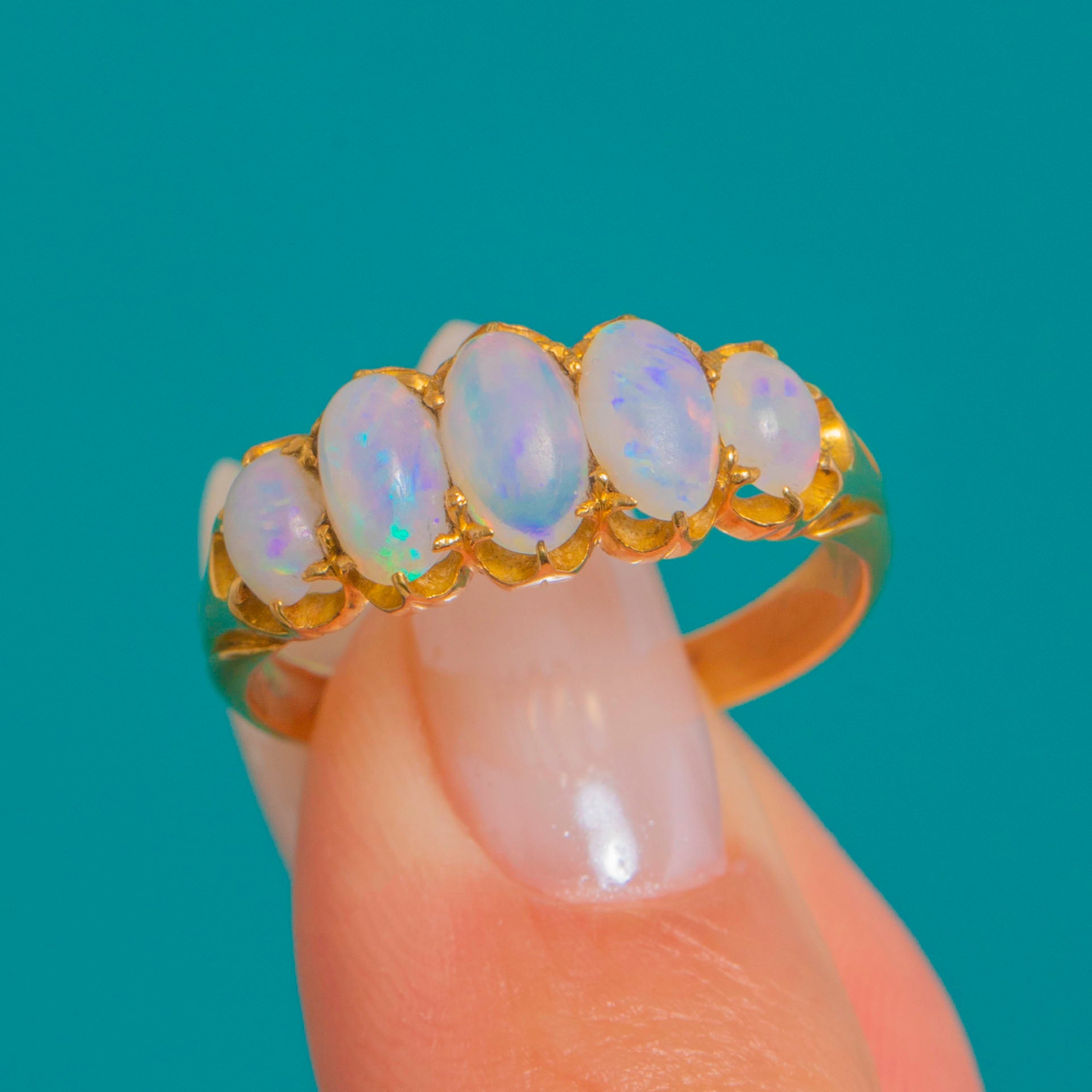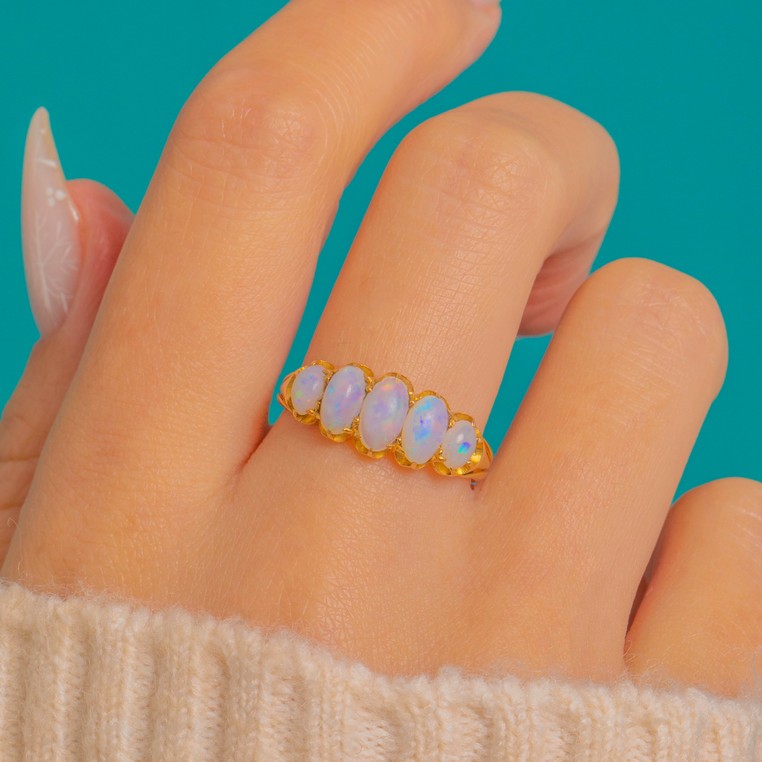 A romantic Victorian five-stone Opal ring glowing with pastel fire. Graduated oval cabochons dance with blue, green, pink and lilac flashes, punctuated by a whisper of orange, all cradled in scalloped buttercup settings for a pretty crown-like edge. The open, pierced gallery invites the light in, while the low profile and tapering 18ct Gold shank make it as wearable as it is beautiful.
