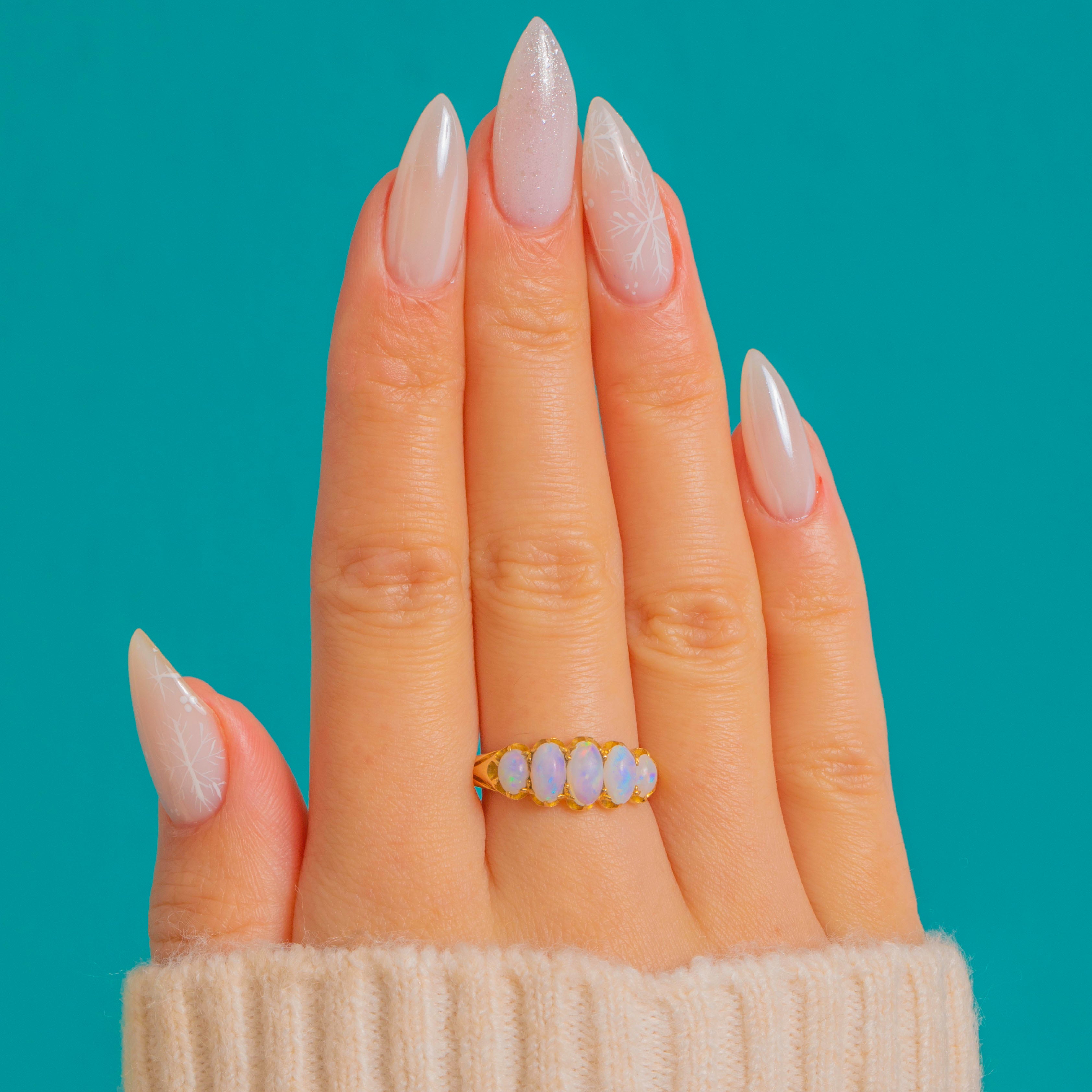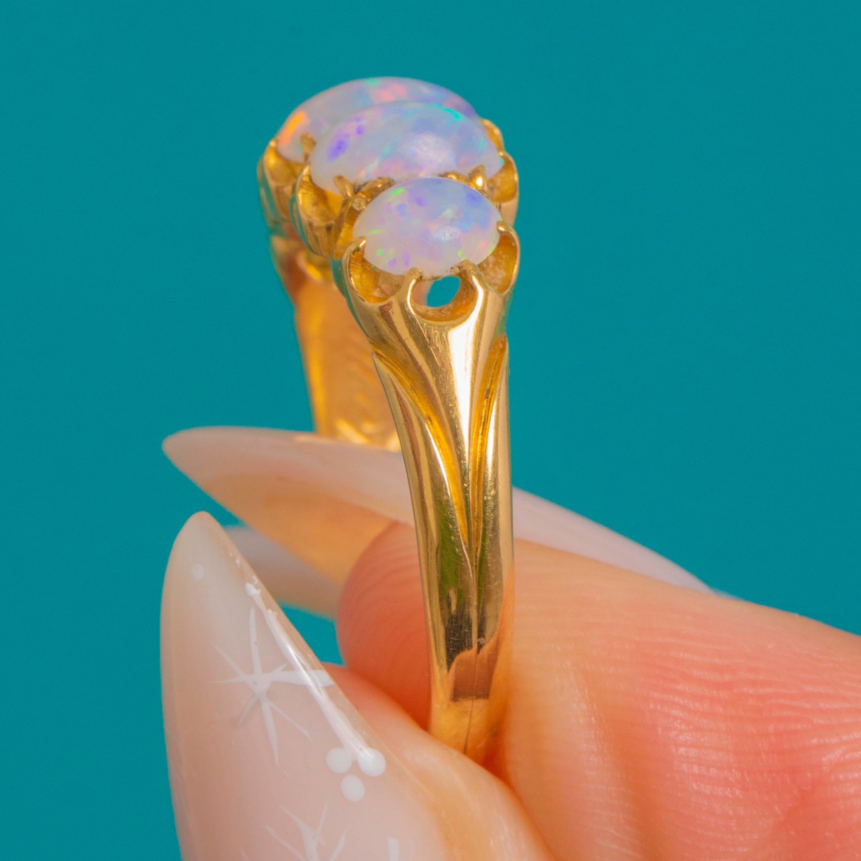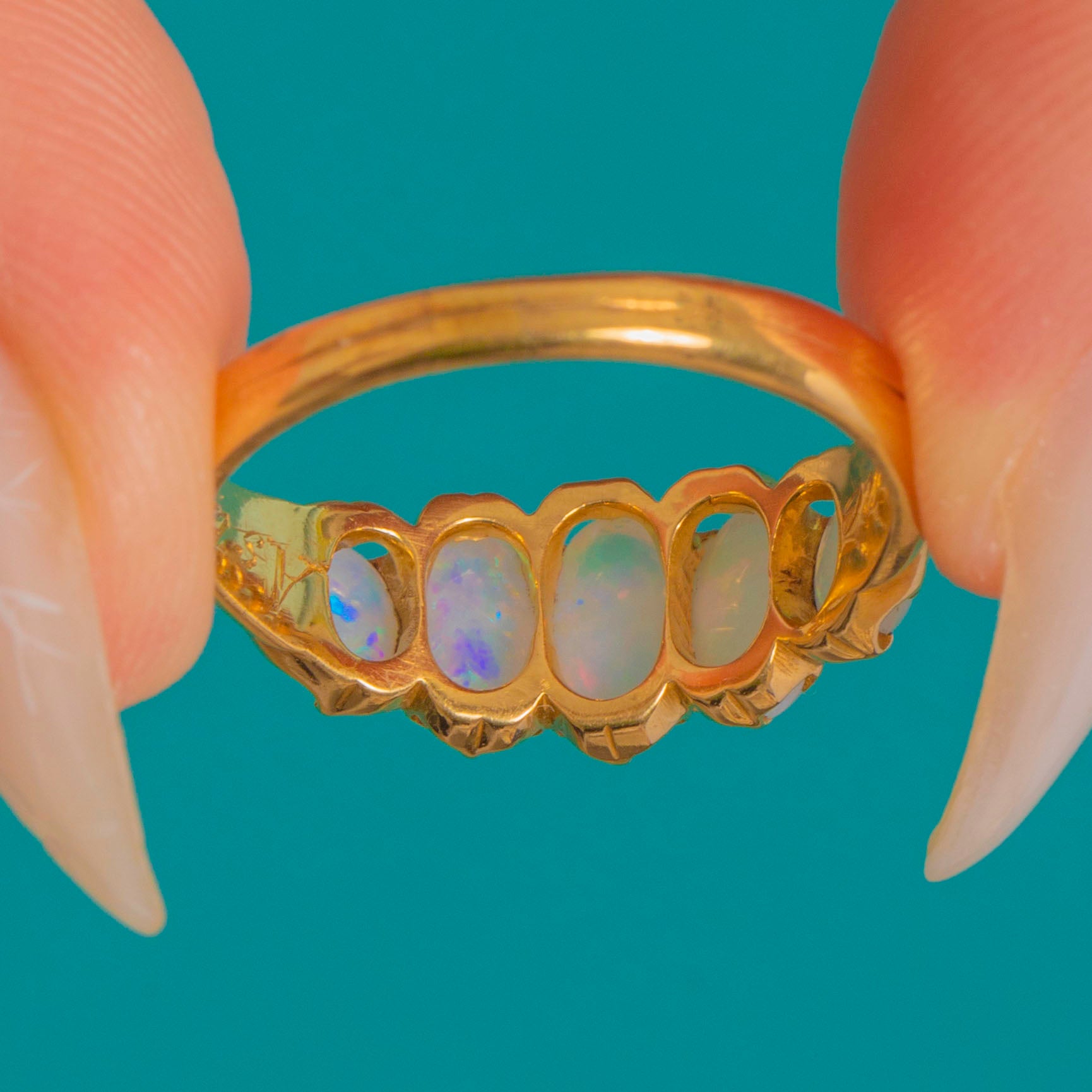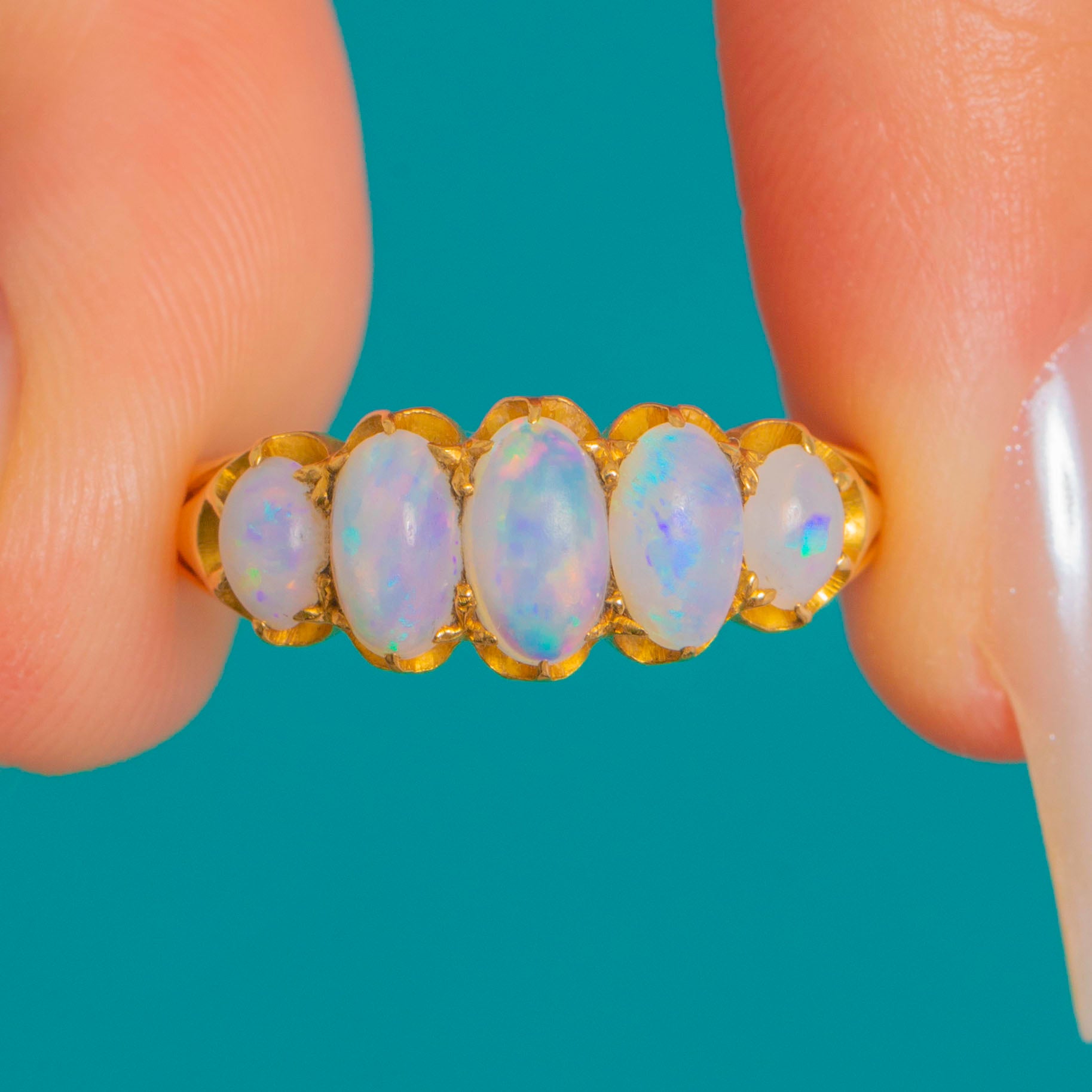 A romantic Victorian five-stone Opal ring glowing with pastel fire. Graduated oval cabochons dance with blue, green, pink and lilac flashes, punctuated by a whisper of orange, all cradled in scalloped buttercup settings for a pretty crown-like edge. The open, pierced gallery invites the light in, while the low profile and tapering 18ct Gold shank make it as wearable as it is beautiful.