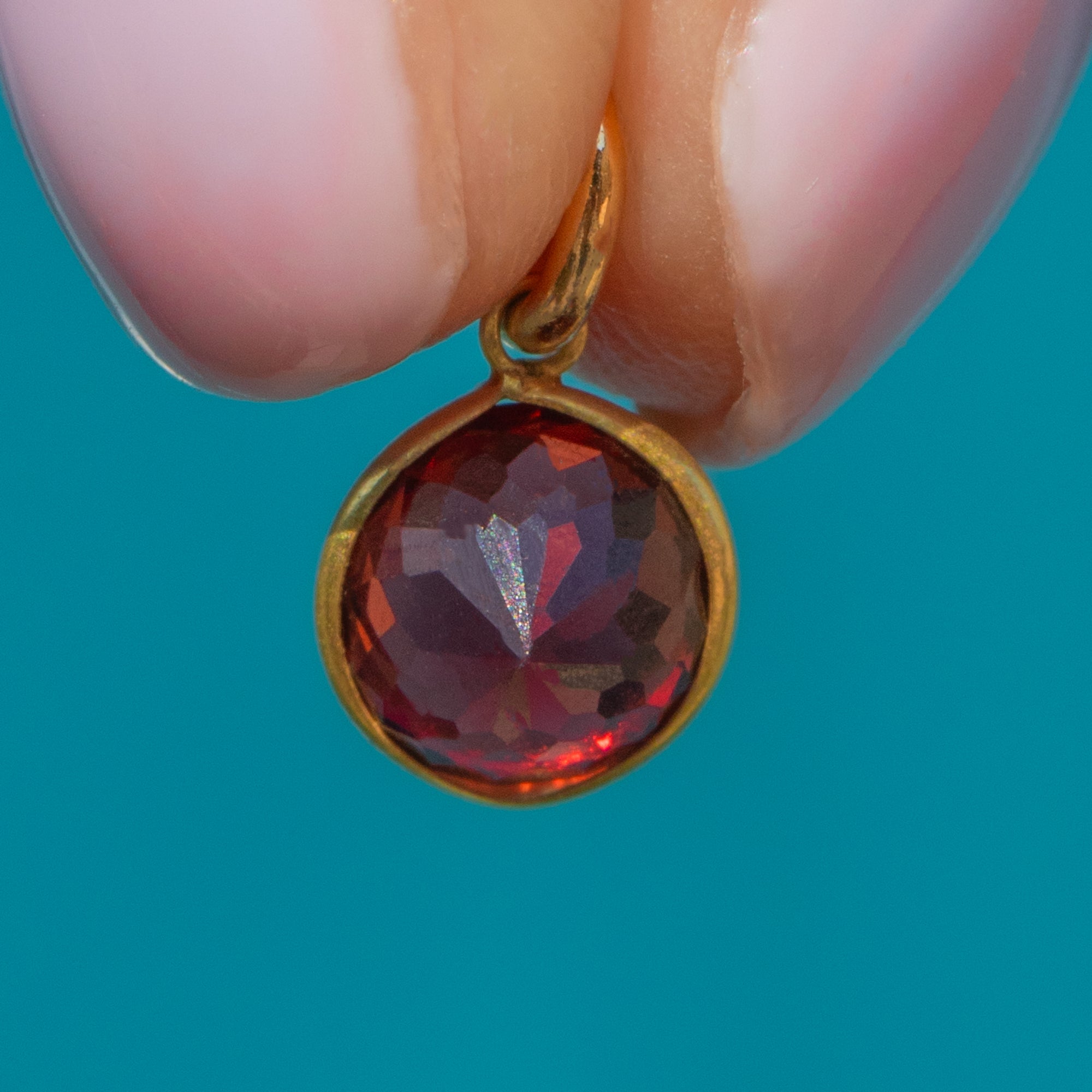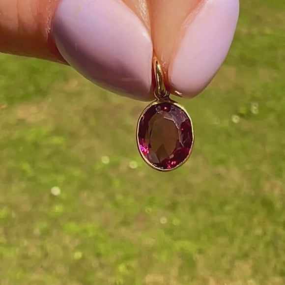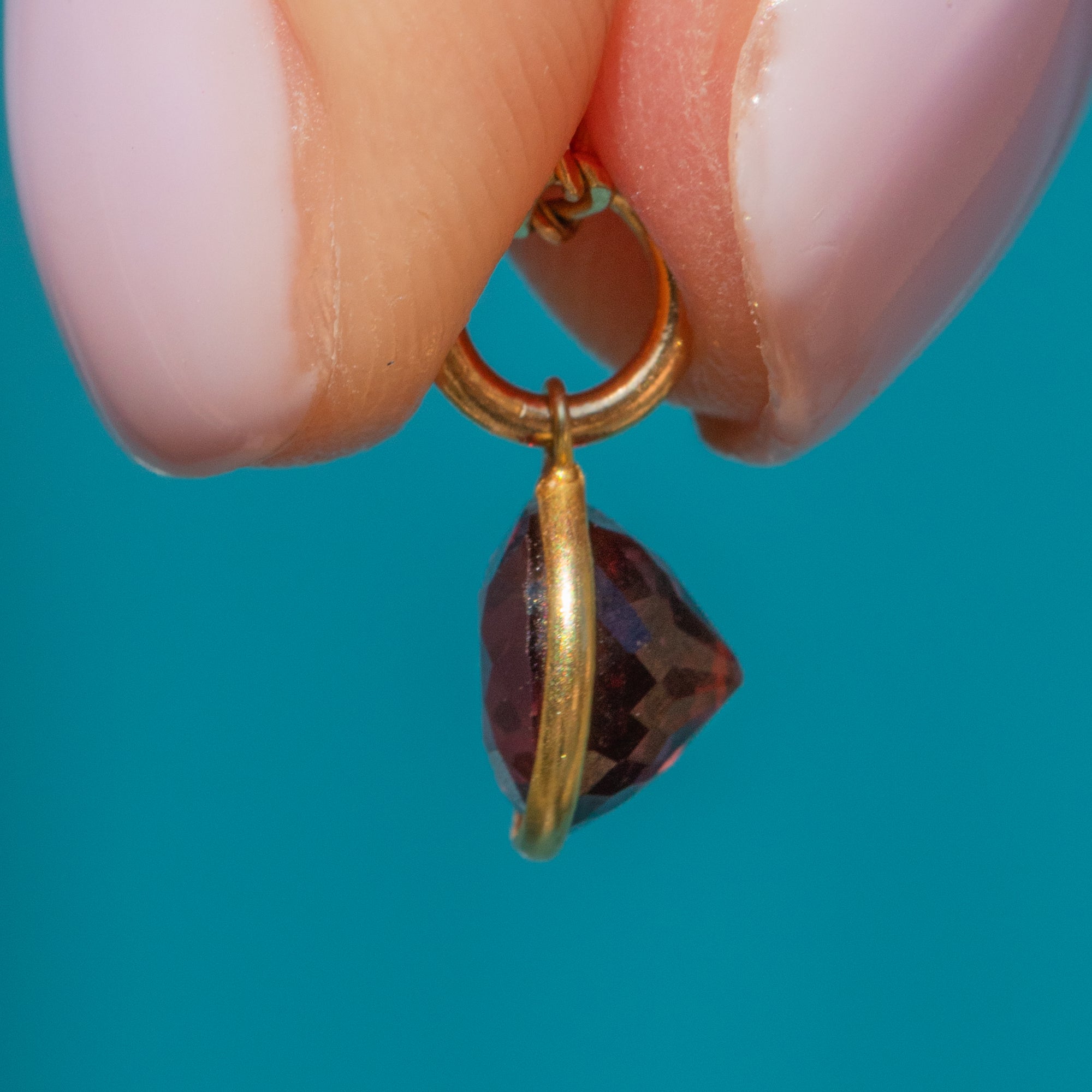 Flaunting a pool of plum hues dancing between her hand-cut facets, this 18ct Gold Garnet bezel-set charm will instantly add a pop of colour to any attire!
