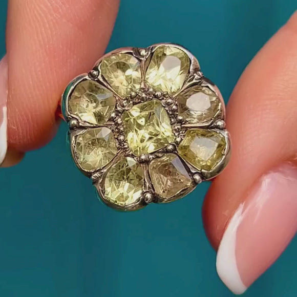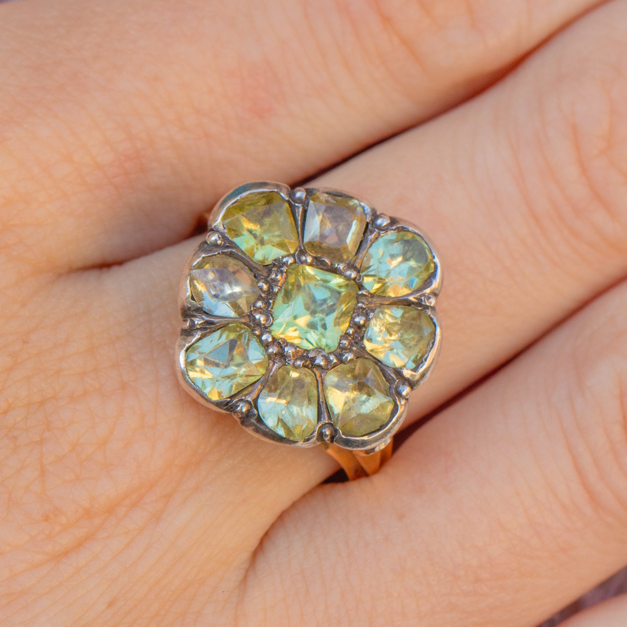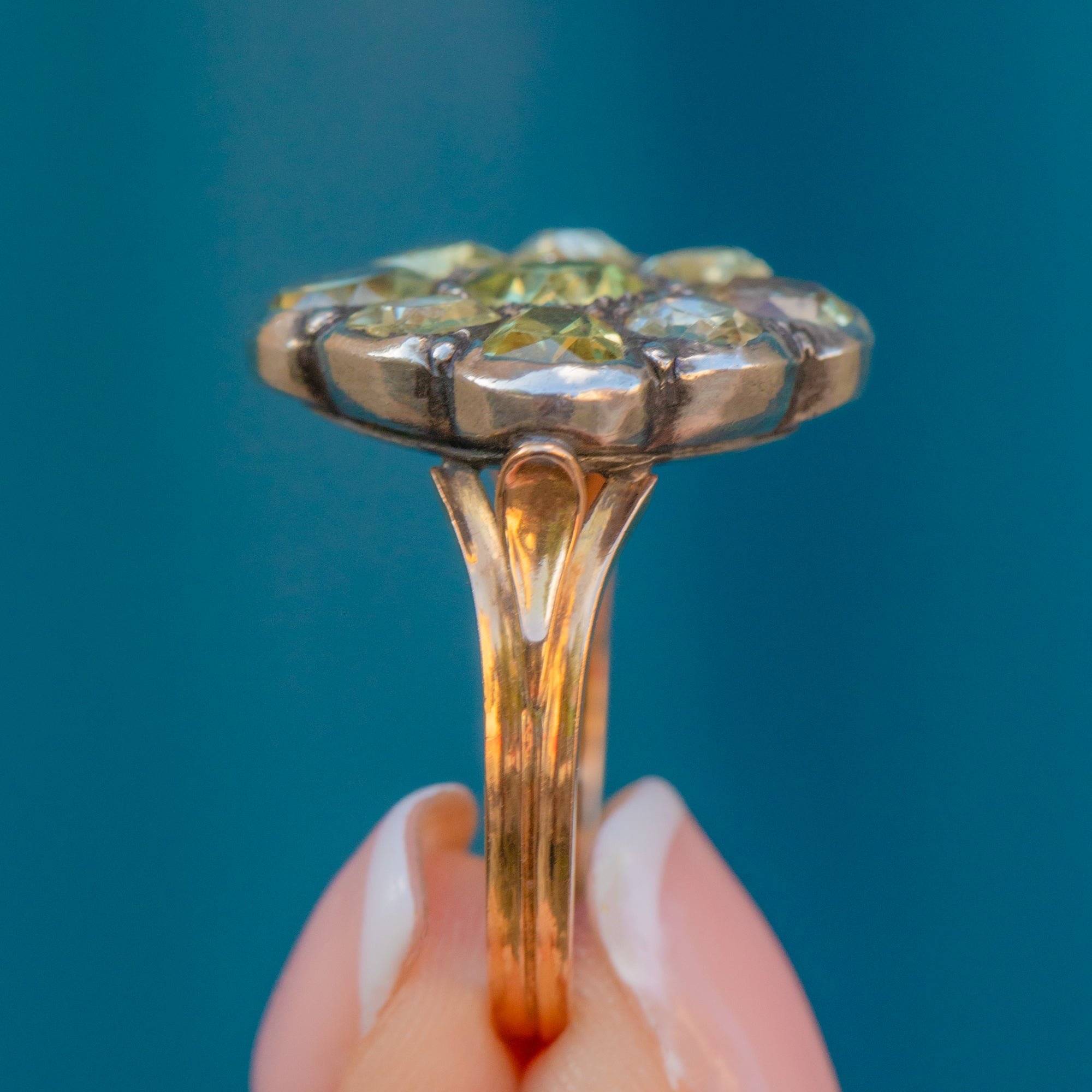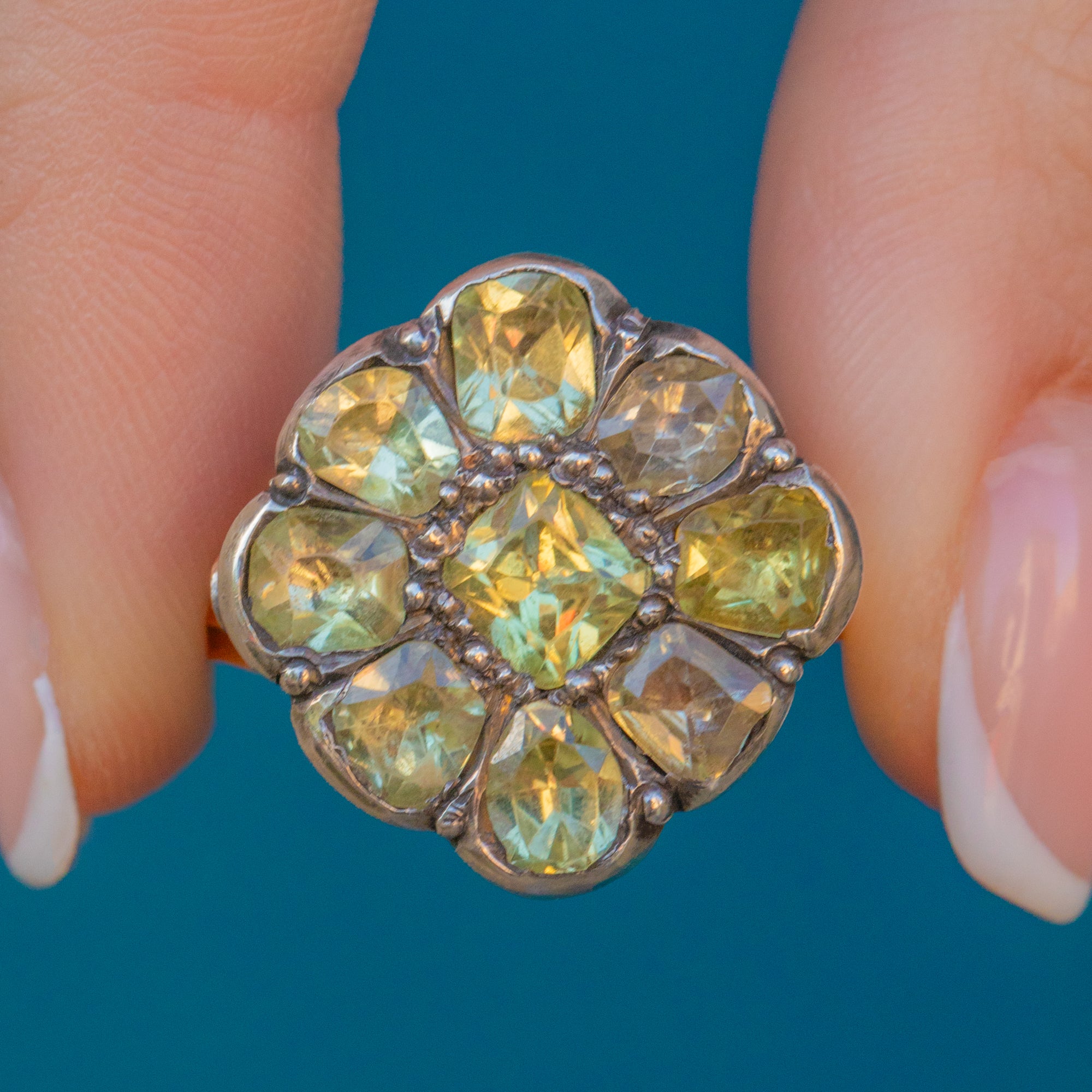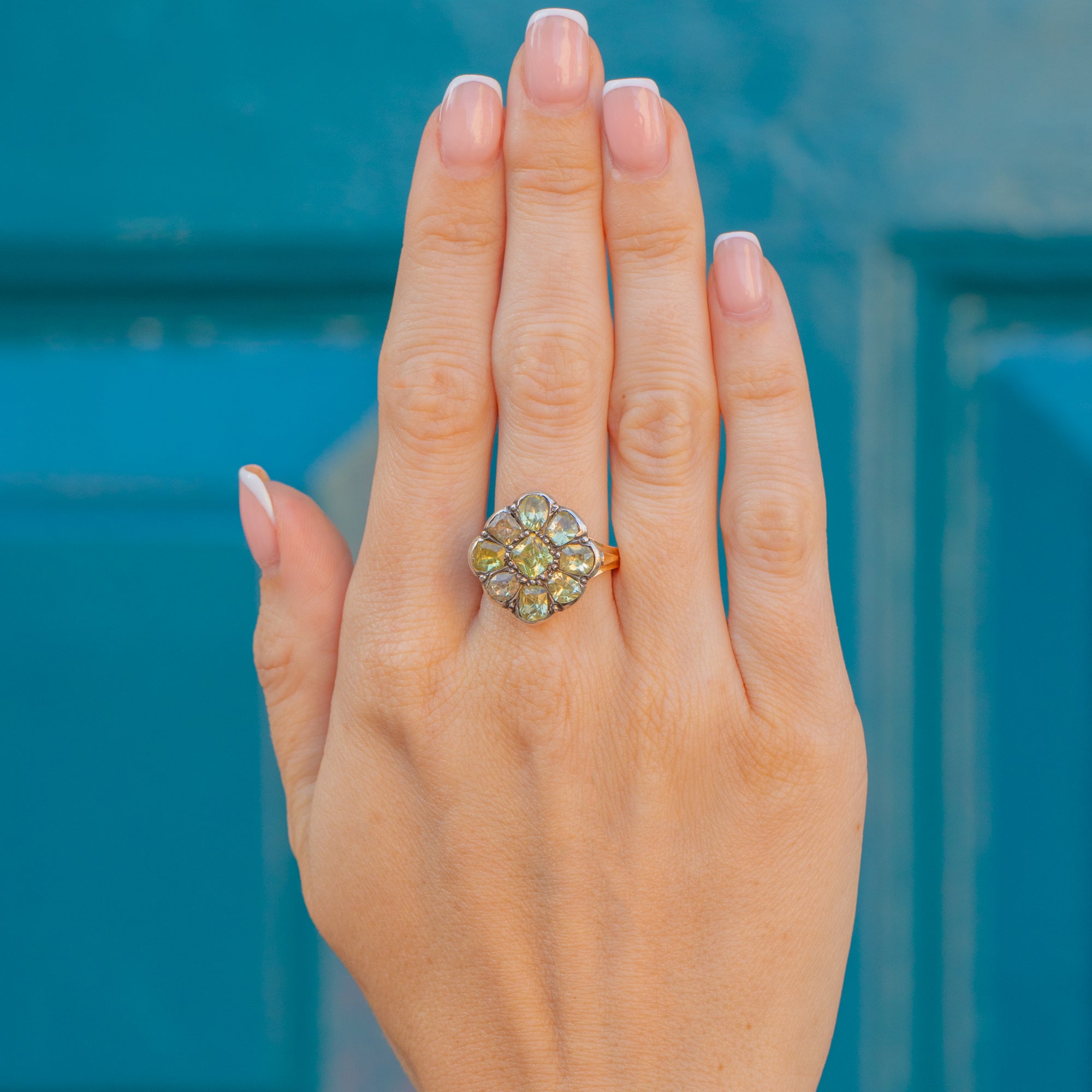 This 18ct Gold Georgian Chrysoberyl flower cluster ring is an exquisite way to connect to a bygone era! Made circa 1780, this Georgian Chrysoberyl ring provides beautiful coverage on the finger, with each stone possessing a soft pistachio hue.