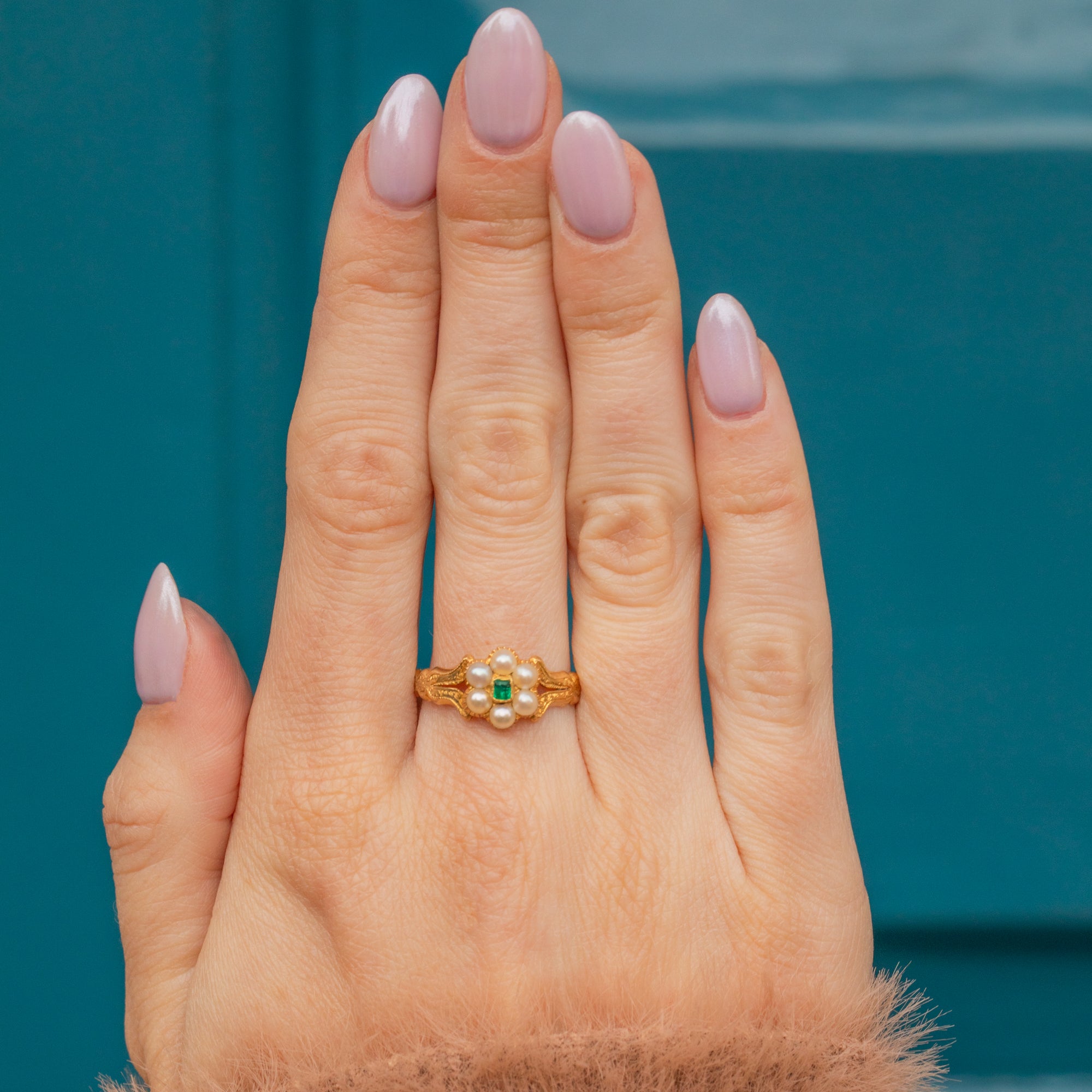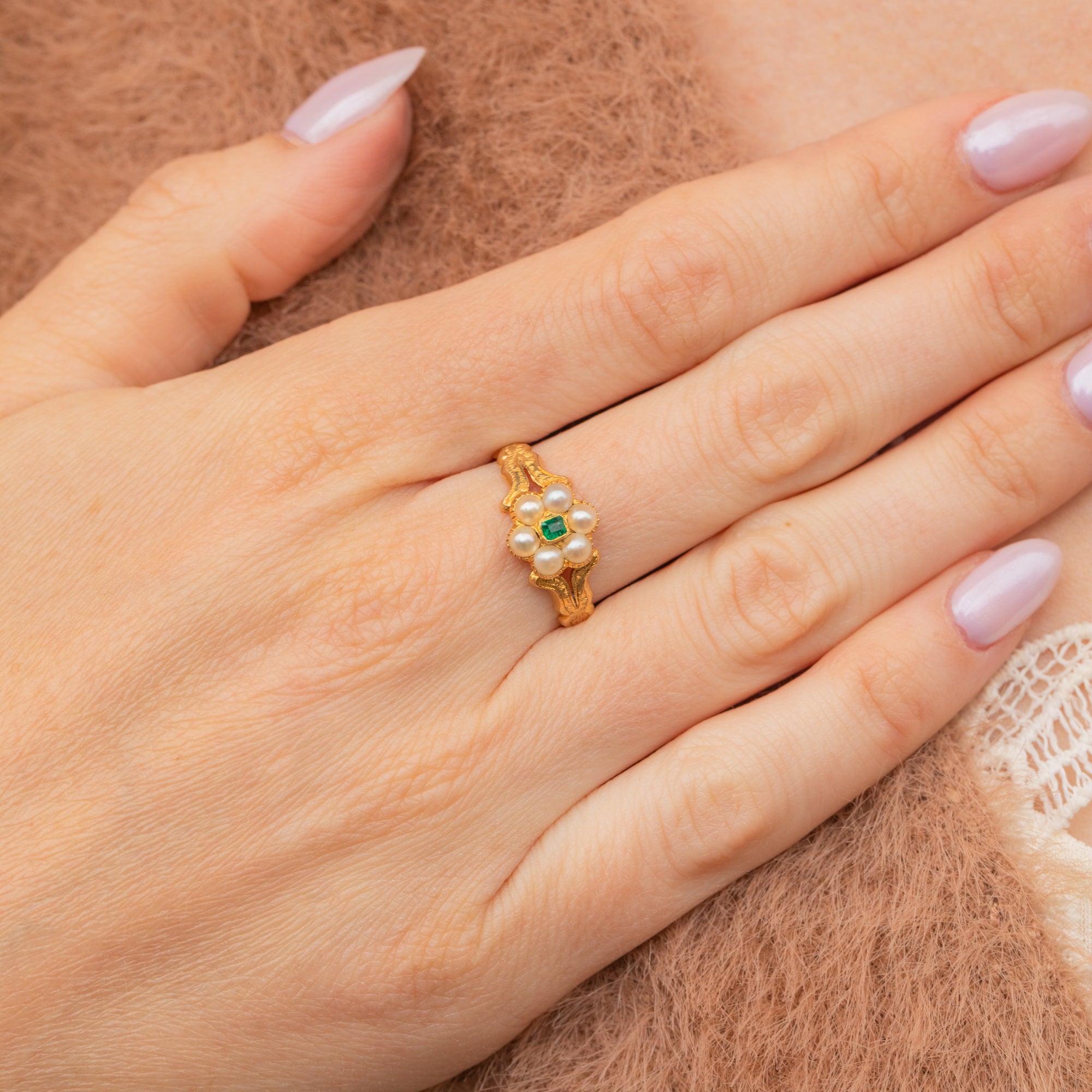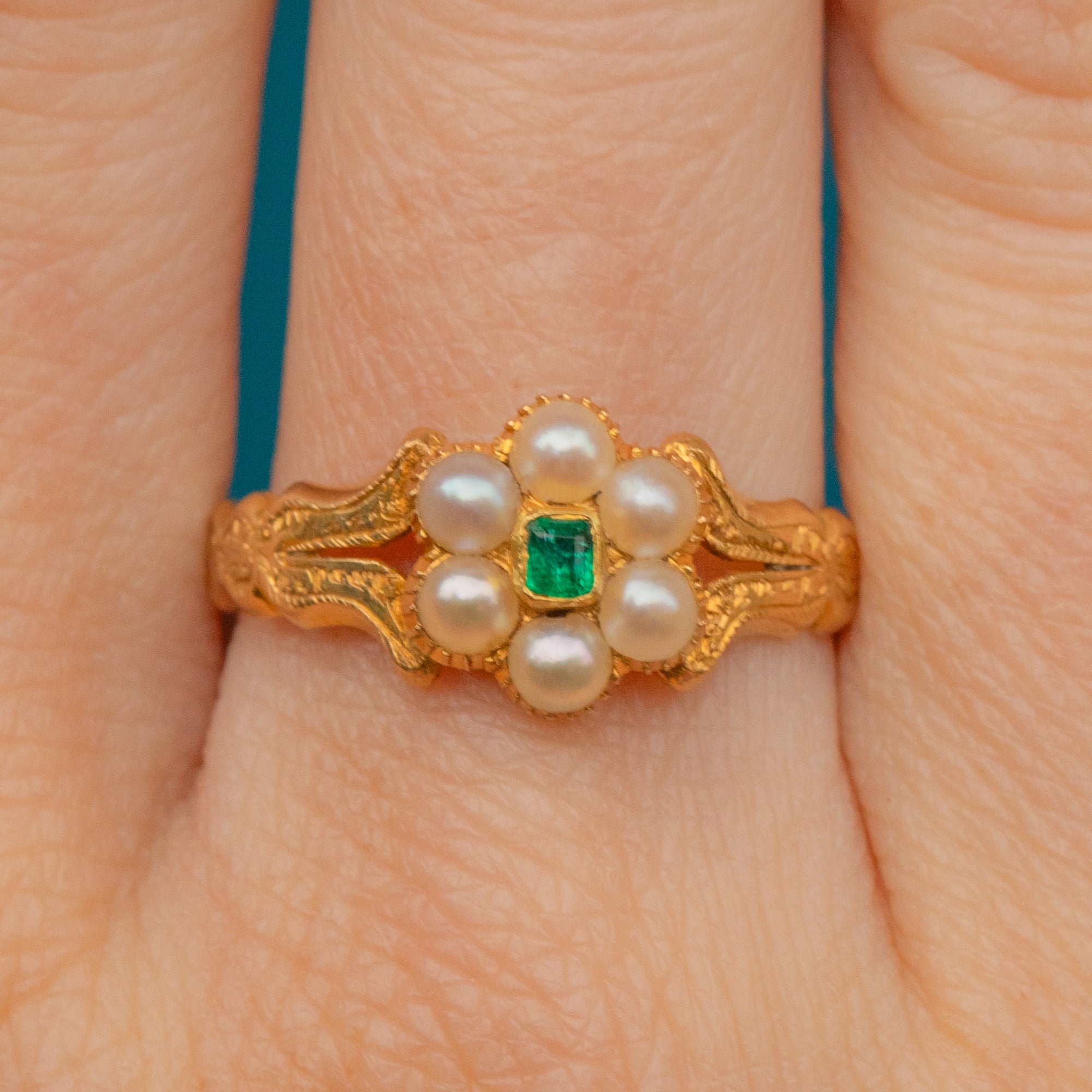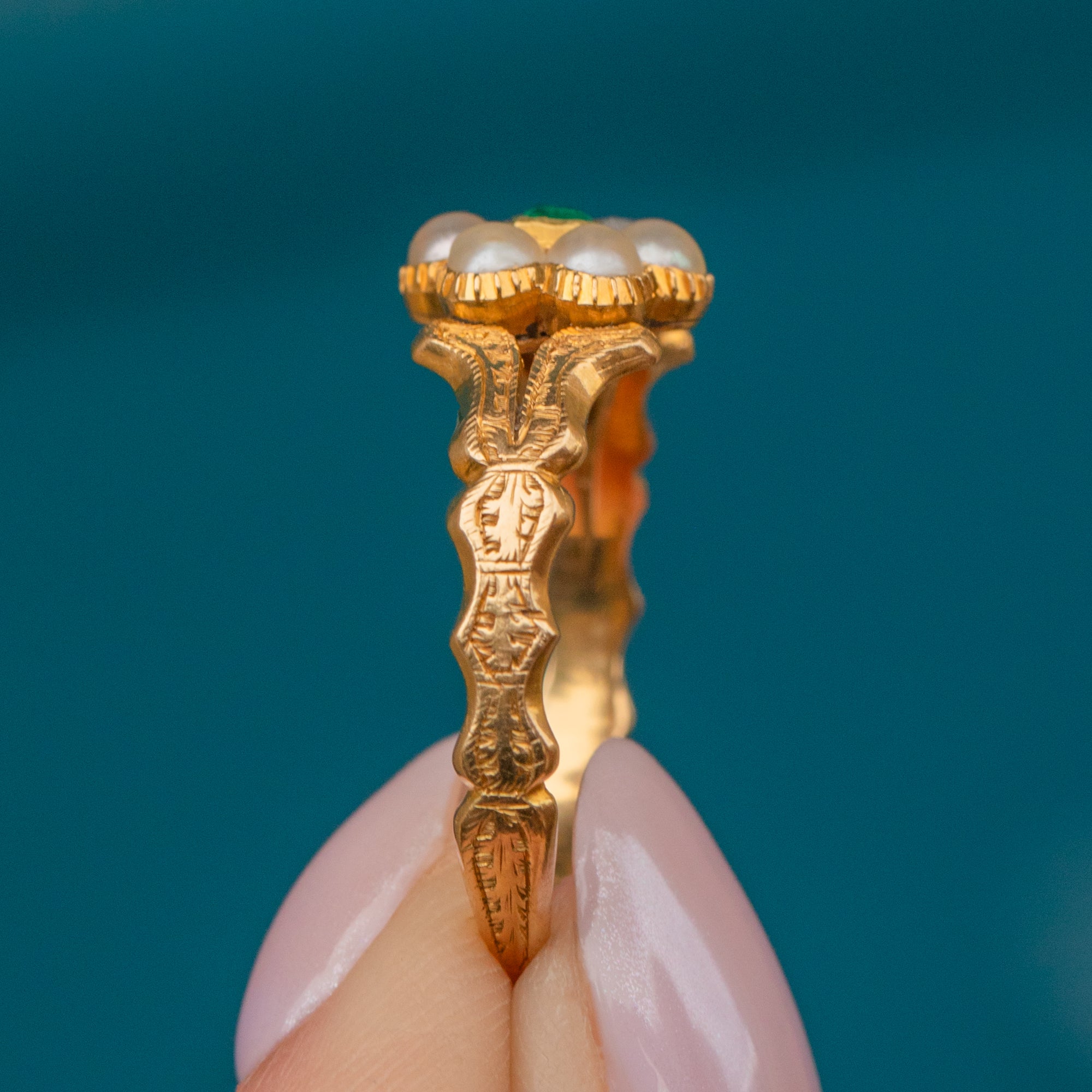 EXCELLENT. Especially when considering her grand age, this 18ct Gold Georgian Emerald Pearl cluster ring is in excellent condition! The Pearls sit snug in their settings, with no wear to their nacre and a lovely shimmer throughout. The engravings are crisp and the decorative tapered shoulders add a lovely antique touch. The ring band is smooth and glides onto your hand a dream. The back of the flower cluster is home to what would once have been a classic locket back, but this has been the only thing lost to time. Please note due to the Pearls we would not recommend it for everyday wear and should avoid wet or humid conditions. This Gold Emerald ring truly is a sweet treat for your collection!