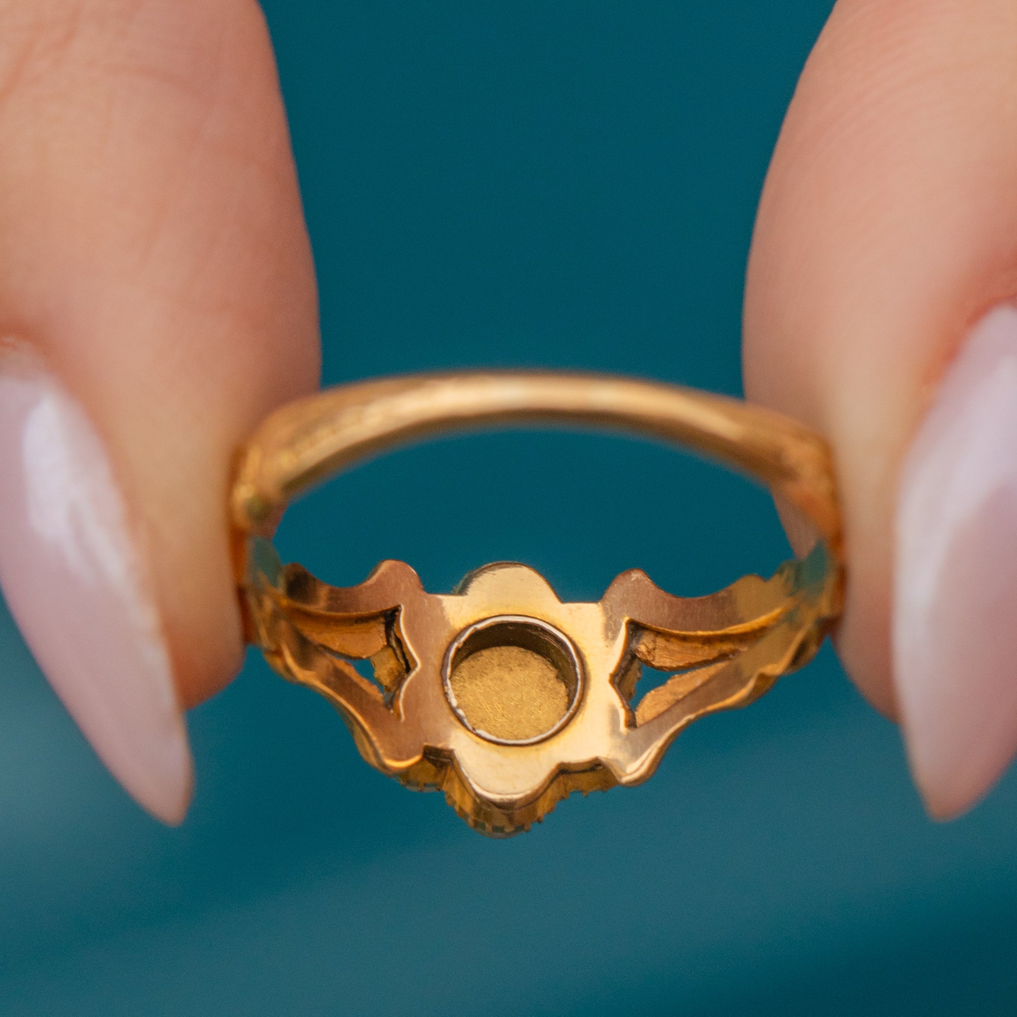 Tapered shoulders, akin to ornate pillars, hold her delectable gemstone cluster at the centre, crafted from saturated 18ct Gold and inlaid with dainty engravings for a refined finish. The delicate design of this Georgian ring makes her the perfect feminine finishing touch to any attire!