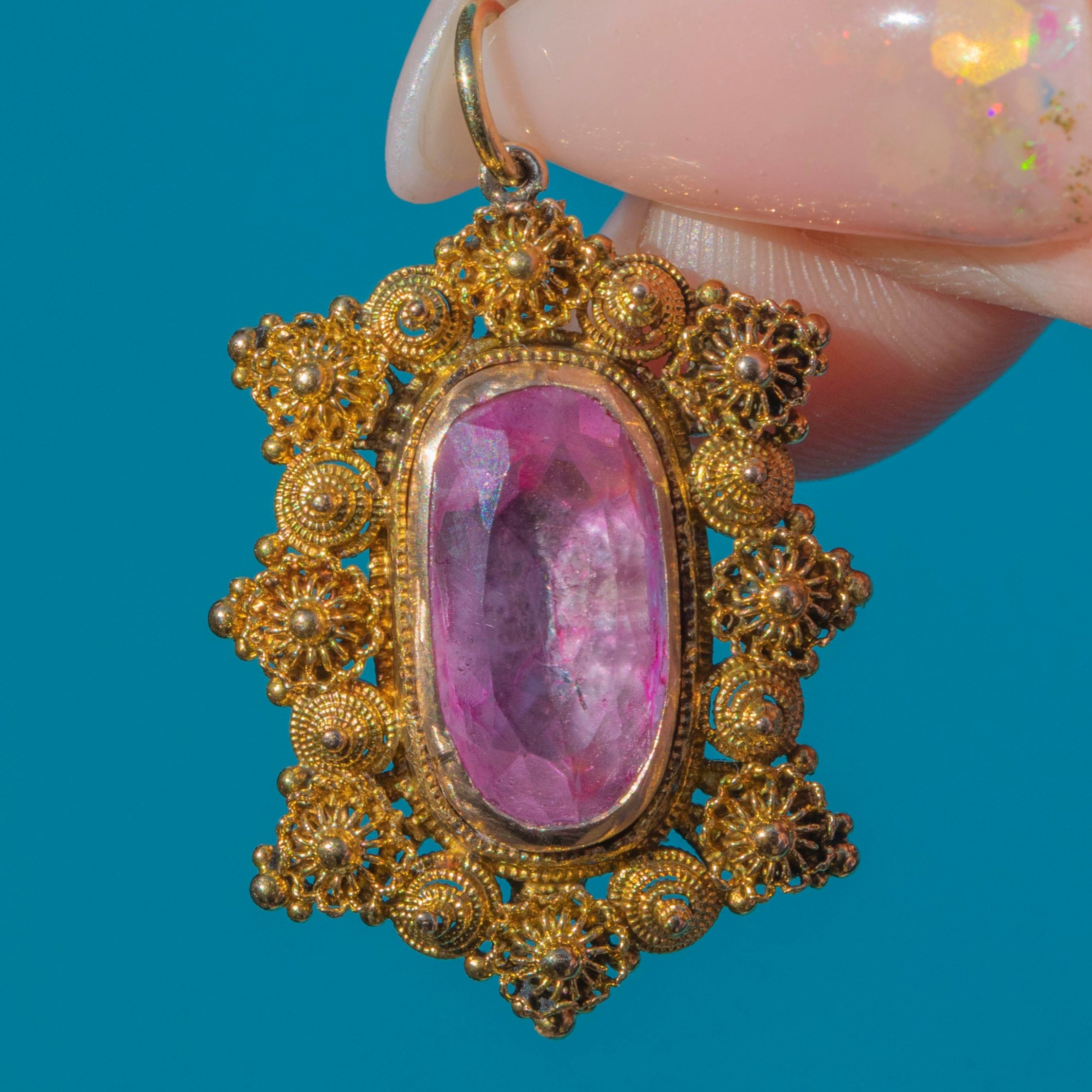 EXCELLENT: The pretty Georgian Pink Topaz is the most sought-after, luscious baby pink, and shows some natural inclusions. The foiling is intact and the charm has only the  lightest surface wear, consistent with her great age. At over 200 years old we think she looks pretty exceptional!! The 18ct Gold cannetille work is bright yellow and well preserved with only minor softening of detail. Overall, the pendant has been well cared for and remains in beautiful antique condition.