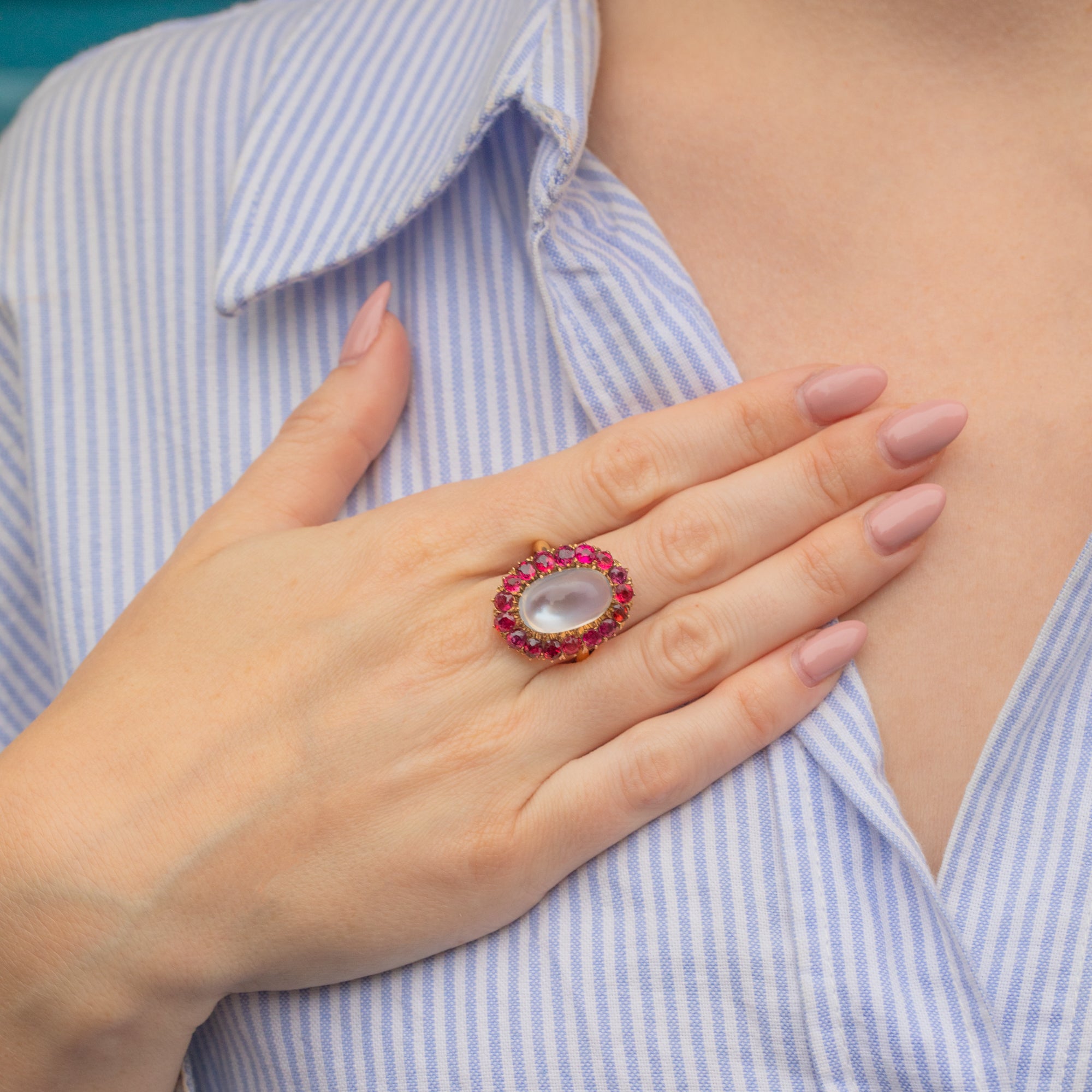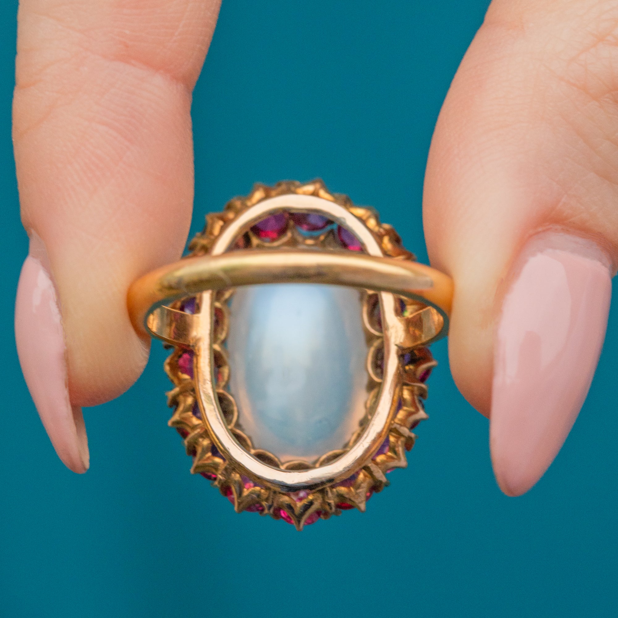 If you're looking for a statement ring that mystifies any onlooker, then this magnificent 18ct Gold Moonstone Ruby cluster ring is the one for you. Featuring a hypnotising central 5.20ct Moonstone with moonlight hues that exude a majestic schiller, your jaw will drop to the floor as soon as you catch sight of her!