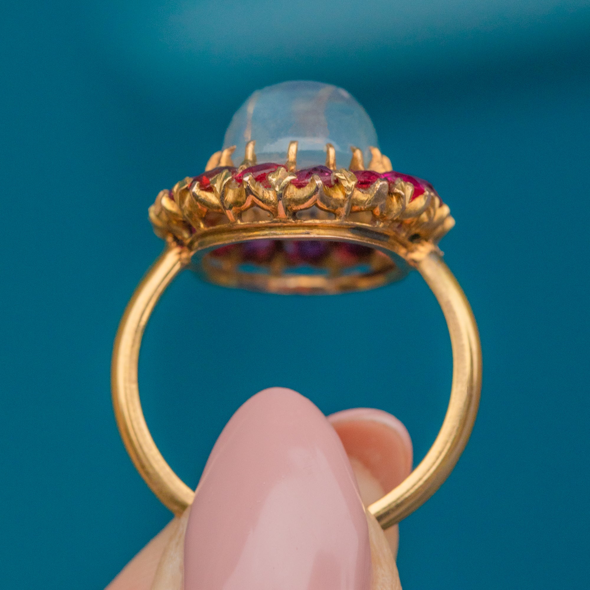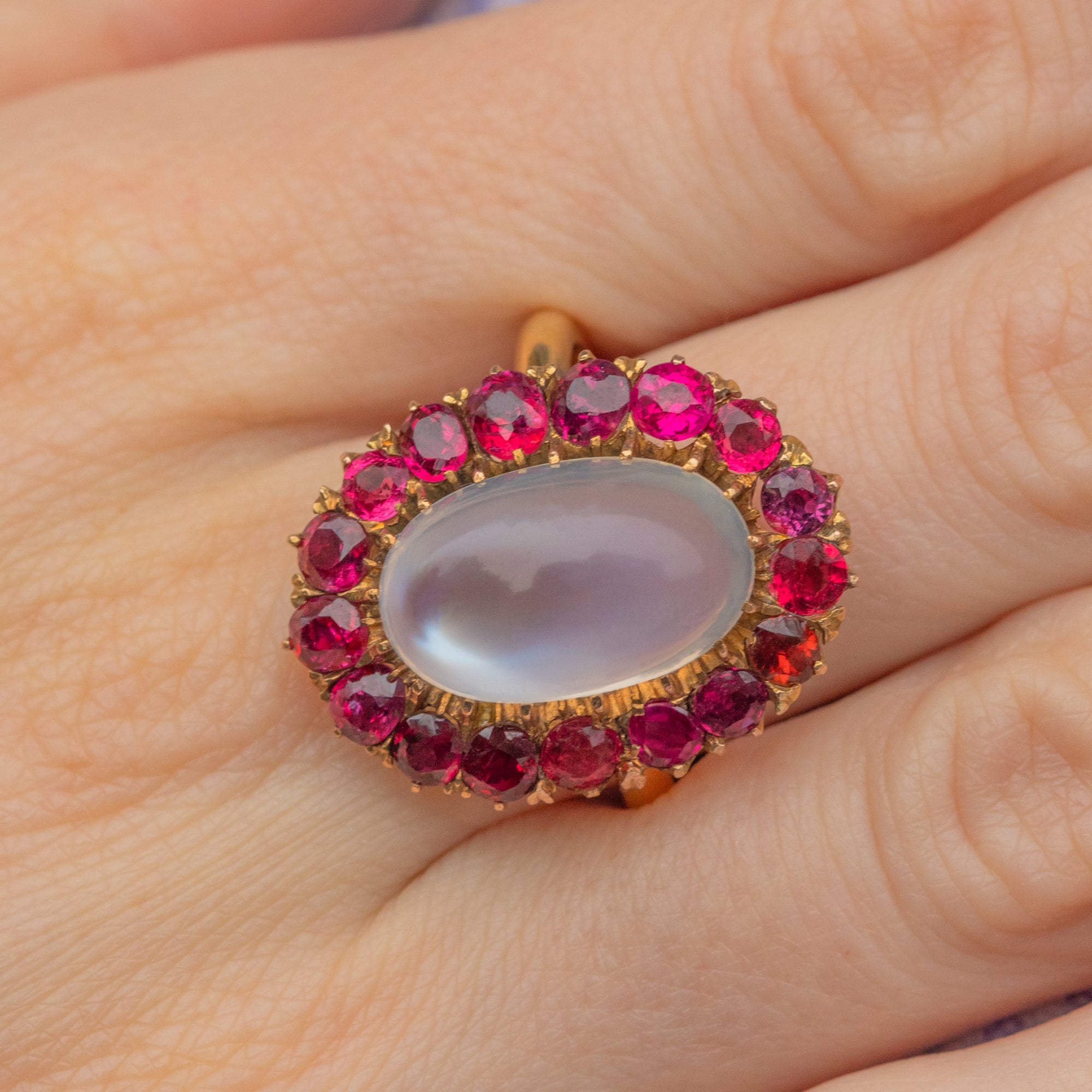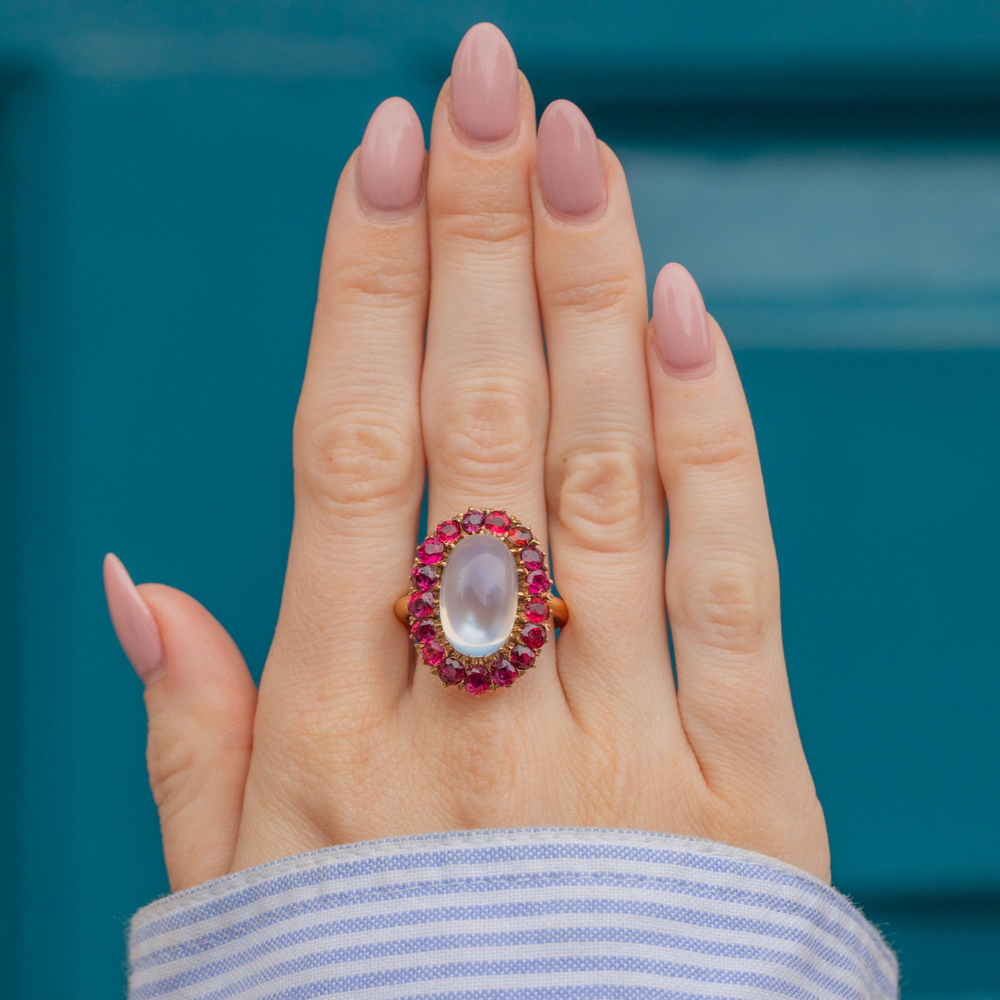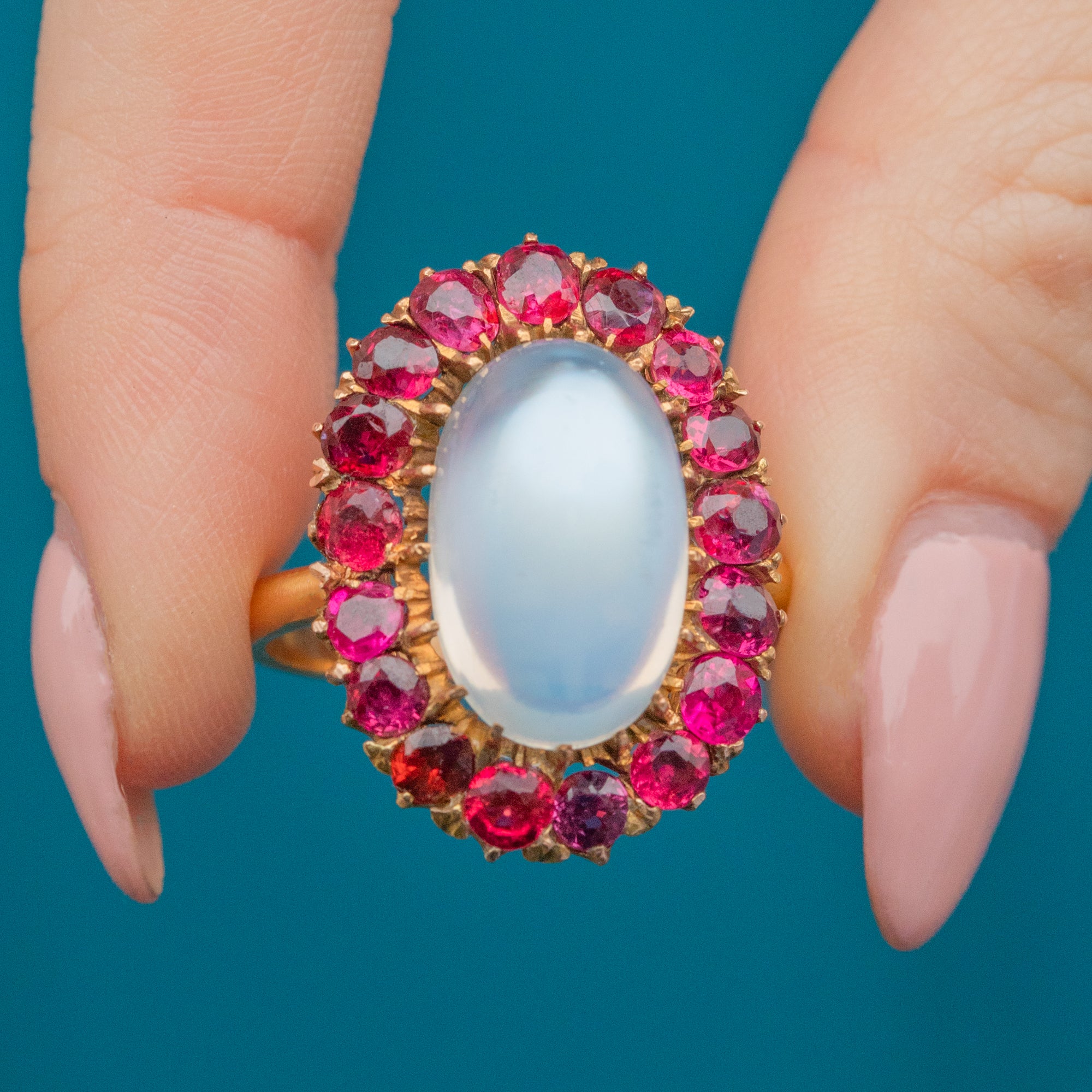 VERY GOOD-EXCELLENT. This 18ct Gold Moonstone Ruby cluster ring is in very good antique condition with plenty of beauty and life left to give. The shank and setting are solidly made and well maintained. The 5.20ct Moonstone is pristine with a string blue-lilac adularescence. The surrounding gemstone cluster is visually striking but does have some variation in colour, with 4 replacement Garnets among them (which appear a lighter pink colour). The band certainly appears to be antique, but we think it might be a slightly later replacement done in antiquity around the early 1900's.