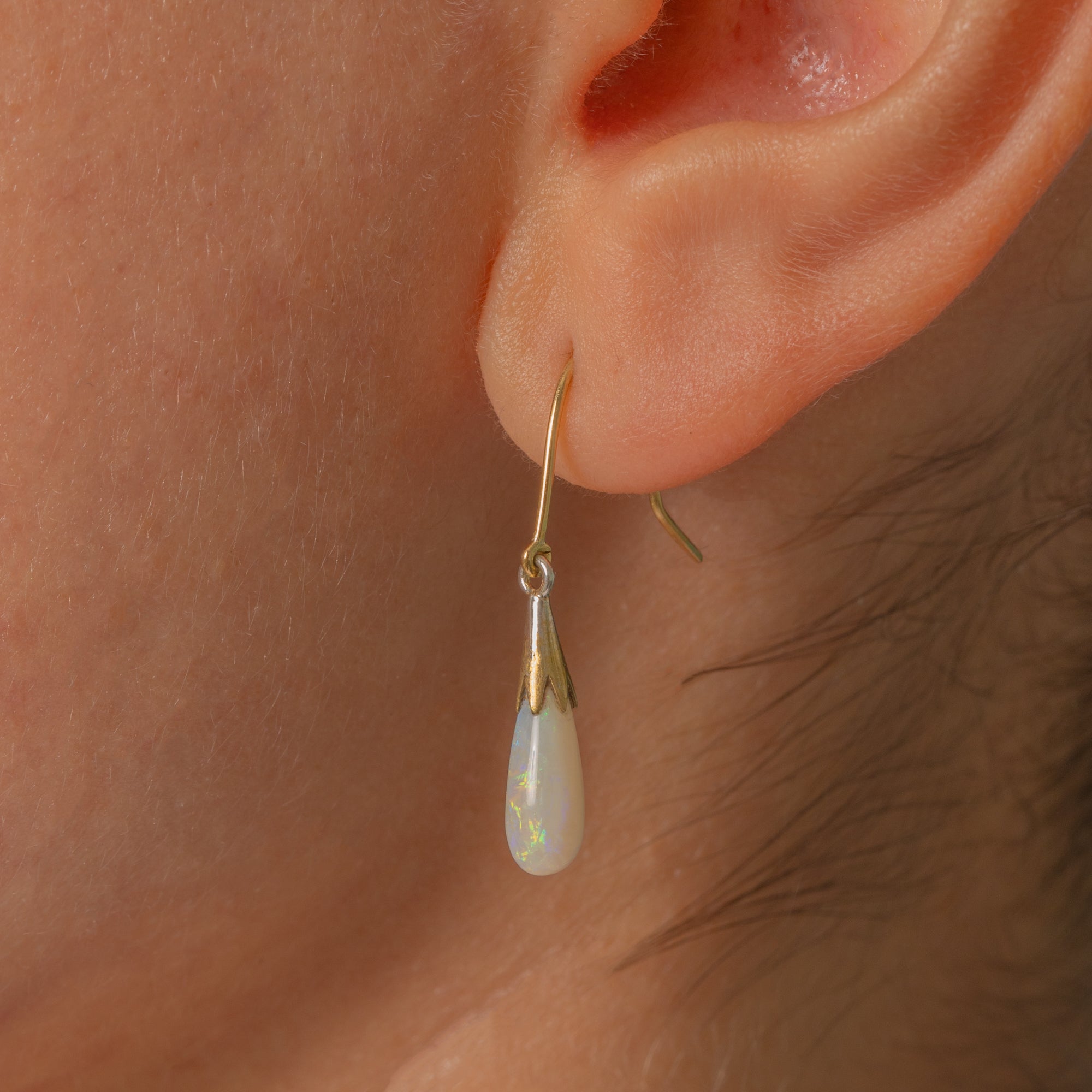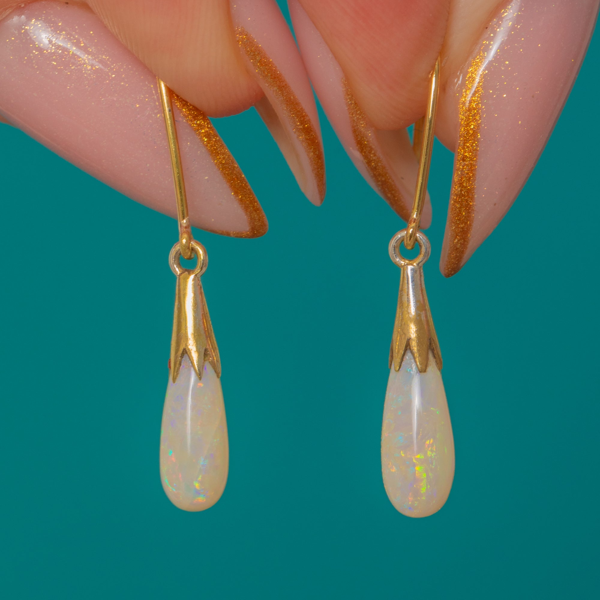 These elegant Edwardian drop earrings feature smooth briolette Opals that shimmer with exceptional play-of-colour and life.