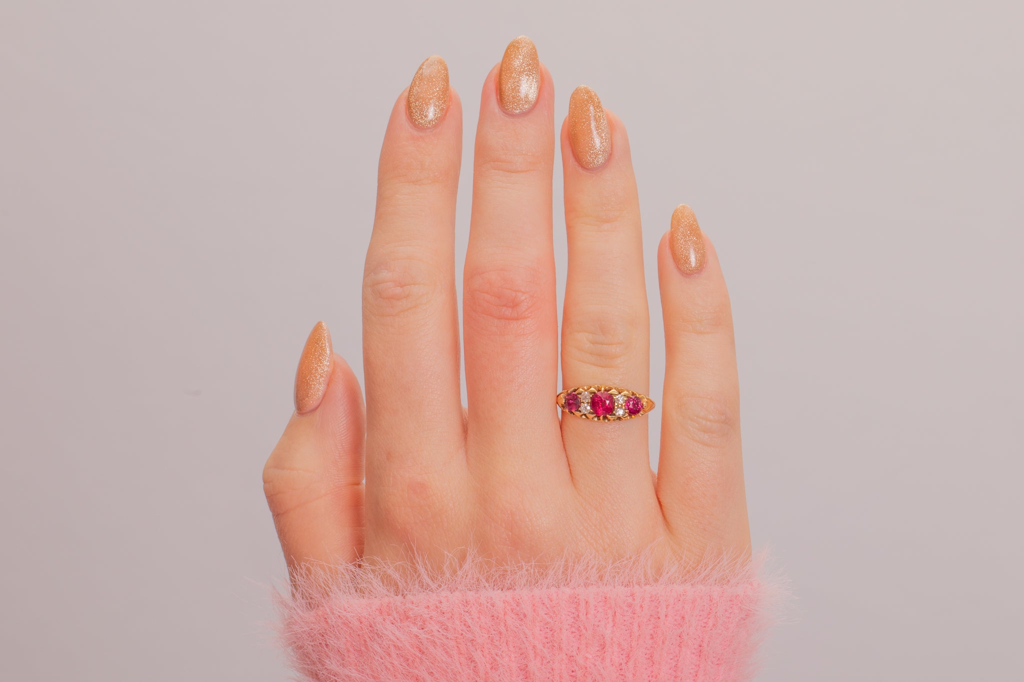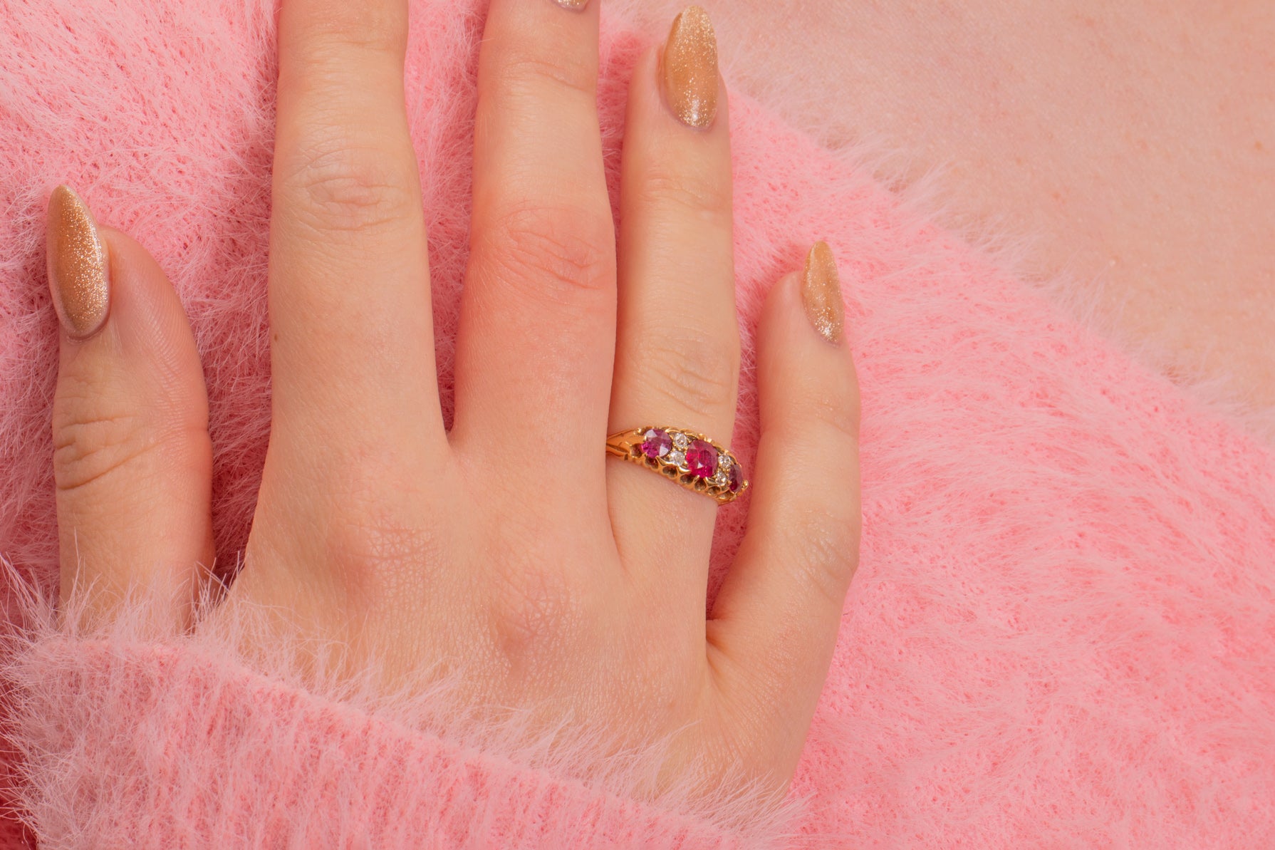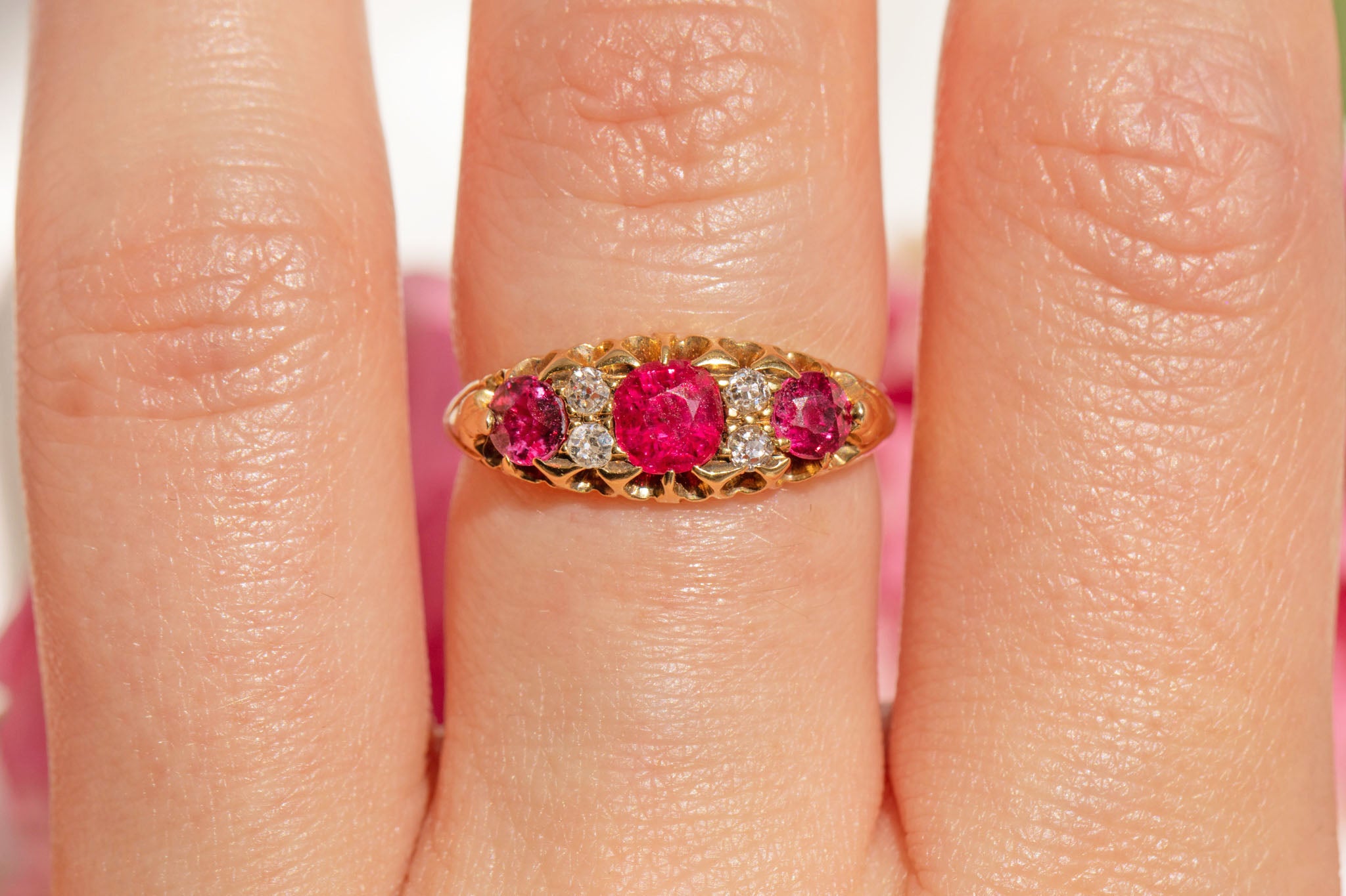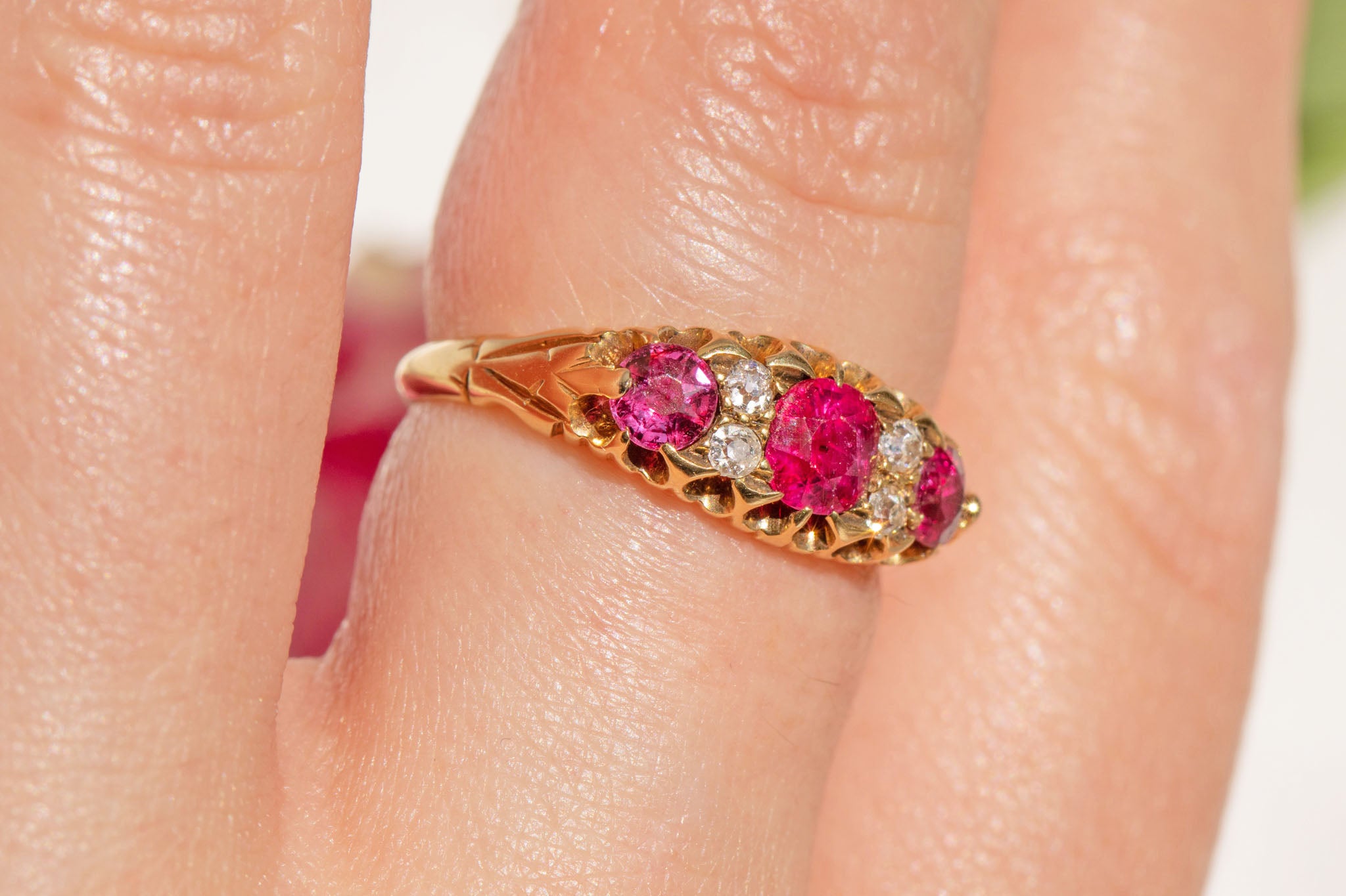 You are sure to get your sparkle fix with this piece- boasting three berry red Rubies, each with two bright Diamond sandwiched in between. The ring band is solid 18ct Gold, and hallmarked to 1902, making this piece all the more special!
