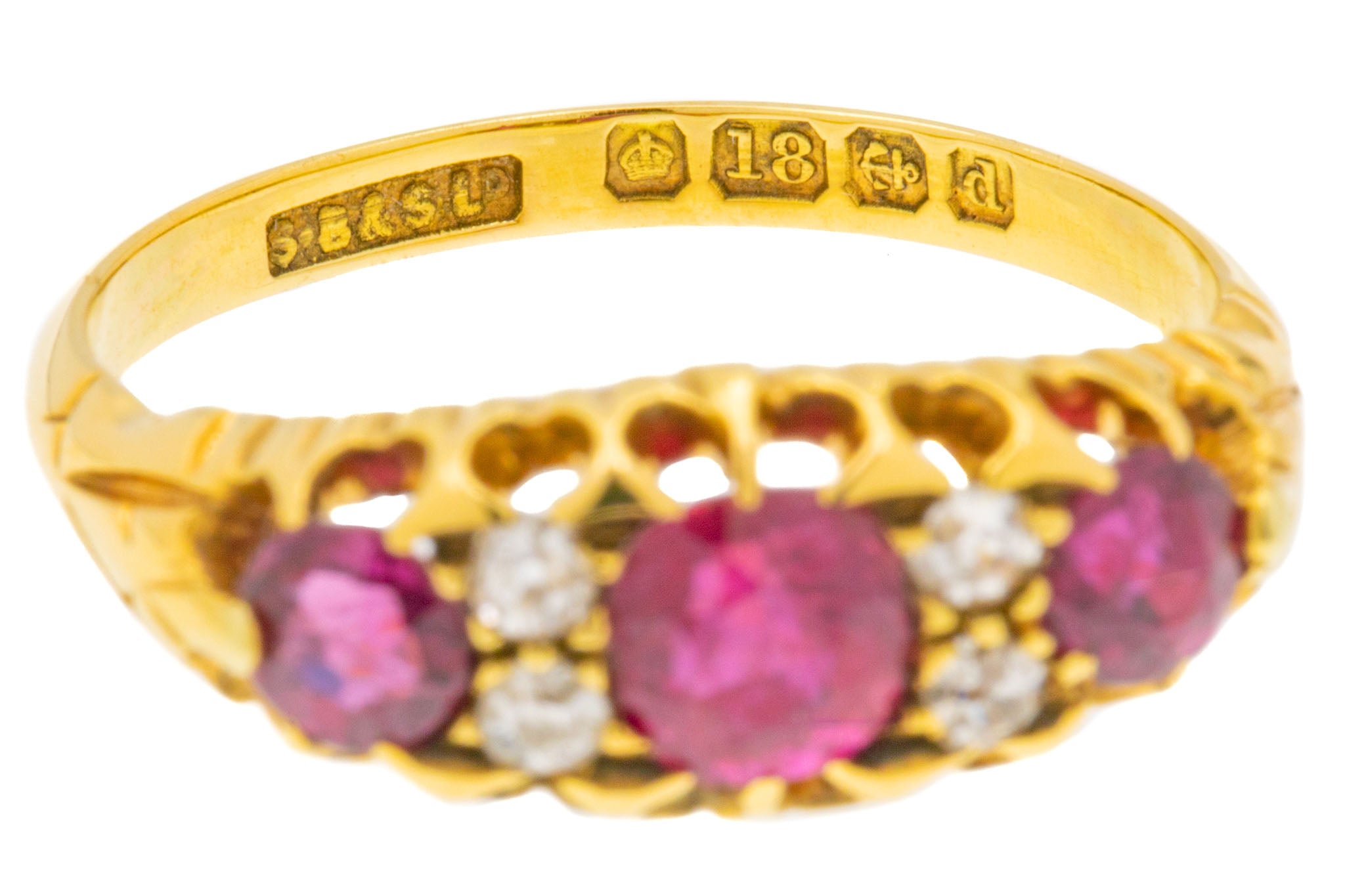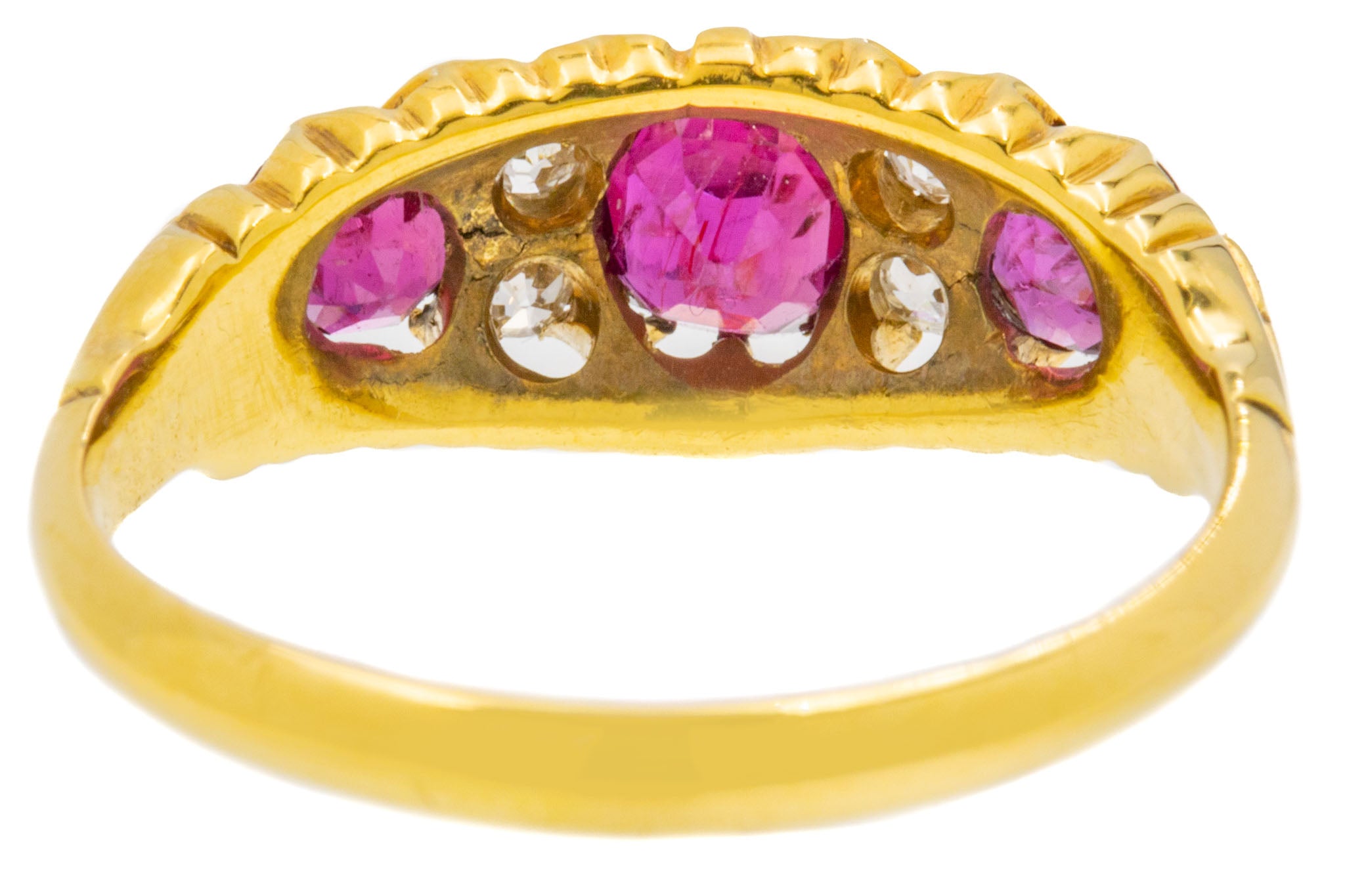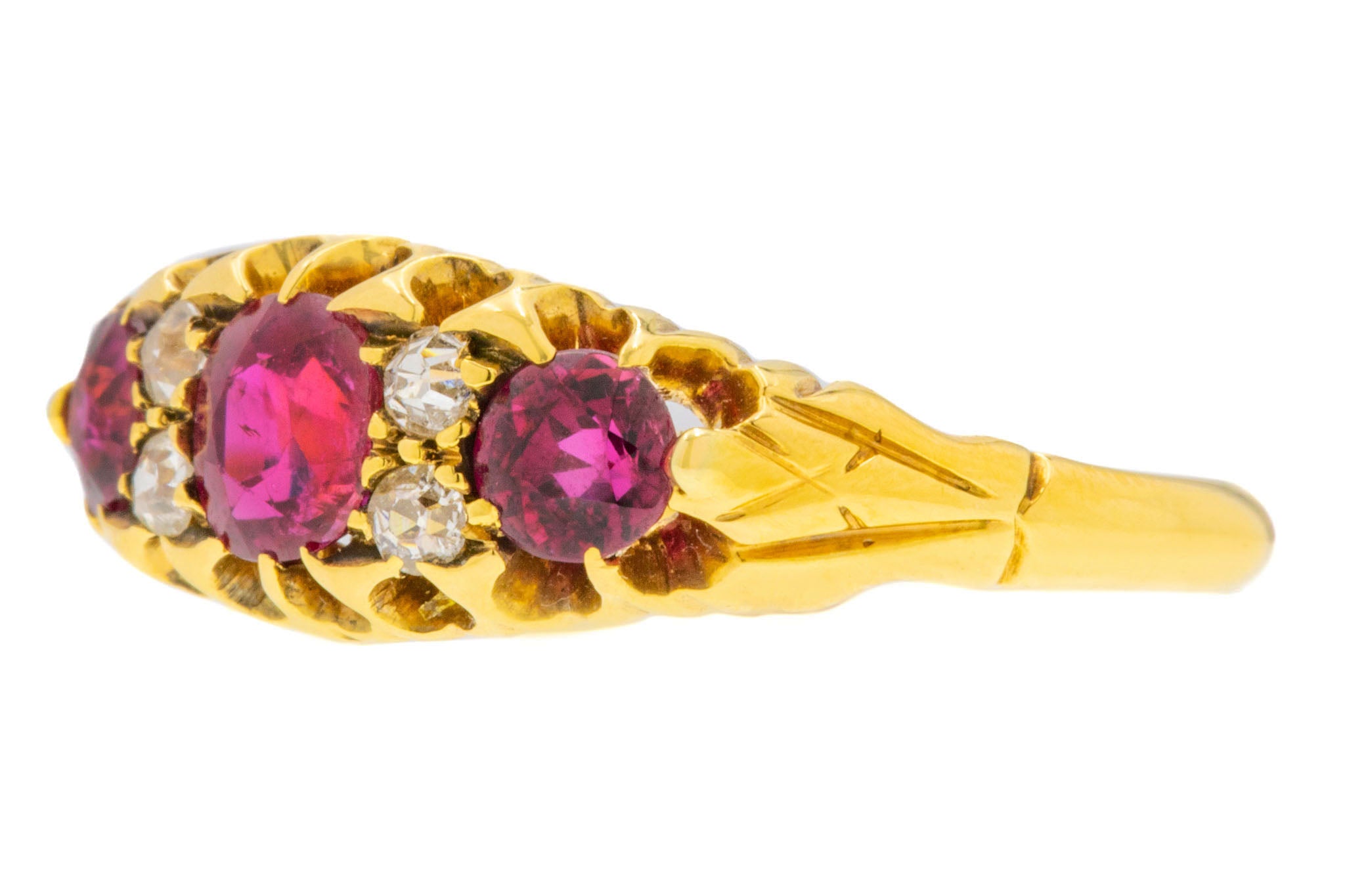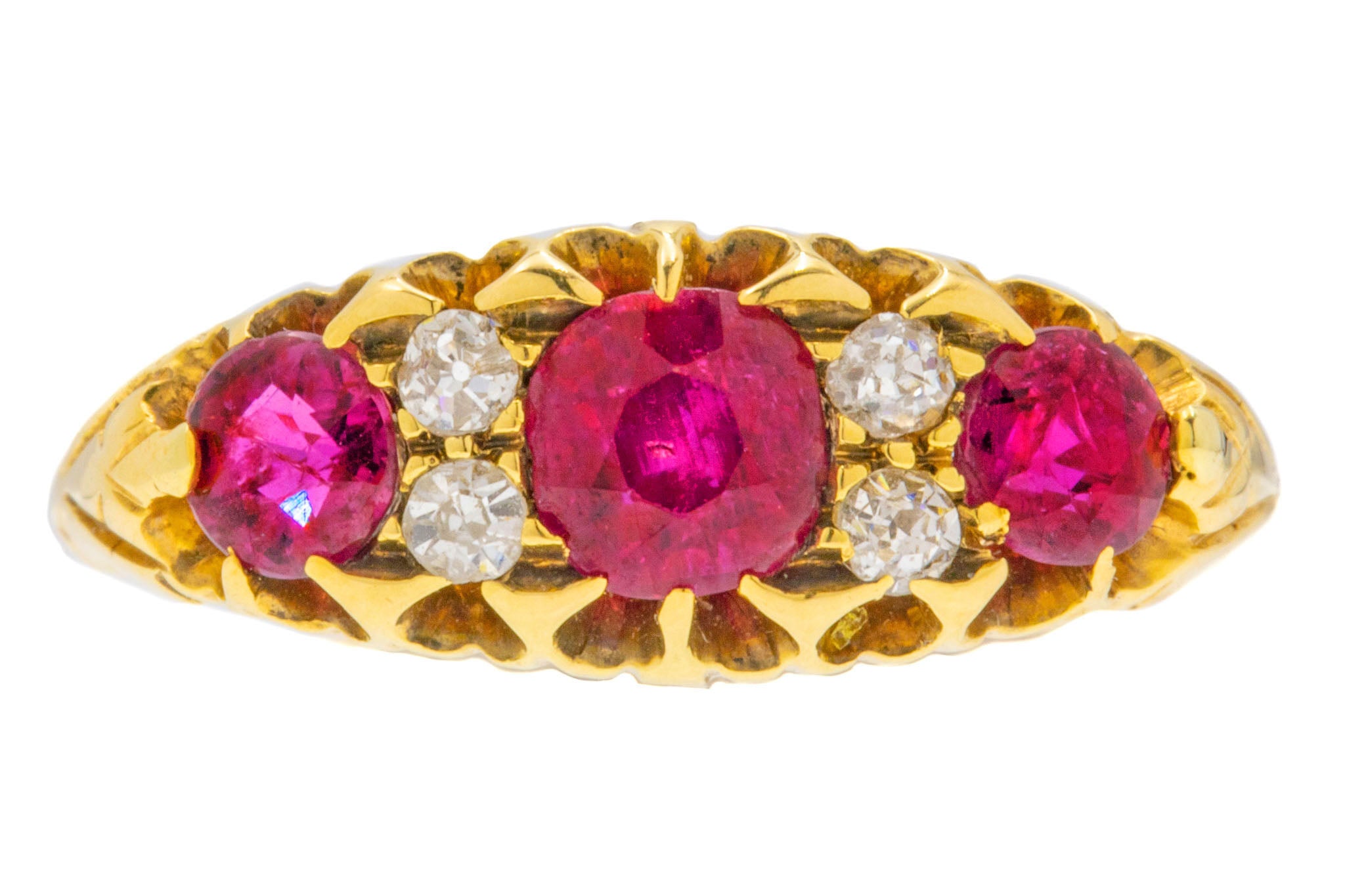 EXCELLENT. This is a splendid 18ct Gold natural Ruby Diamond ring! In excellent condition, this piece features three stunning Rubies, alongside bright and crisp Diamonds which are all secure within their settings. The inside of the smooth Gold band are crisp, and has allowed us to date the ring to 1902! We simply don't have anything other to say than 'wow'.