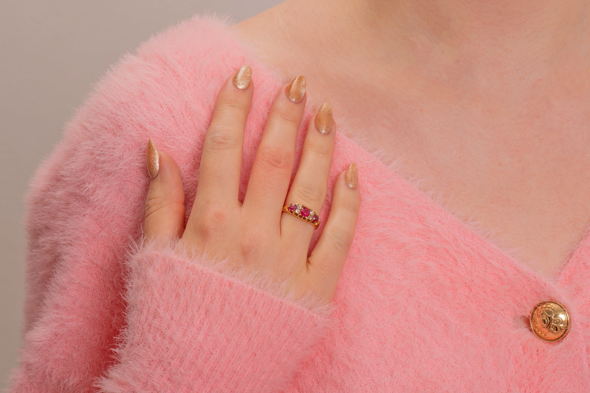 Outer rubies are 3.5mm in diameter (approx 0.45ct combined).