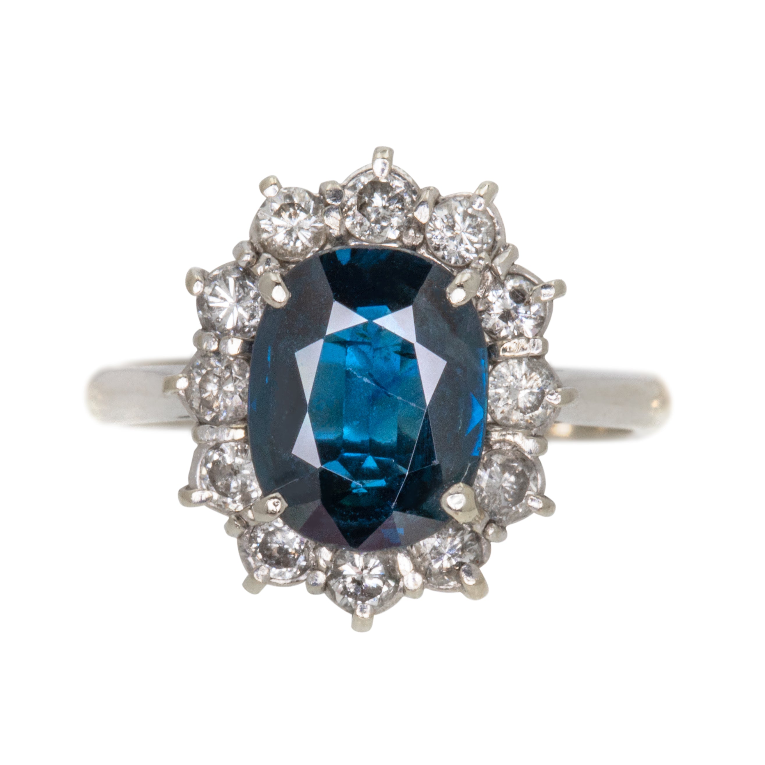 EXCELLENT. This lovely 18ct Gold natural Sapphire Diamond cluster ring is in excellent condition. The beautiful 1.40ct deep blue natural and unheated Sapphire and earth-mined Diamonds are securely set in their 18ct White Gold settings and are free from any chips or damage to note. The ring gallery is fully intact, and she shows no signs of previous resizing. With unmatched beauty, she makes the perfect engagement ring choice!