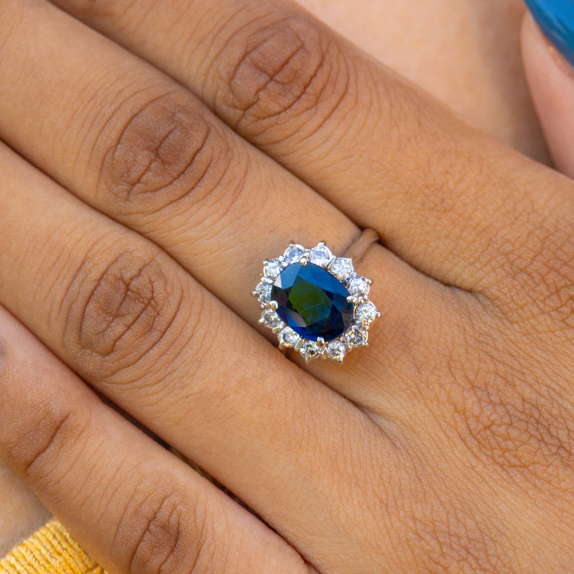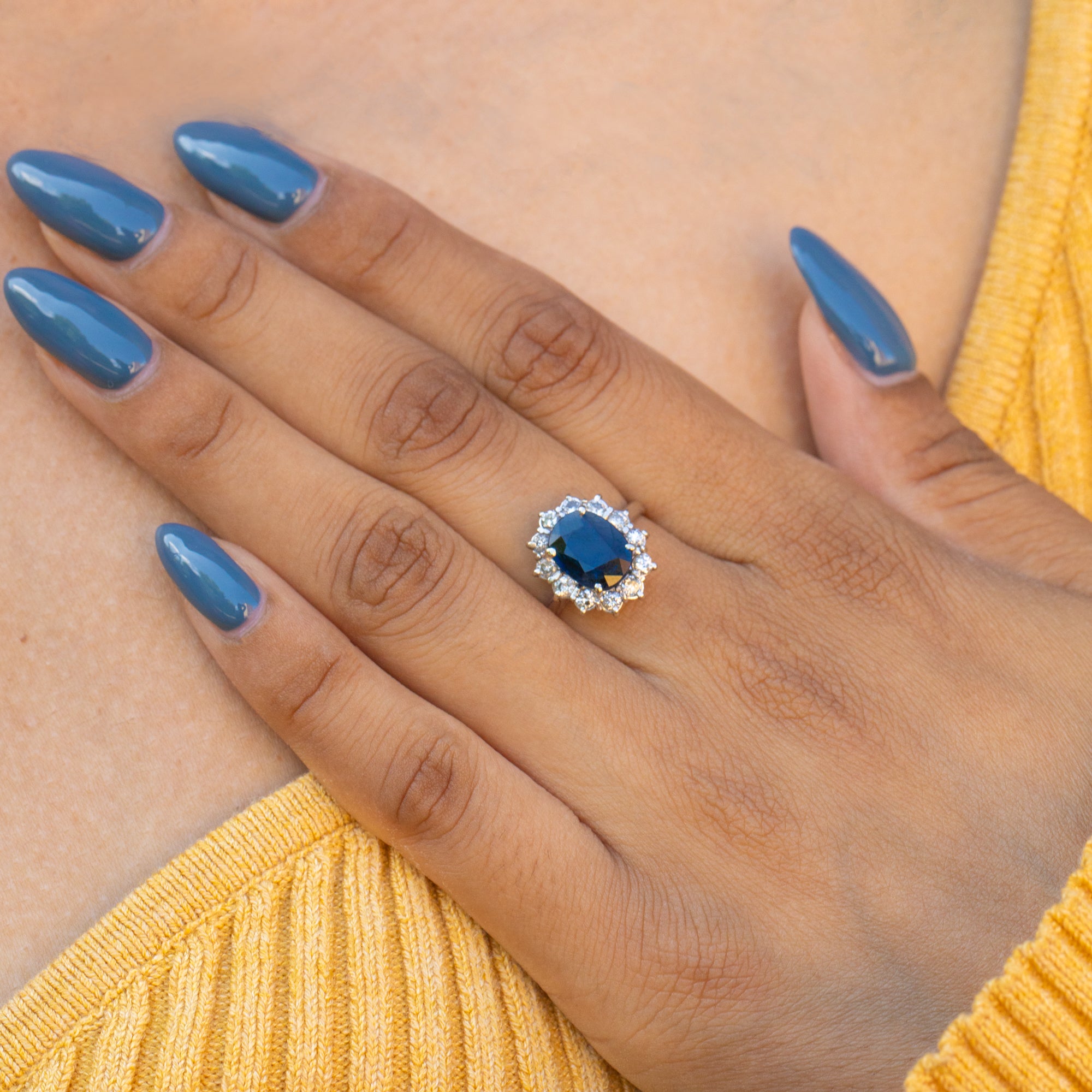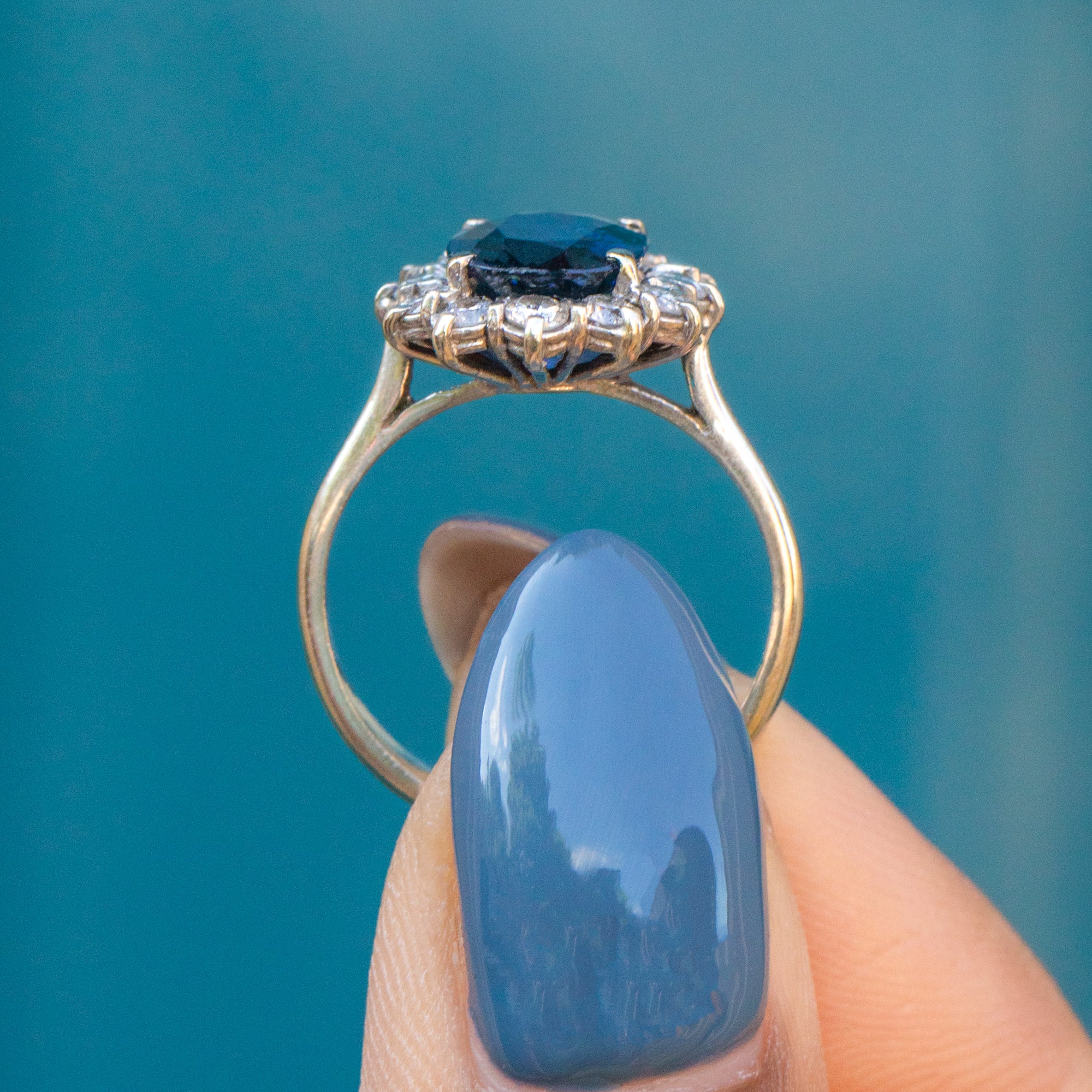 This stunning 18ct Gold natural Sapphire Diamond cluster ring will make a welcome addition to your collection. Boasting an impressive 1.40ct royal blue natural Sapphire encased by twelve twinkling earth-mined Diamonds, she would make a breathtaking choice to pop the all-important question with!