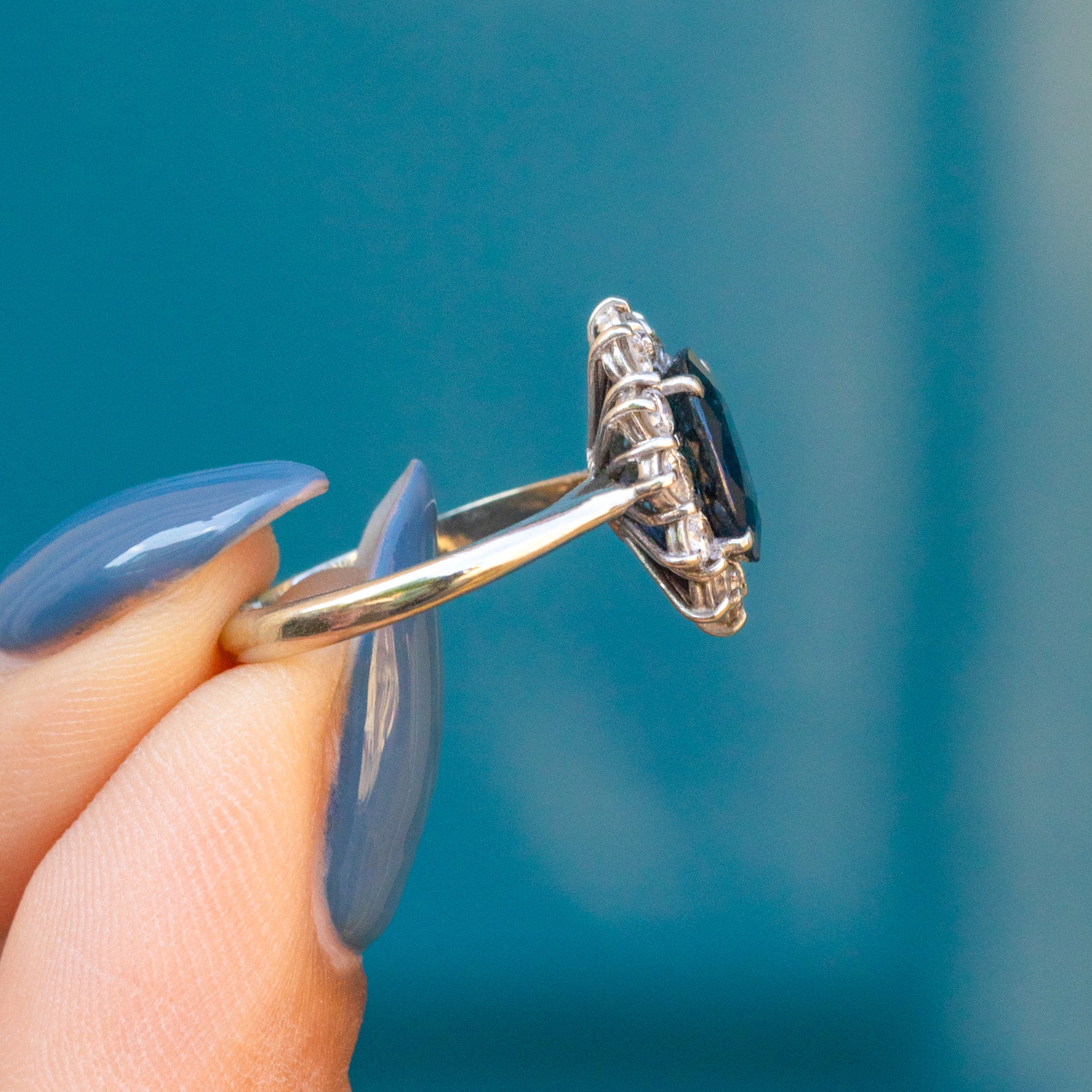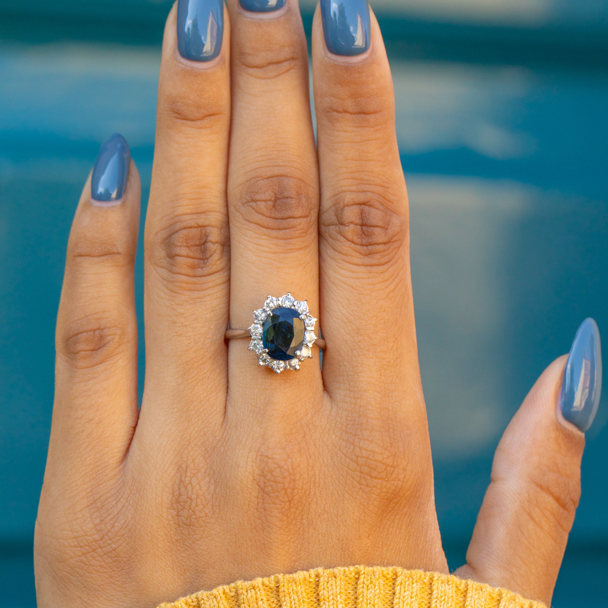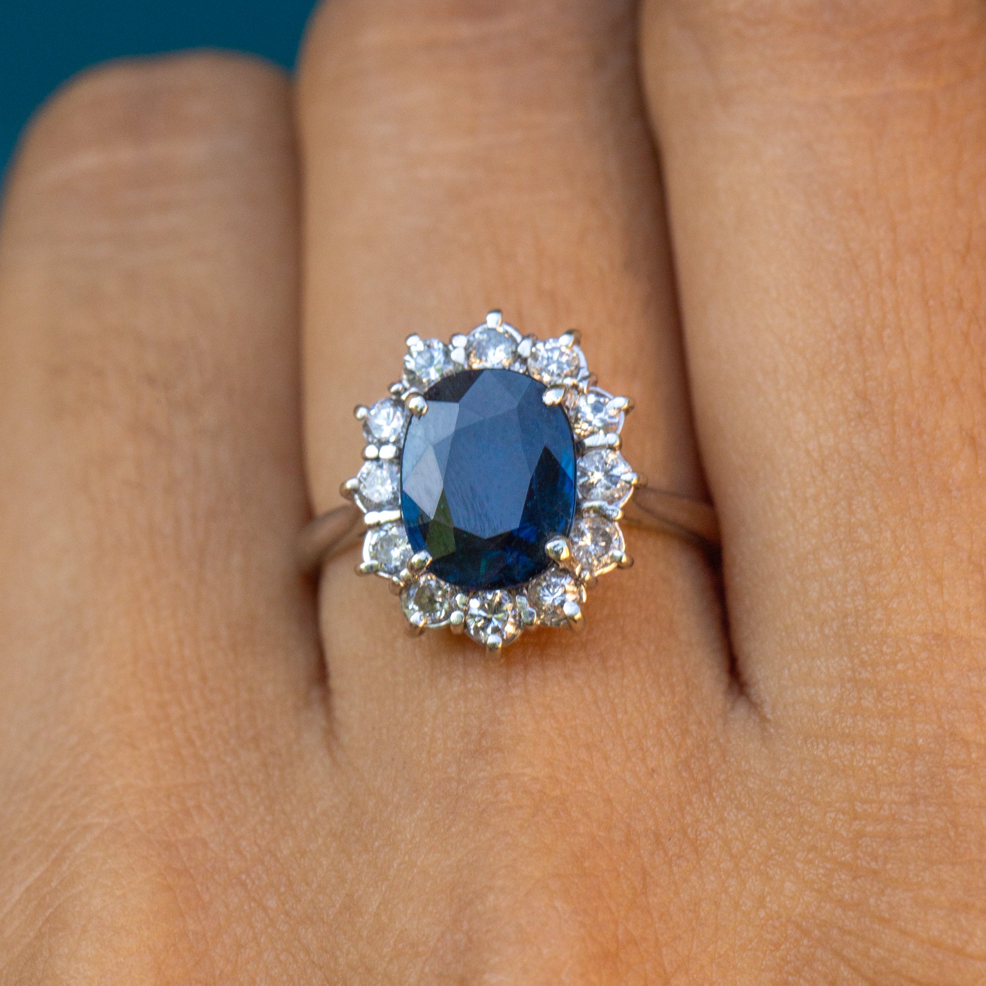 This stunning 18ct Gold natural Sapphire Diamond cluster ring will make a welcome addition to your collection. Boasting an impressive 1.40ct royal blue natural Sapphire encased by twelve twinkling earth-mined Diamonds, she would make a breathtaking choice to pop the all-important question with!