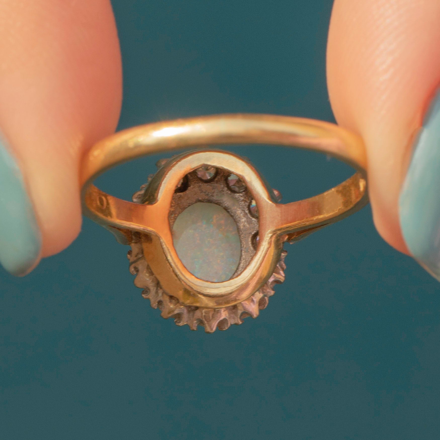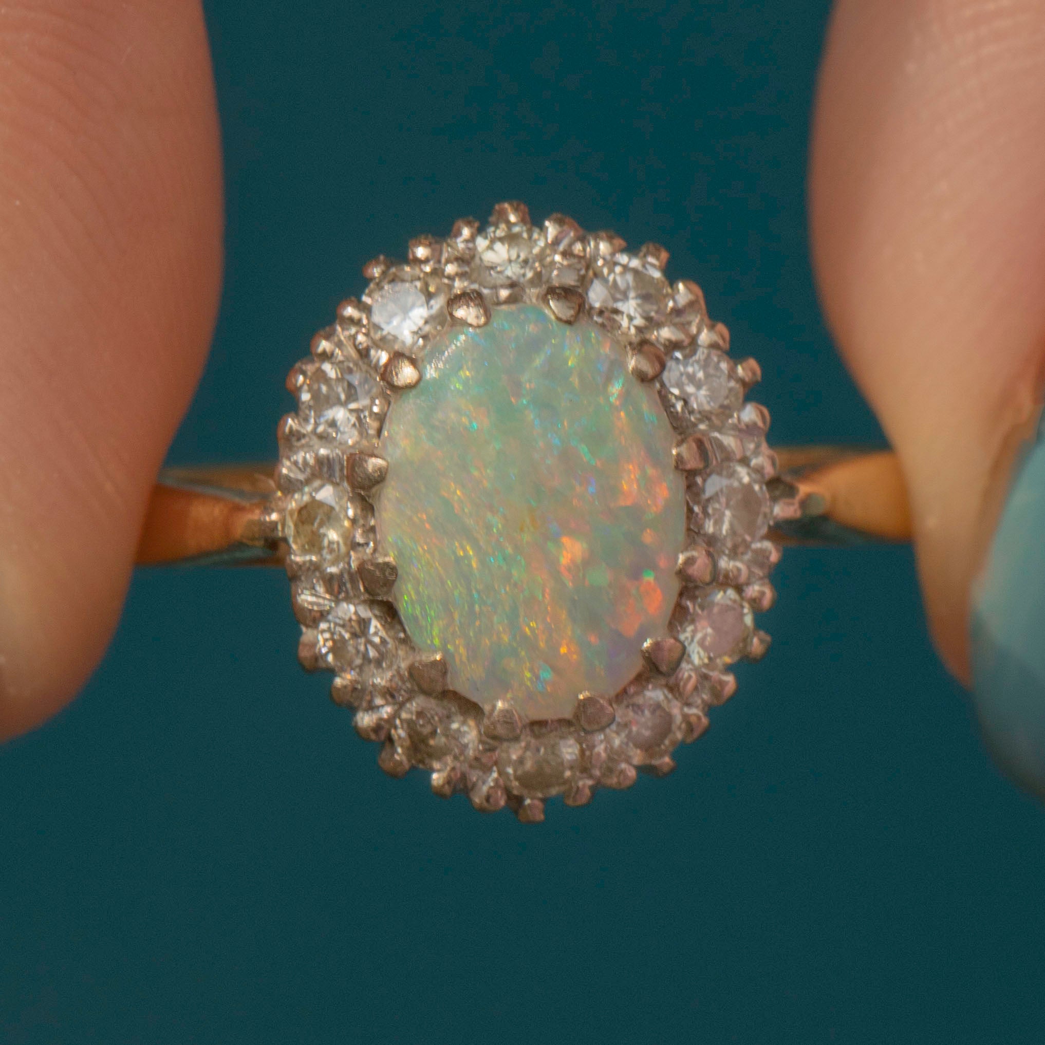 Haloed by twelve twinkling Diamonds, she emanates radiant beauty from every angle. Poised atop a slender, buttery 18ct Gold band this vintage Opal ring is the definition of luxury, she will exude opulence from your finger for years to come!
