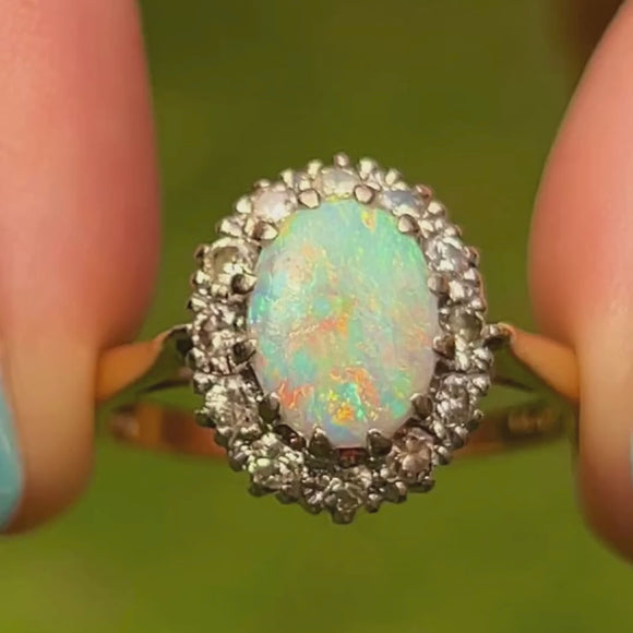 EXCELLENT. This 18ct Gold Opal Diamond cluster ring is in excellent condition. Her milky Opal is set securely in her claw settings, without any scuffs or dings to the surface. Her twelve haloing Diamonds are all present, securely set and free from chips or fleabites. The rich 18ct Gold band is in wonderful condition and has kept her saturated tone well over the years. This vintage treasure will become your newest obsession!