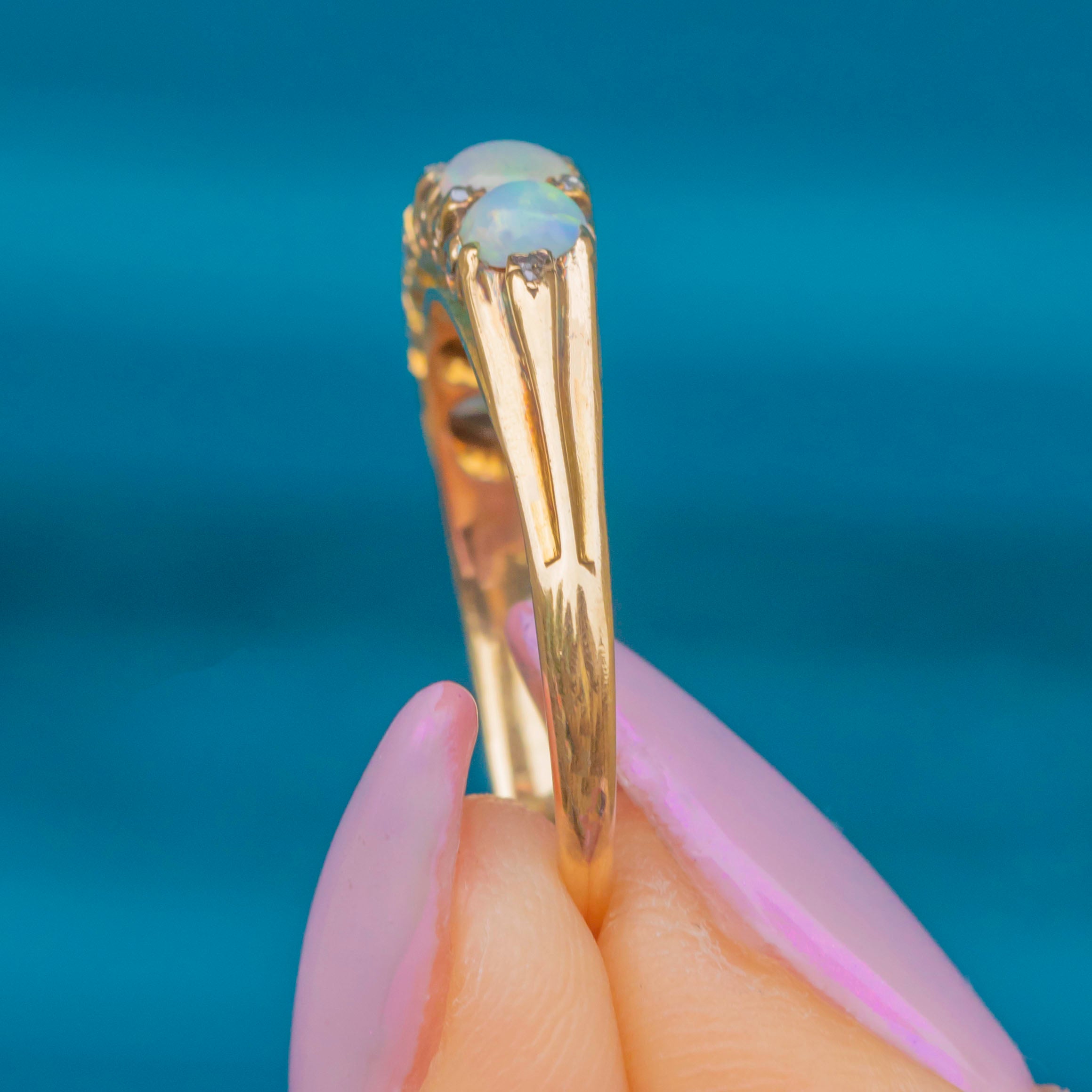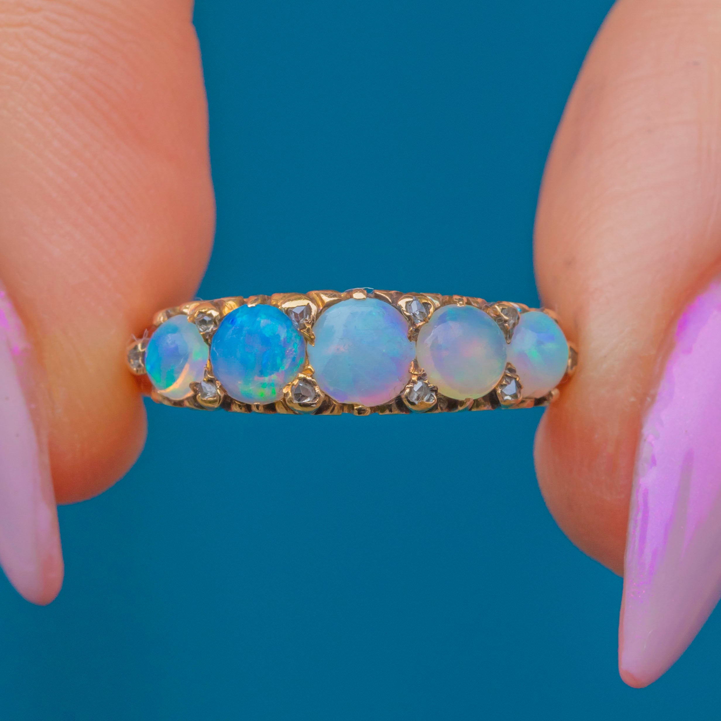 A captivating late Victorian five-stone ring set with glowing Opals that dance with flashes of green, blue and orange. Between each Opal are tiny Rose-cut Diamond spacers that add a delicate twinkle and highlight the play of colour beautifully.