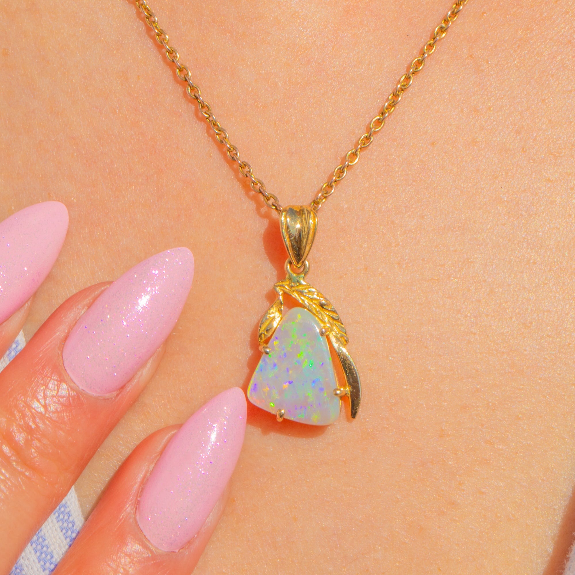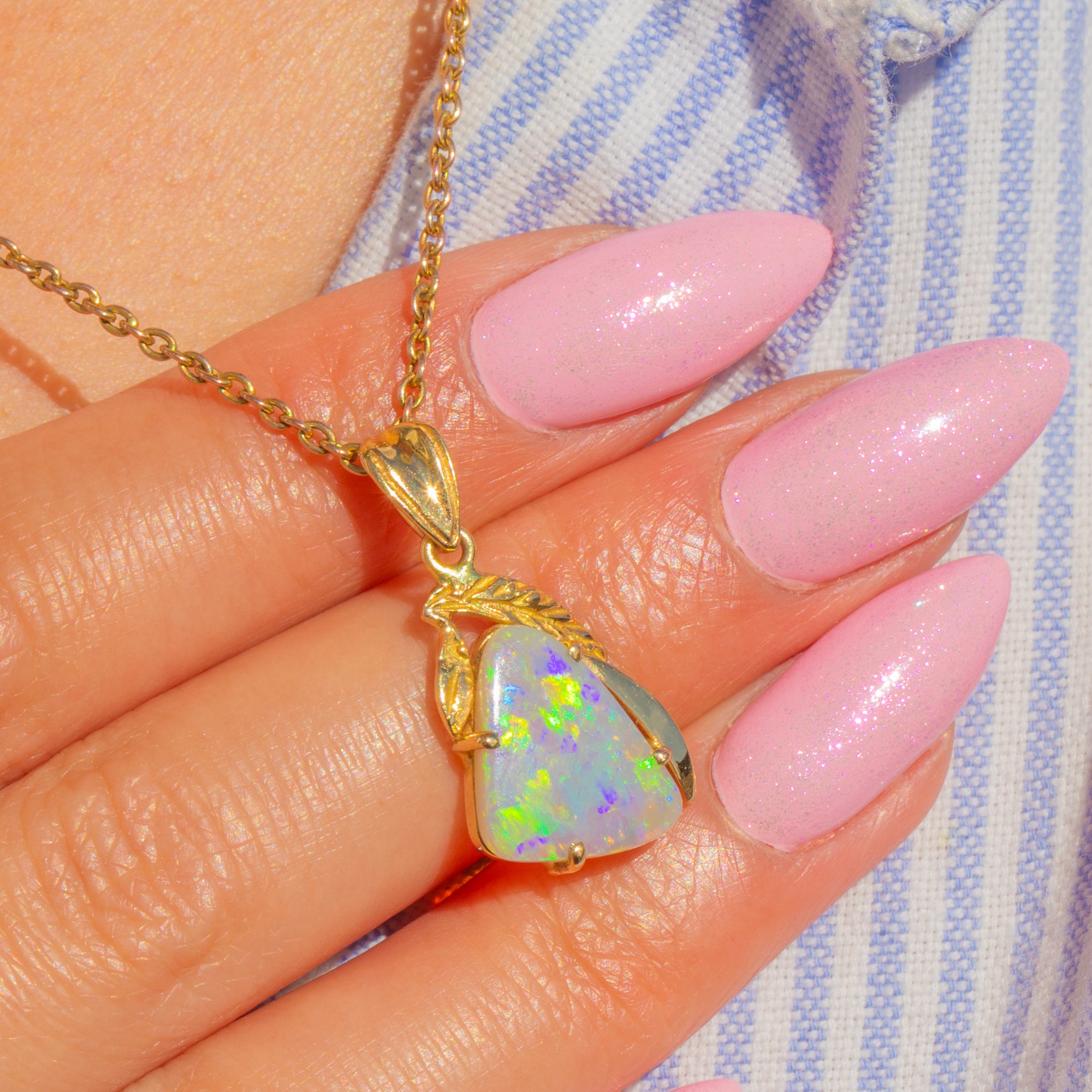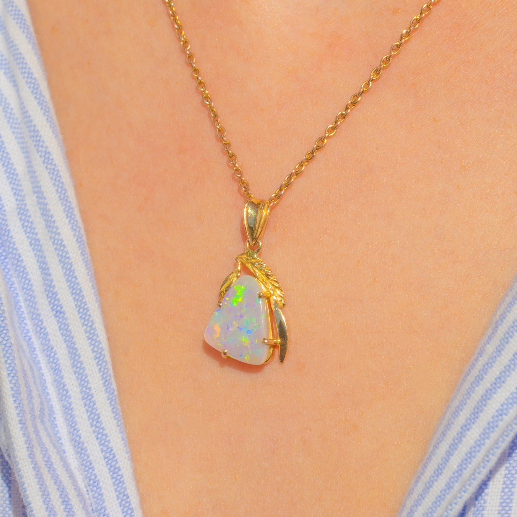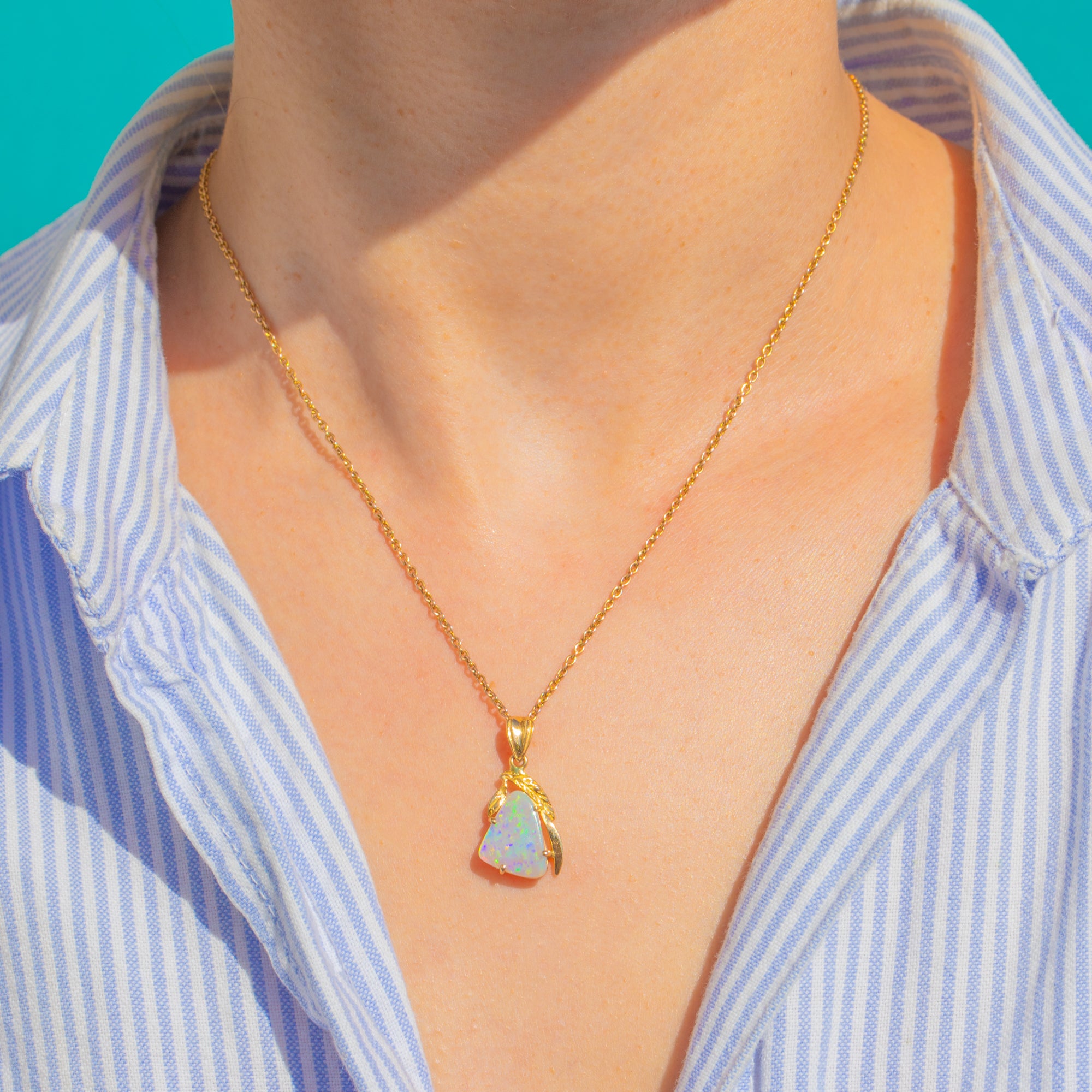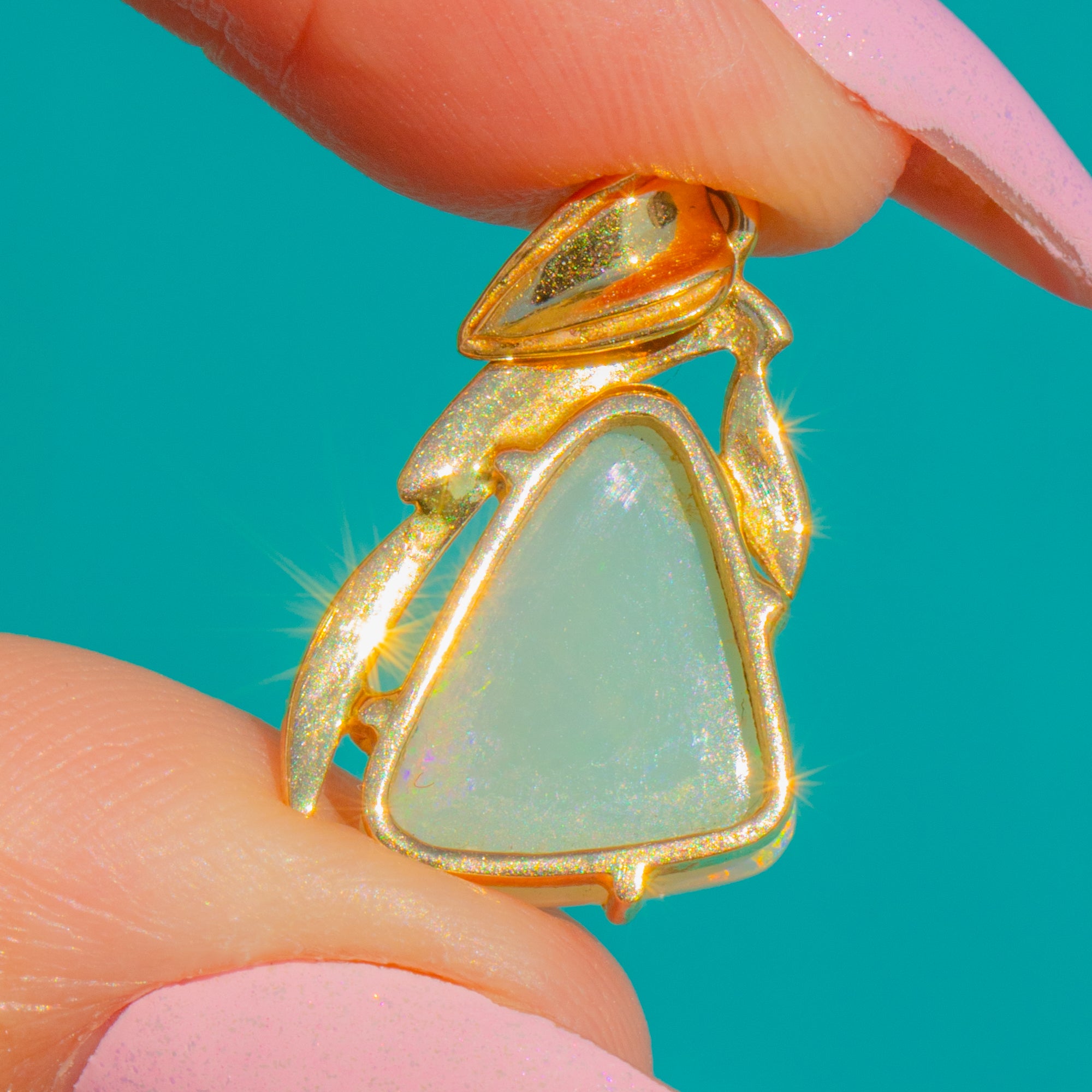 Glowing with ethereal colour, this Vintage 18ct Gold Opal pendant captures the romance of nature in a delicate, sculptural form. The freeform triangular Opal cabochon shimmers with vibrant greens and blues, lit with playful flashes of orange and purple, set securely within a refined collet and neat prongs.
