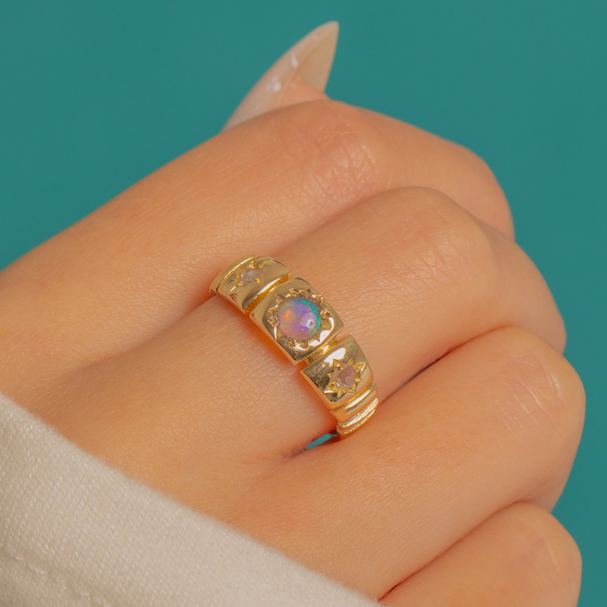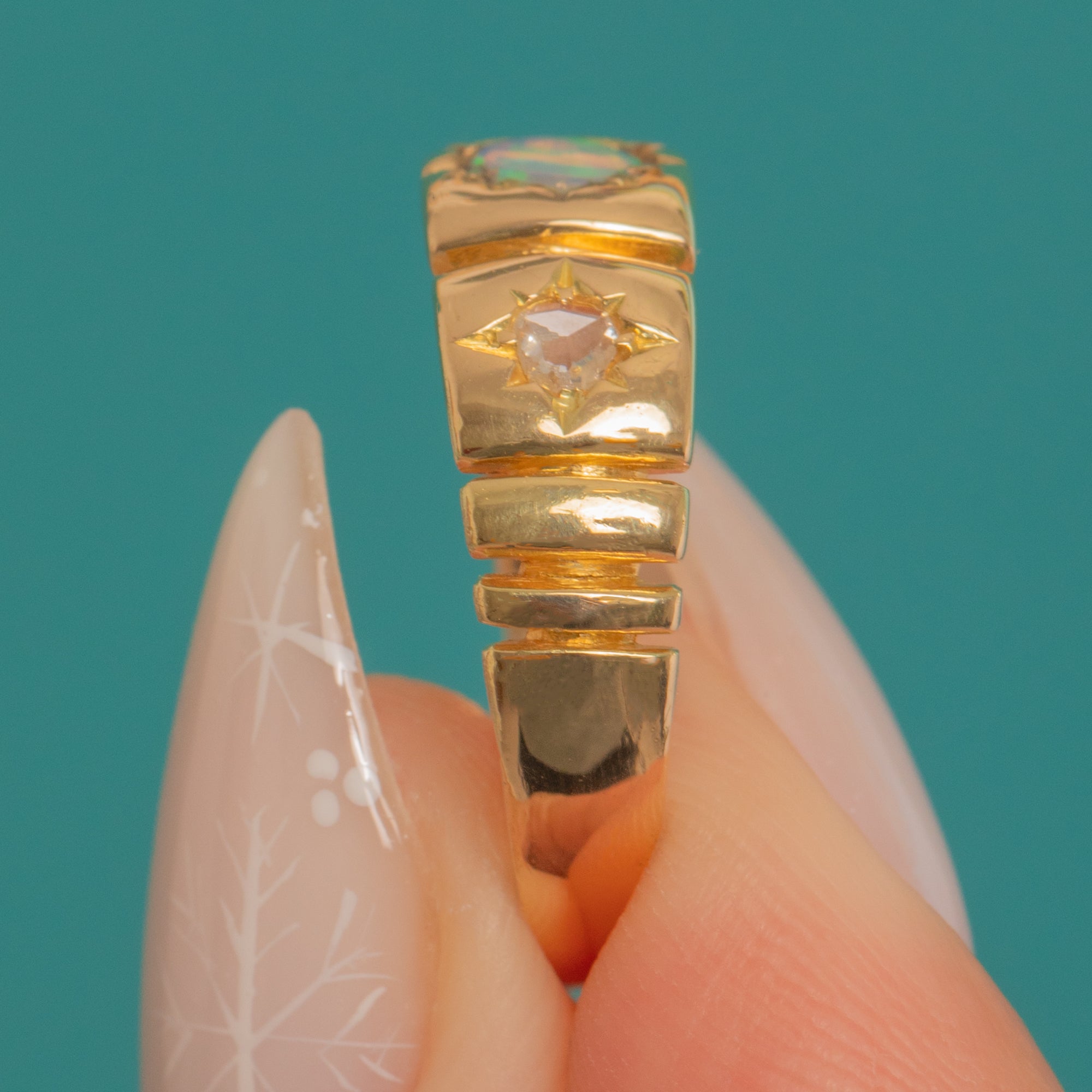18ct Gold Opal Rose-Cut Diamond Star-Set Gypsy Ring