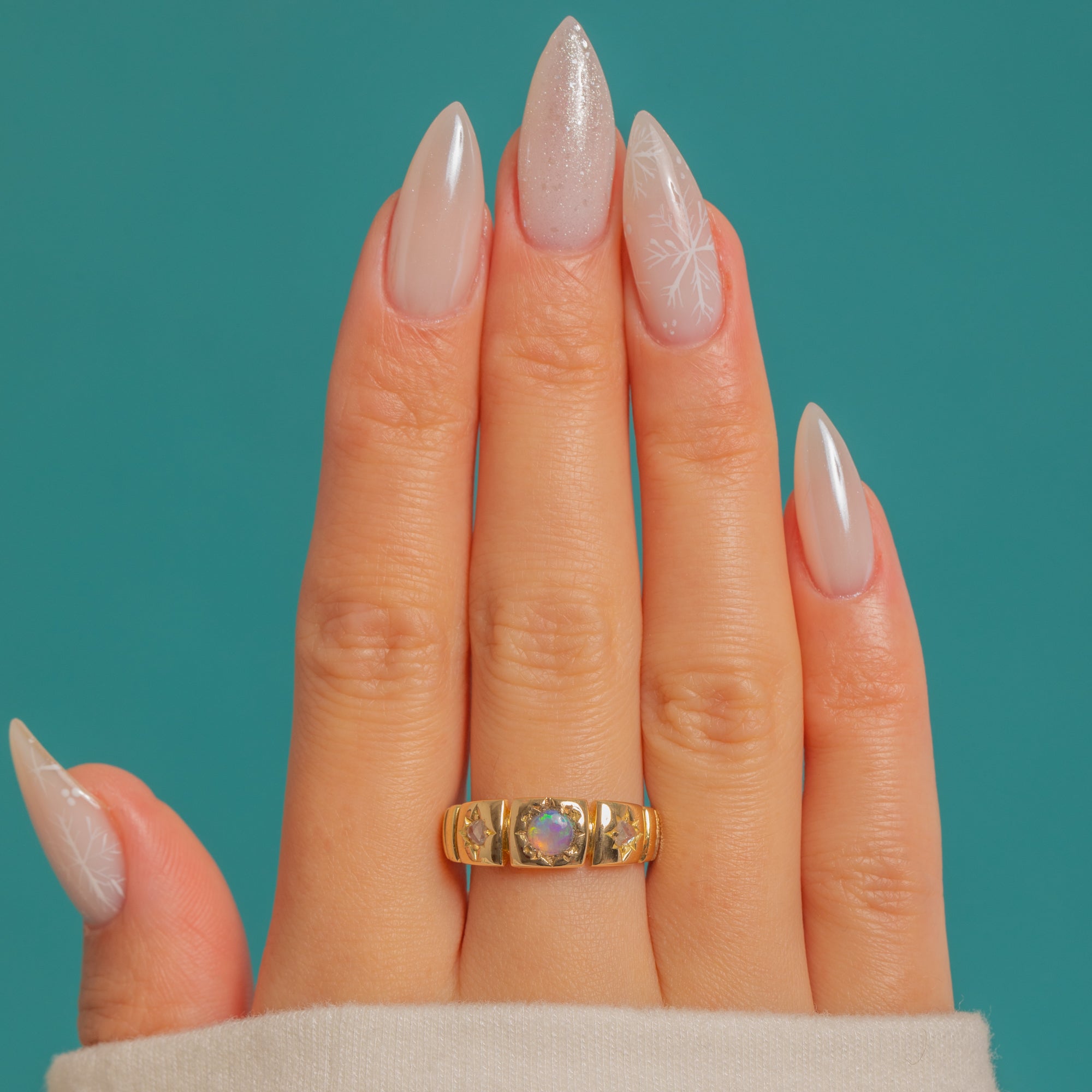 A celestial Victorian treasure, this 18ct Gold gypsy ring pairs a moody Opal cabochon with twinkling rose-cut Diamonds in classic star-settings. The round Opal shimmers with vivid pink and electric green when the light catches, flanked by two rose-cut accents that add antique sparkle and romance.