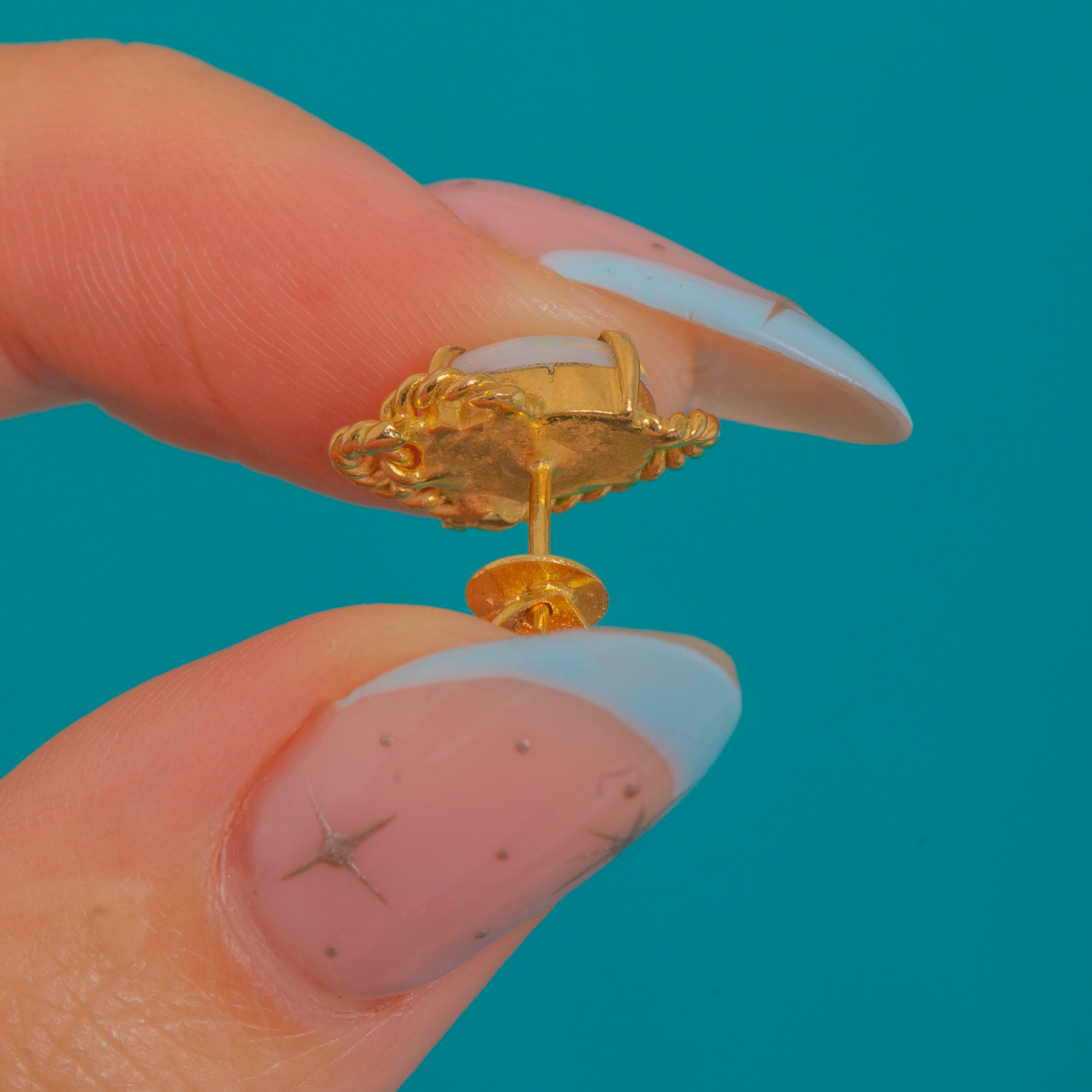 Joyful flashes of colour radiate from these Vintage Opal stud earrings, framed by a charming rope‑twist halo. Each natural, solid Opal displays vibrant play‑of‑colour—pops of red, orange, pink, green and blue—held securely in classic four‑claw mounts for a timeless, elegant look.