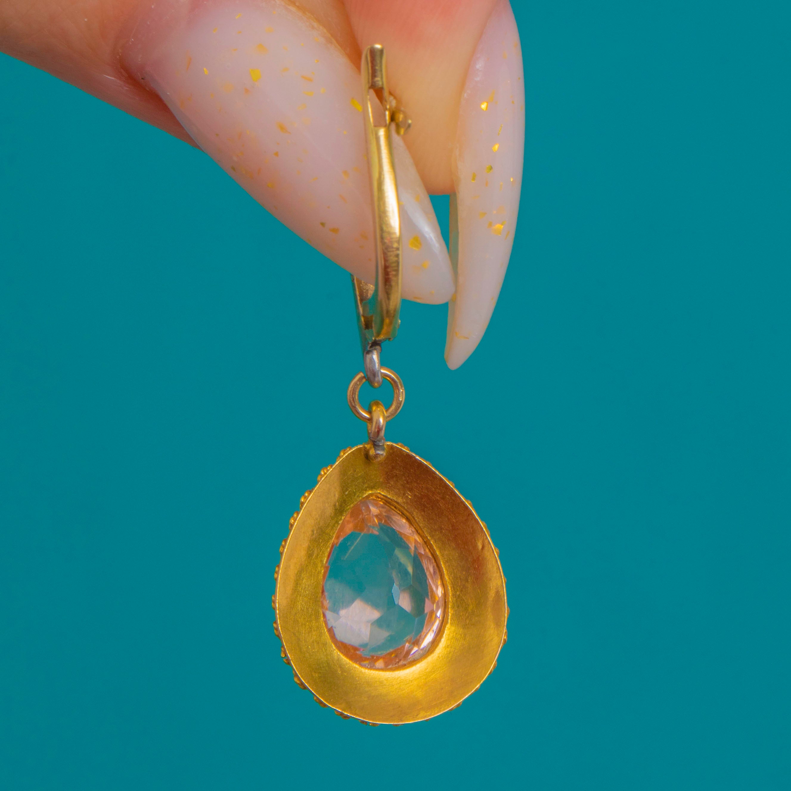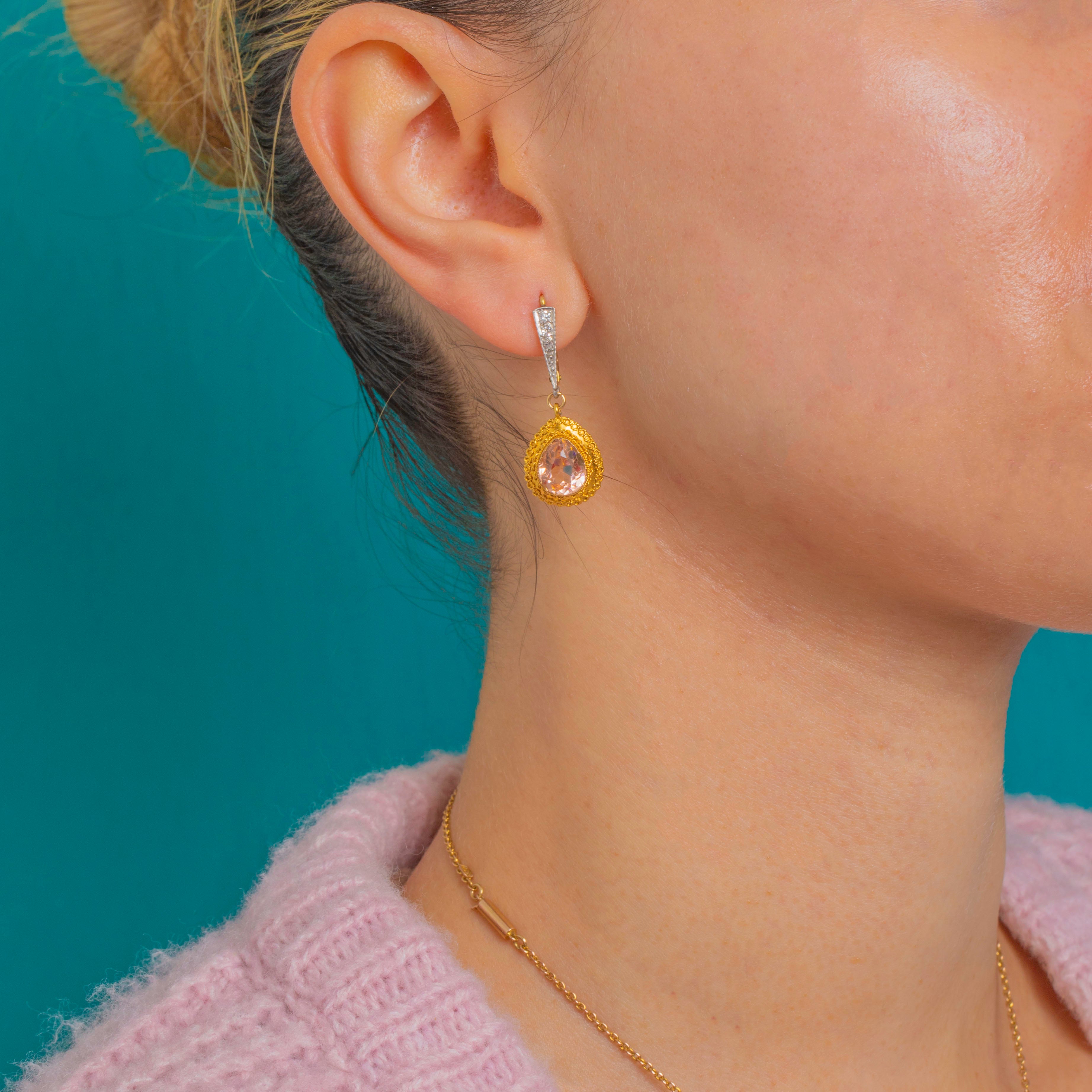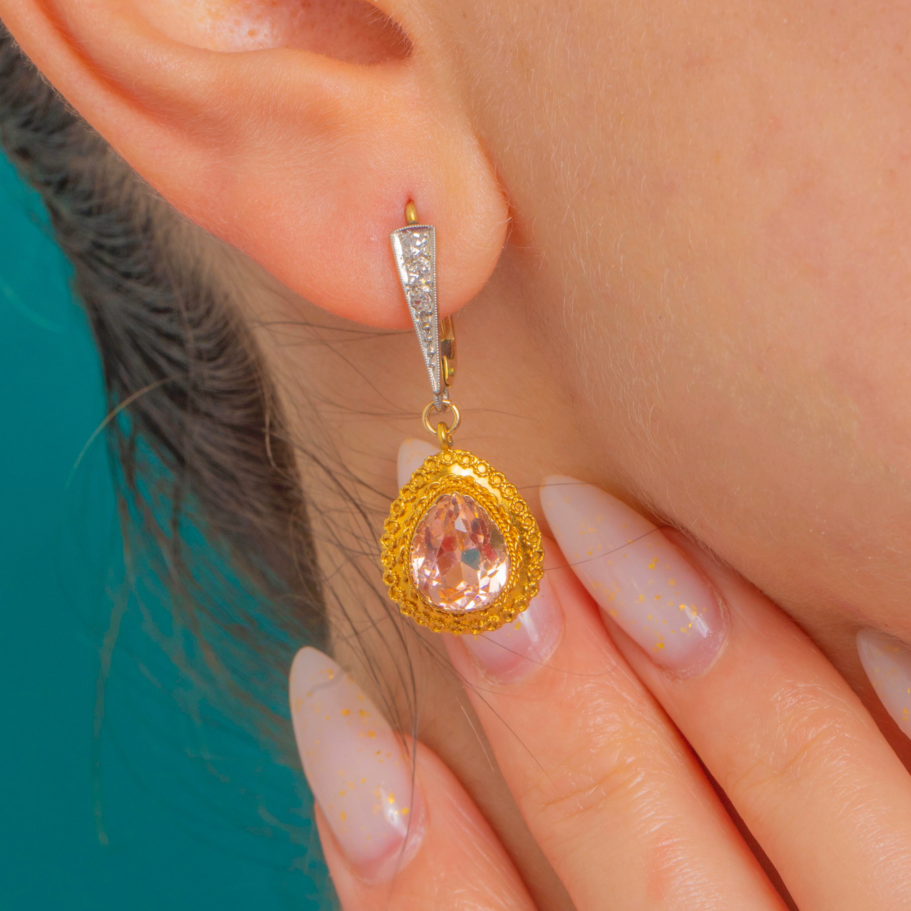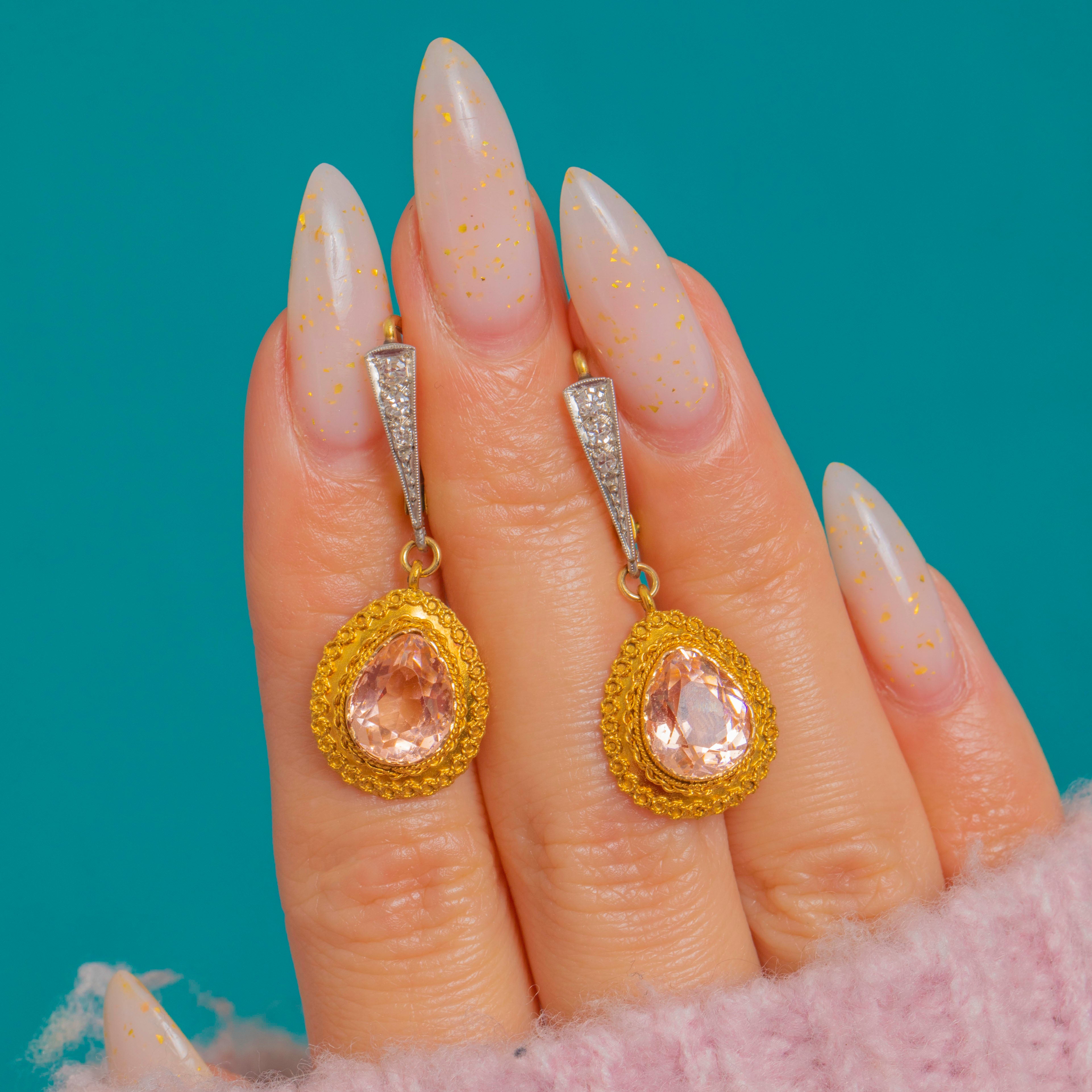 These exquisite Edwardian drop earrings marry soft Peach Tourmalines with sparkling Diamond-set tops for a look that feels both romantic and refined. Each pear-cut Tourmaline glows with a delicate pink-peach hue, framed in rich 18ct Gold, while the tapered tops are crafted in 15ct Gold and Platinum and studded with graduating Diamonds for a graceful lift of light.